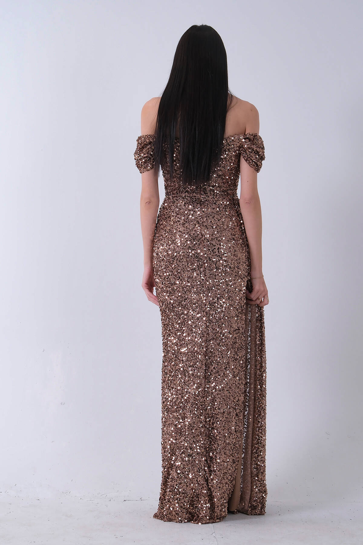 Bakır Kadın Omzu Açık Payetli Yırtmaçlı Uzun Abiye Elbise 9705544.231
