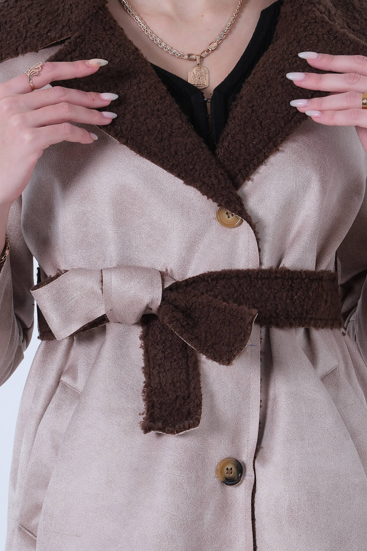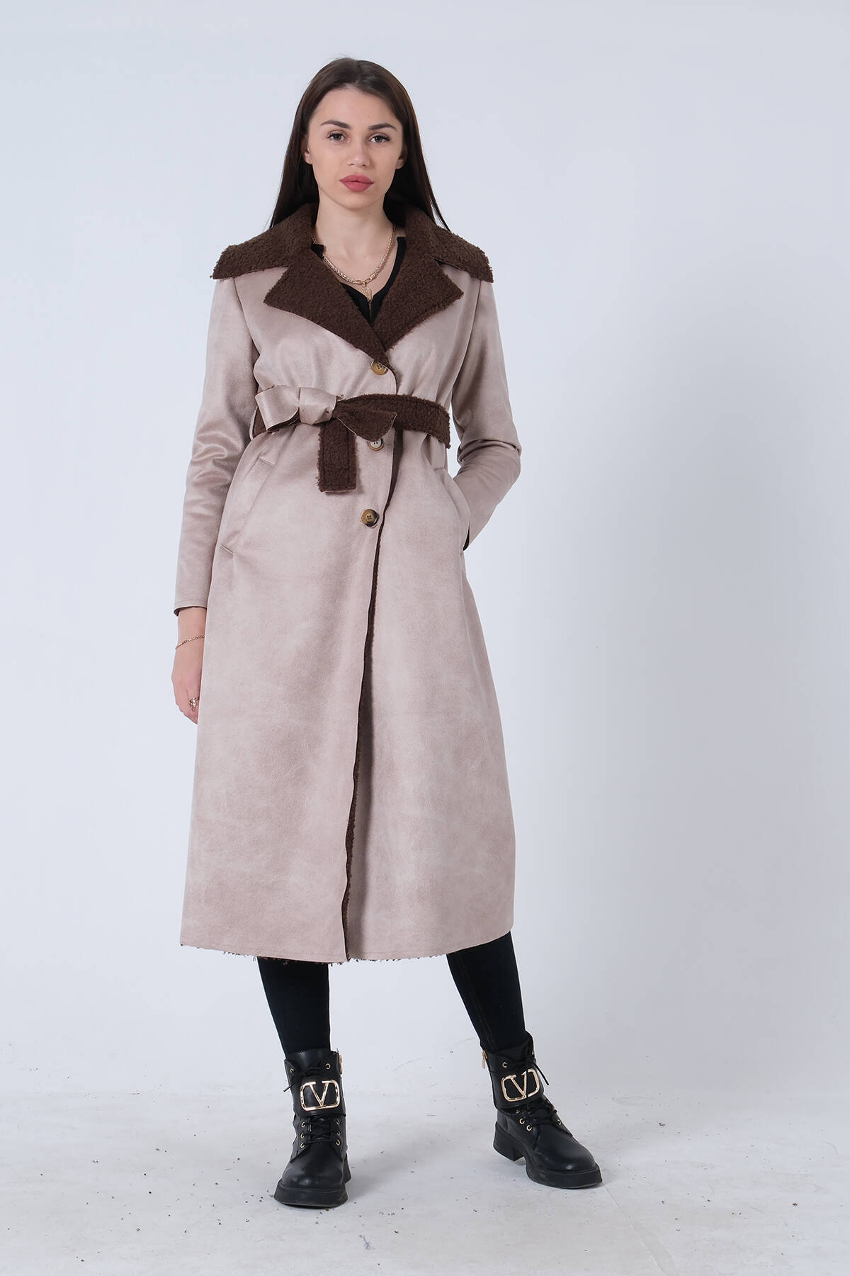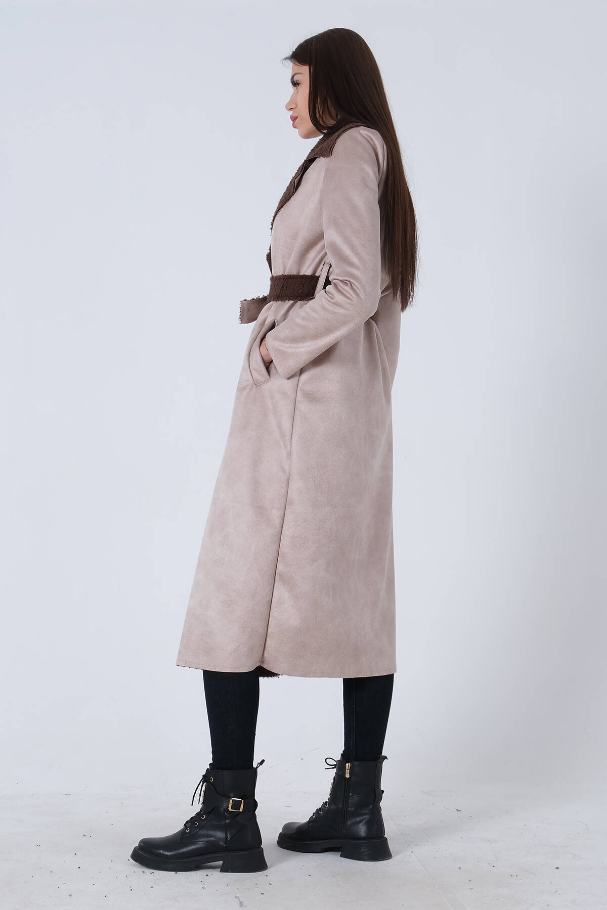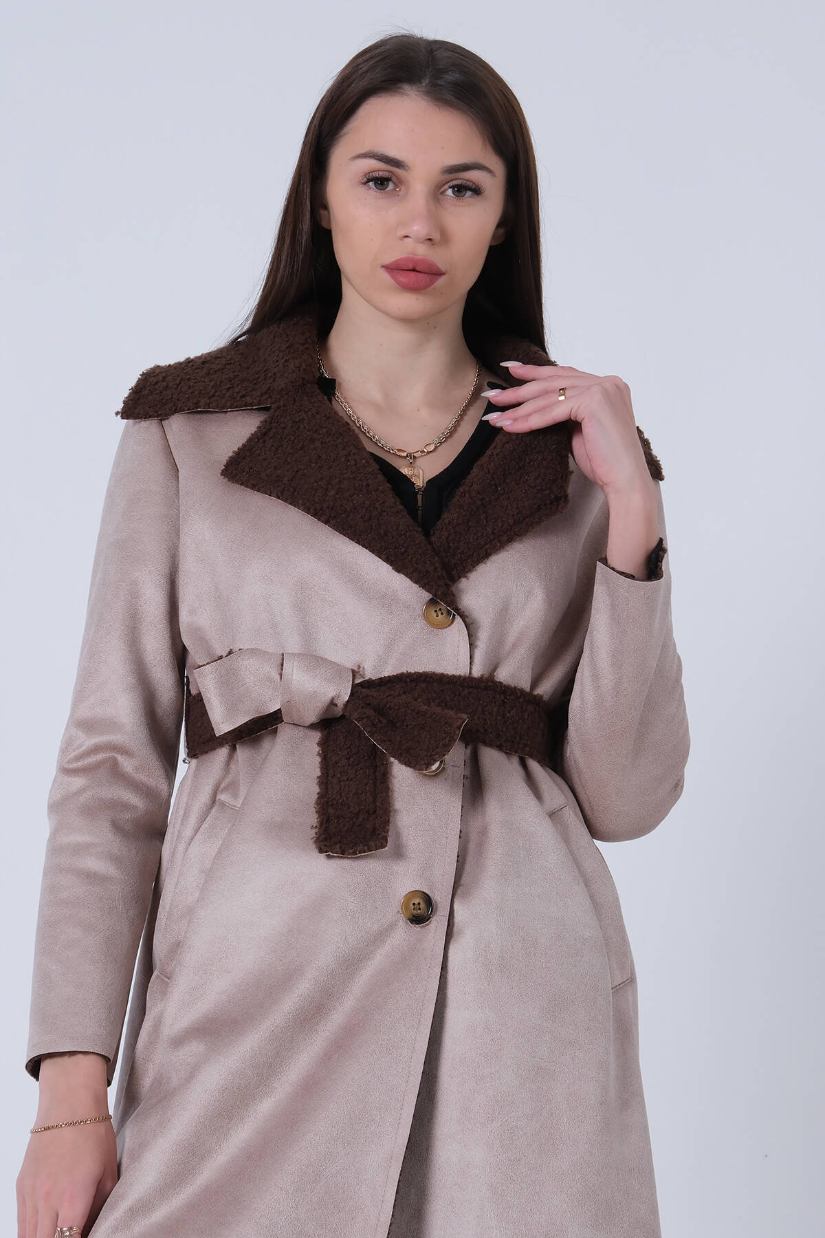 Bej Süet Düğmeli Seyyar Kemerli Kaban 0108087.55