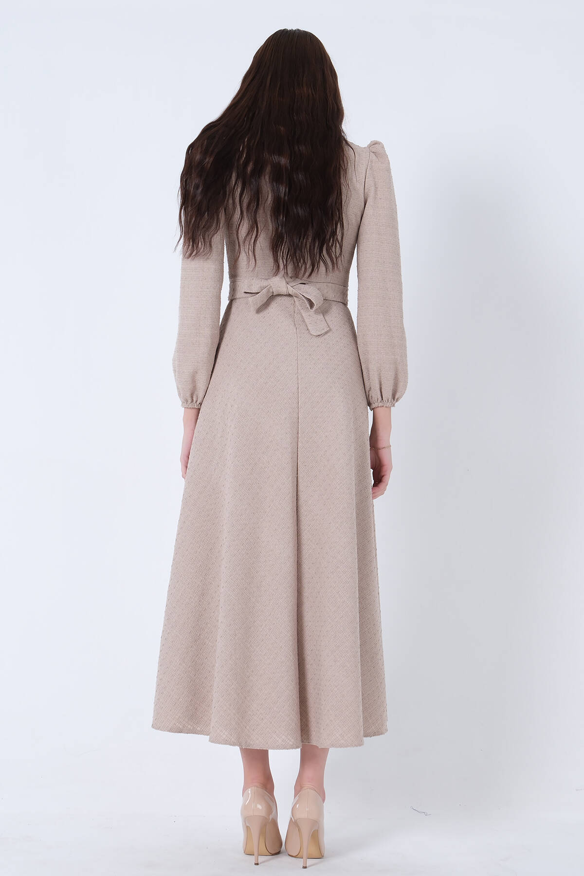 Bej Bisiklet Yaka Kendinden Şal Detaylı Broşlu Bel Bağlamalı Elbise 4571580.55
