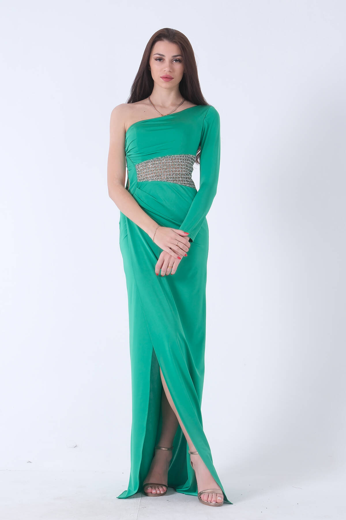 Tek Kol Bel Dekolteli Taş Detaylı Yırtmaçlı Balık Abiye
