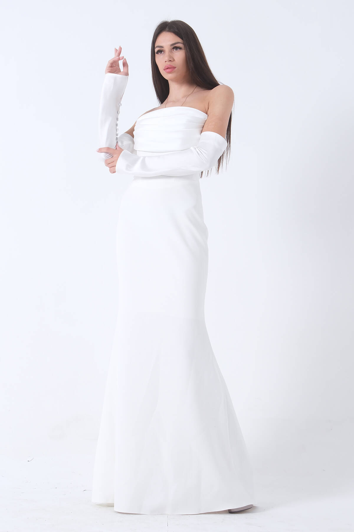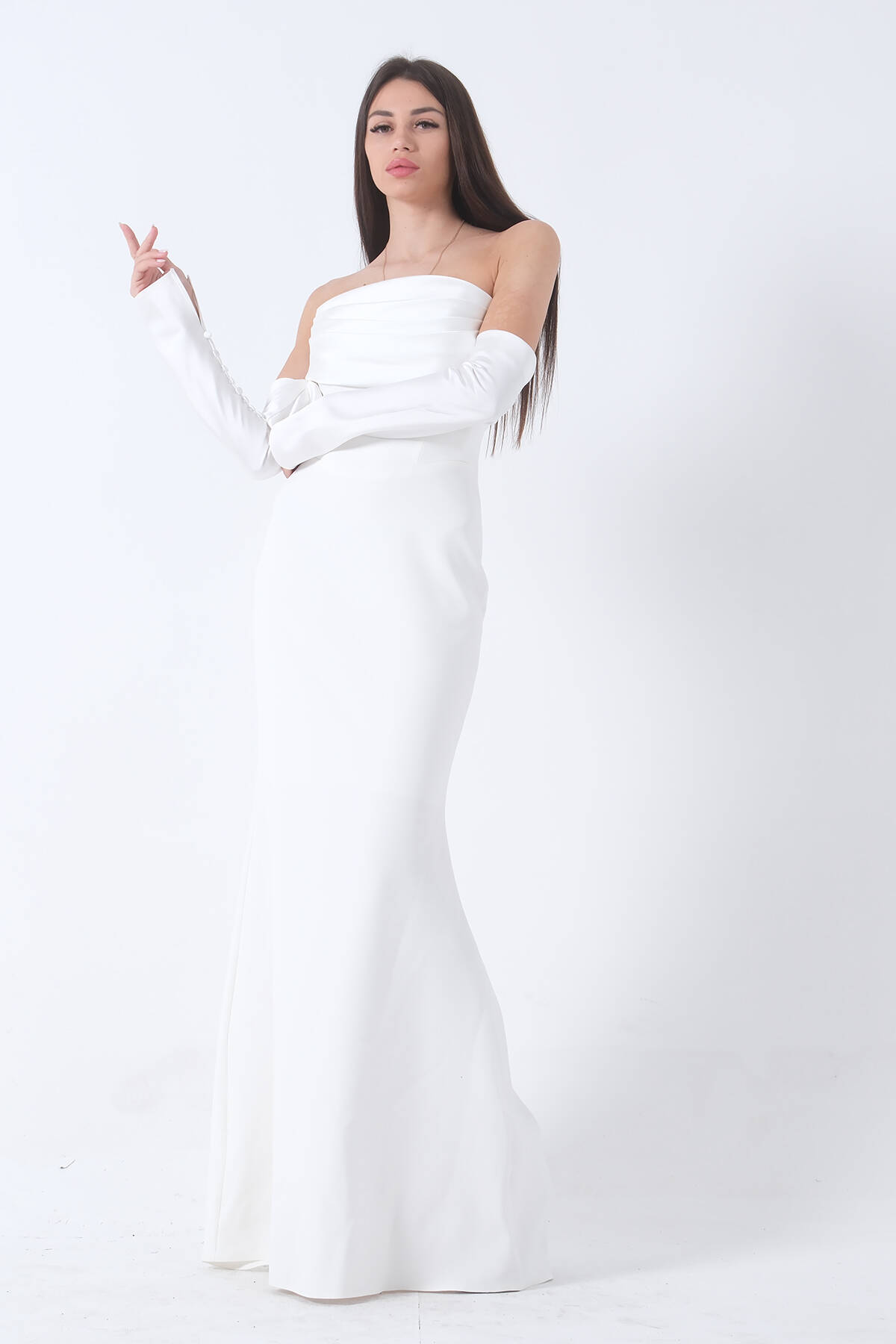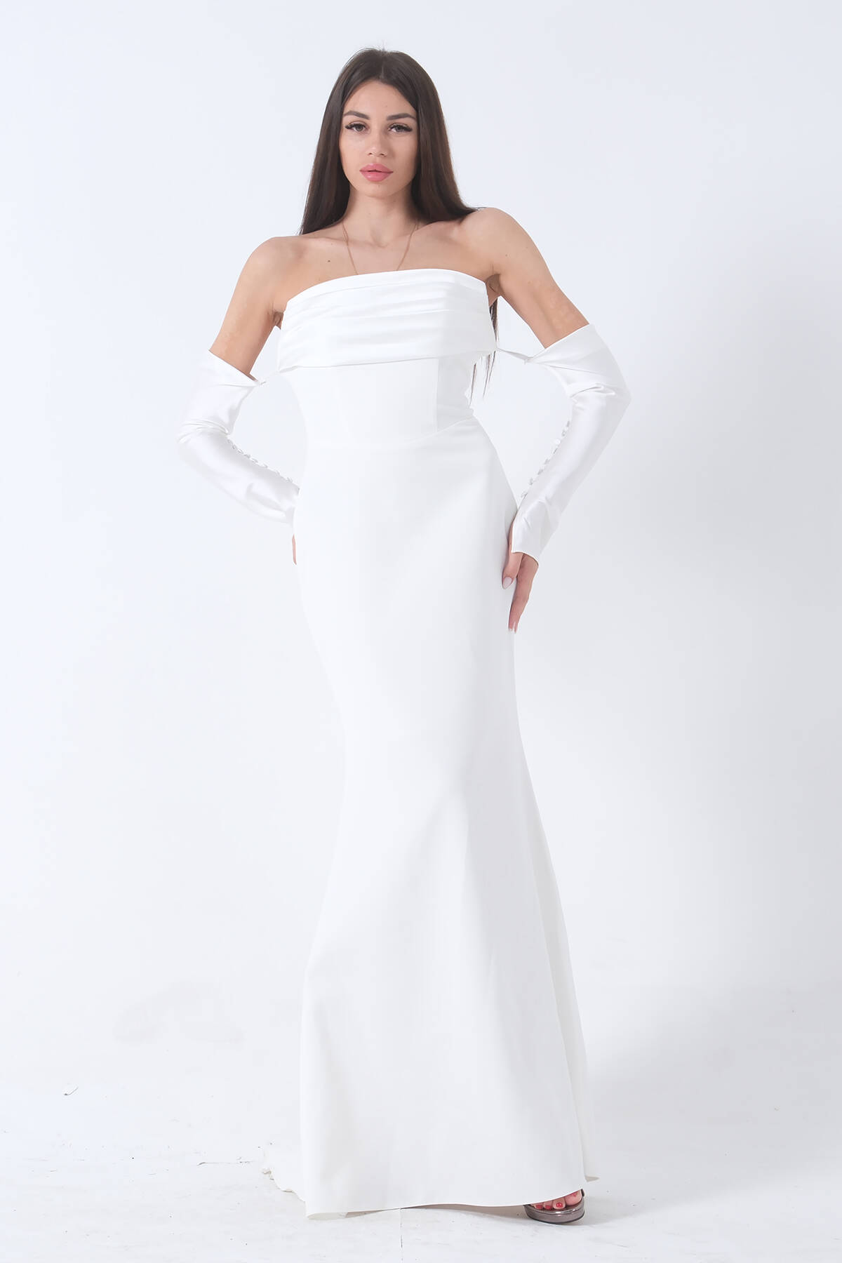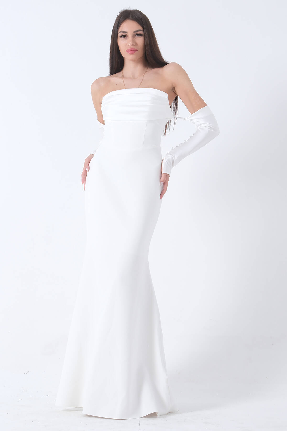 Beyaz Drapeli Düğme Detaylı Uzun Abiye 9705361.15