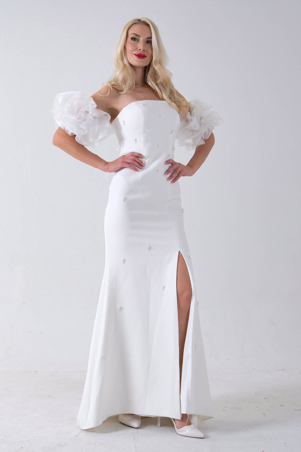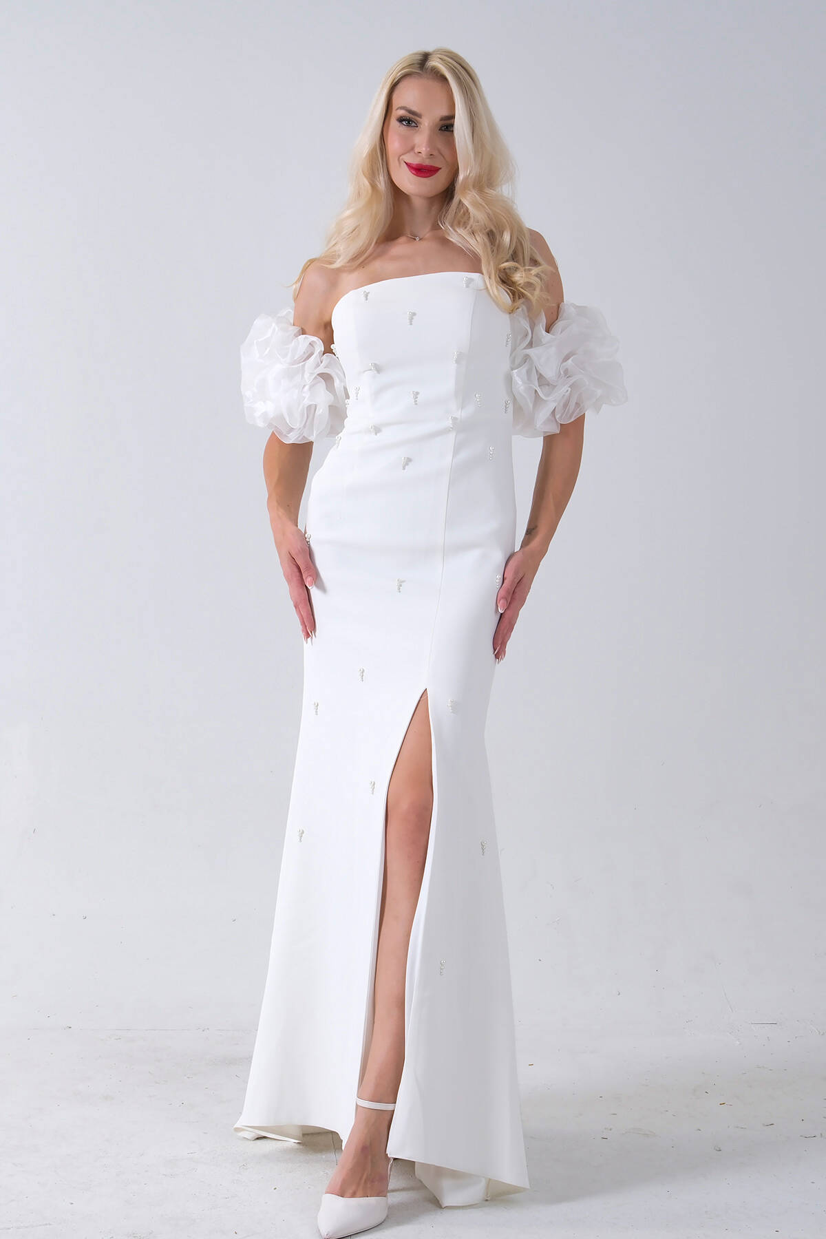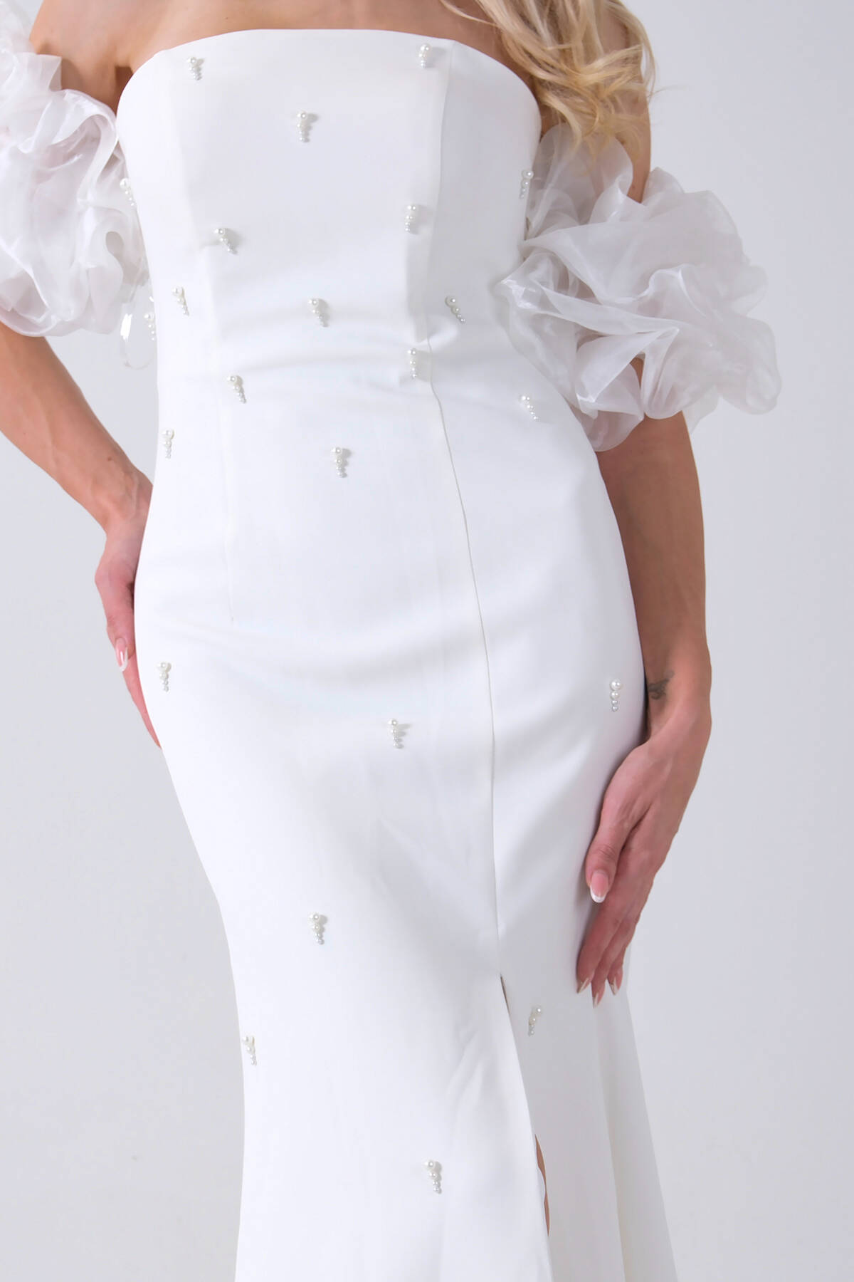 Beyaz İnci İşlemeli Balon Kol Straplez Abiye Elbise 0801011.15