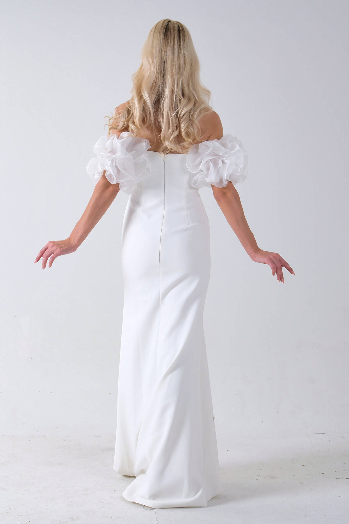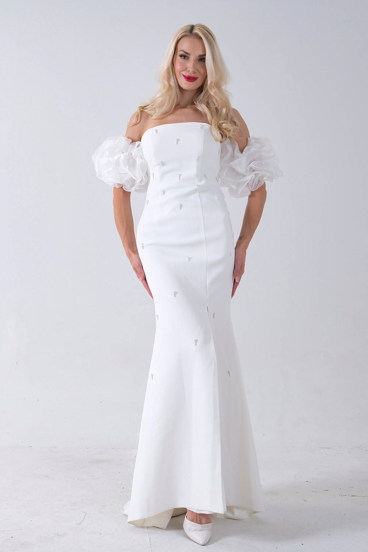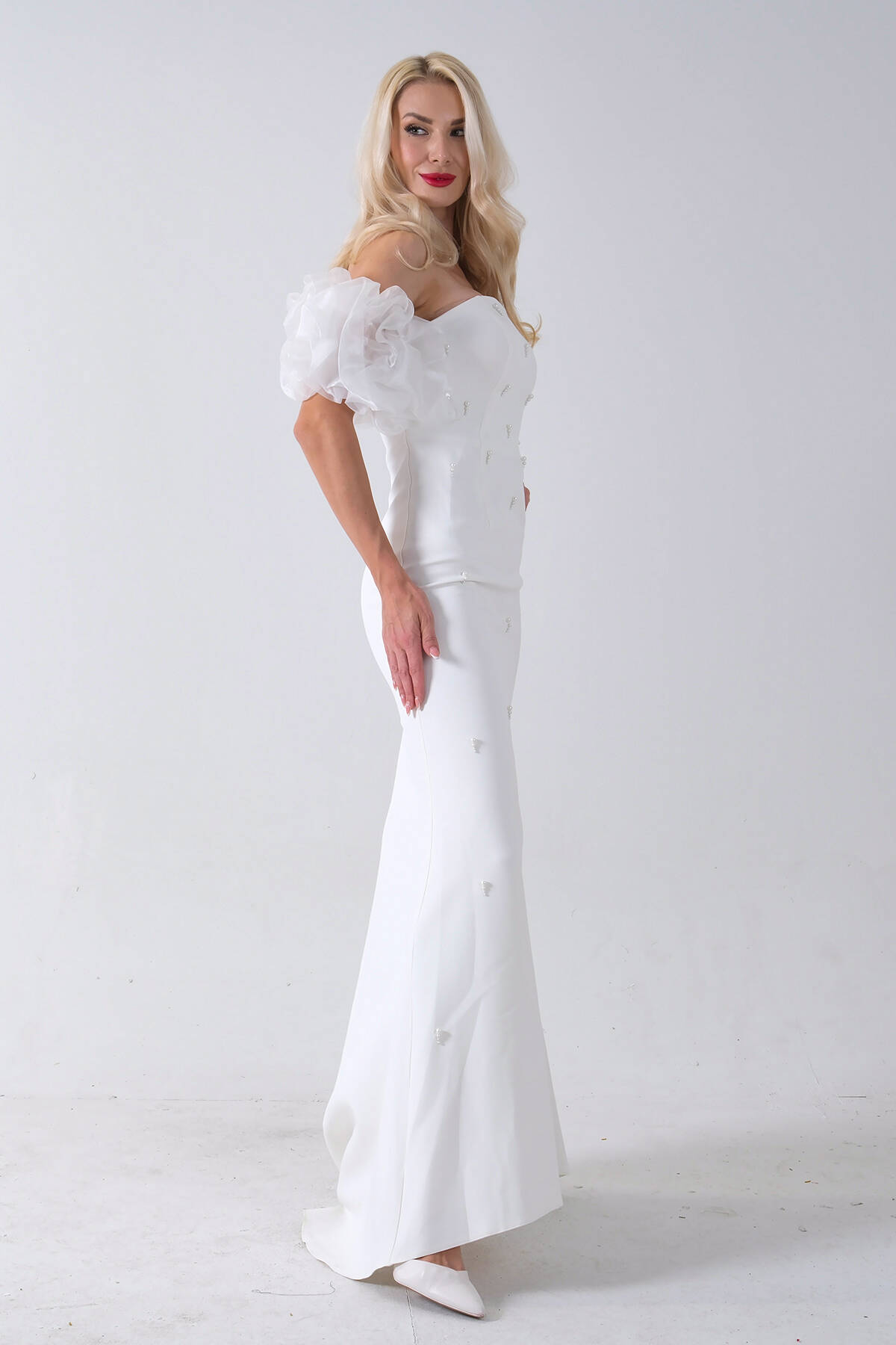 Beyaz İnci İşlemeli Balon Kol Straplez Abiye Elbise 0801011.15
