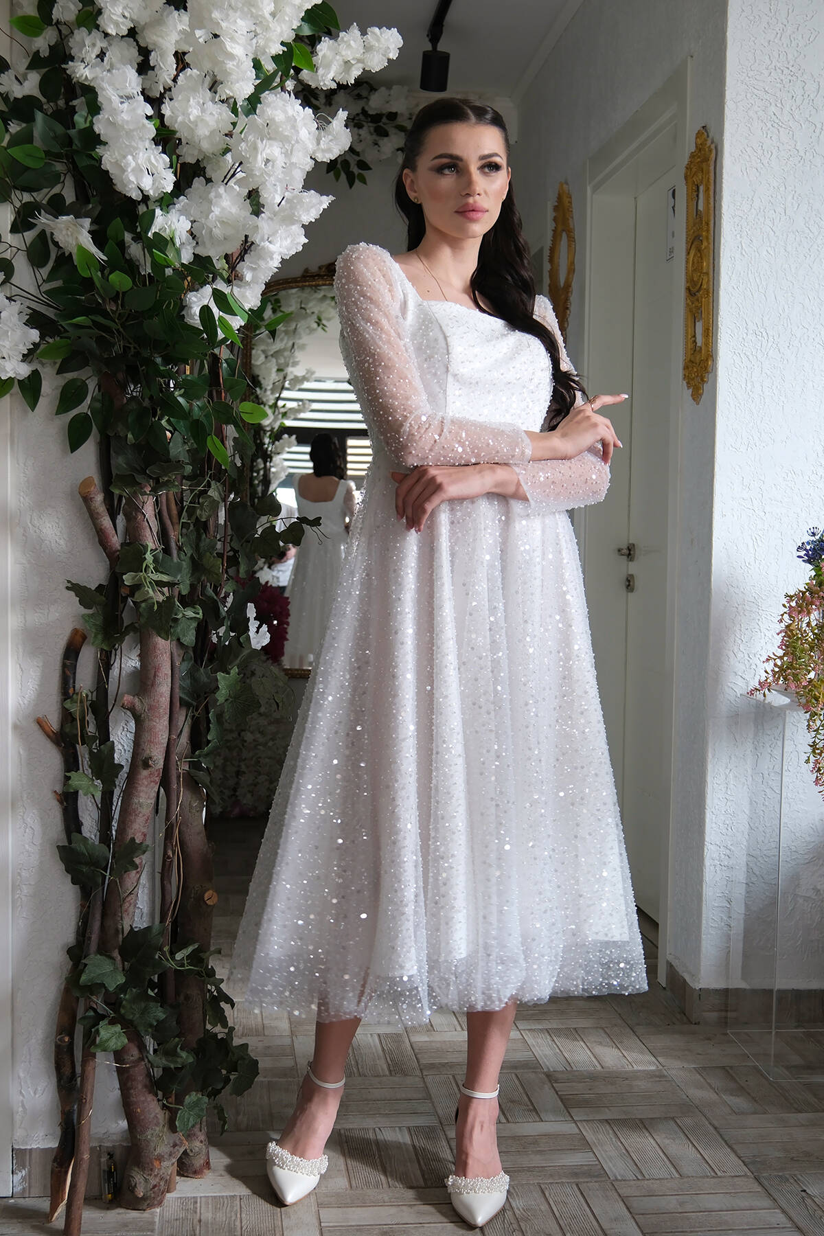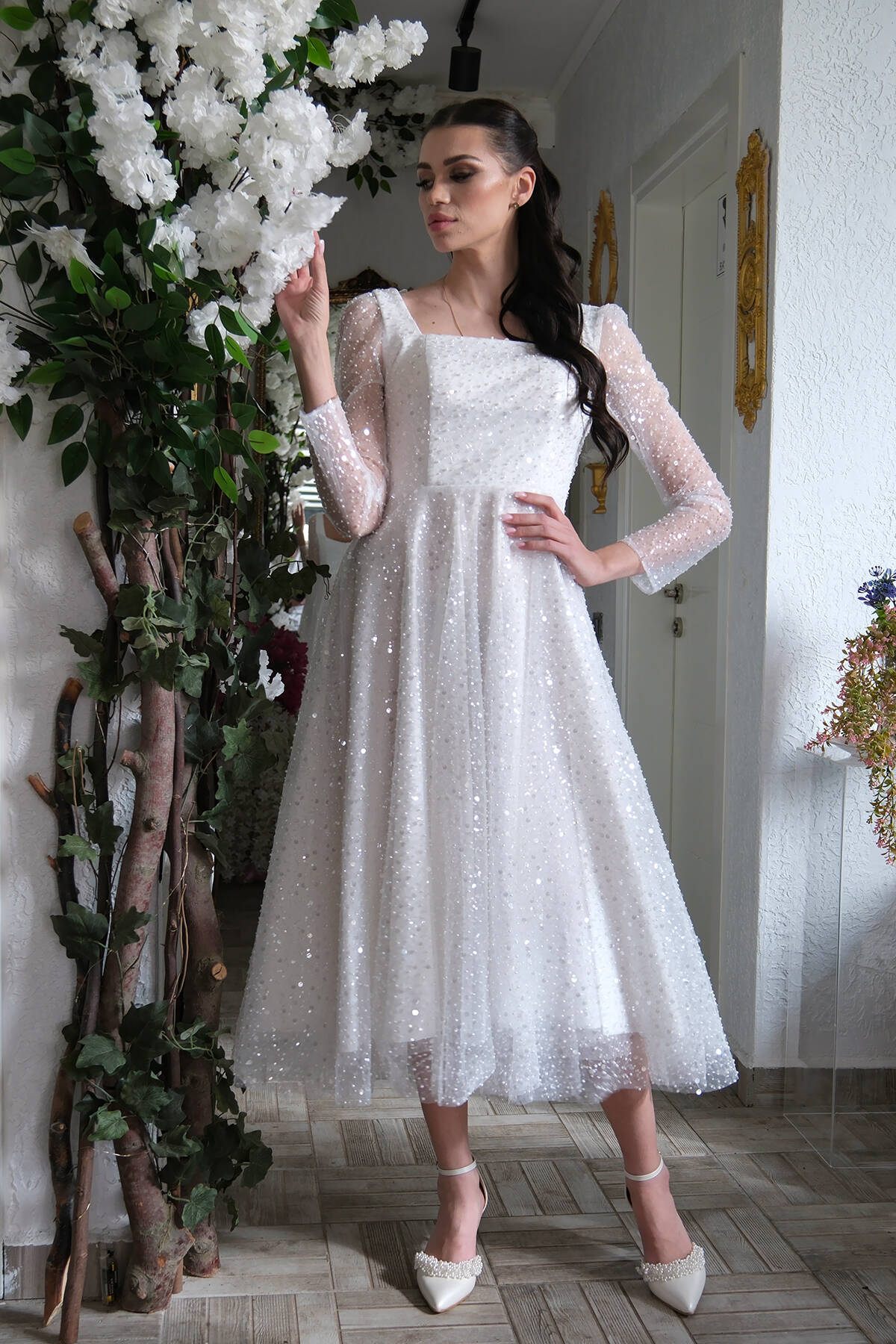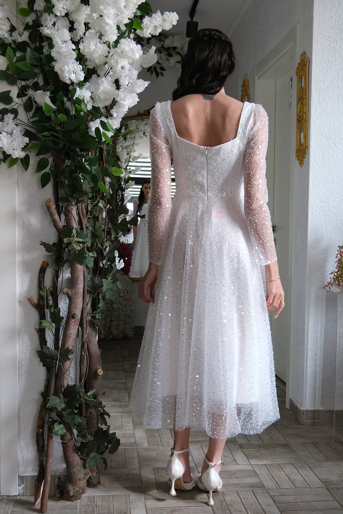 Beyaz Kare Yaka Pul Payetli Midi Boy Abiye 6502491.15