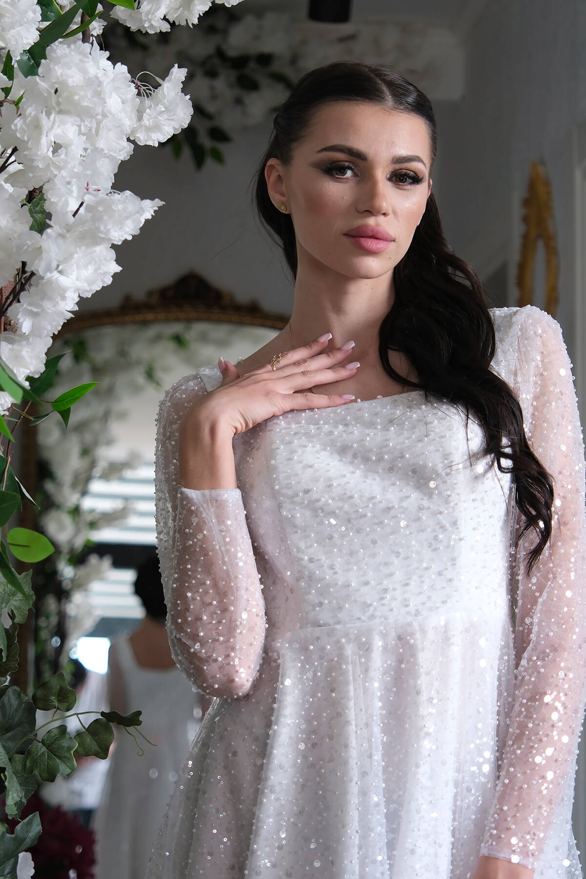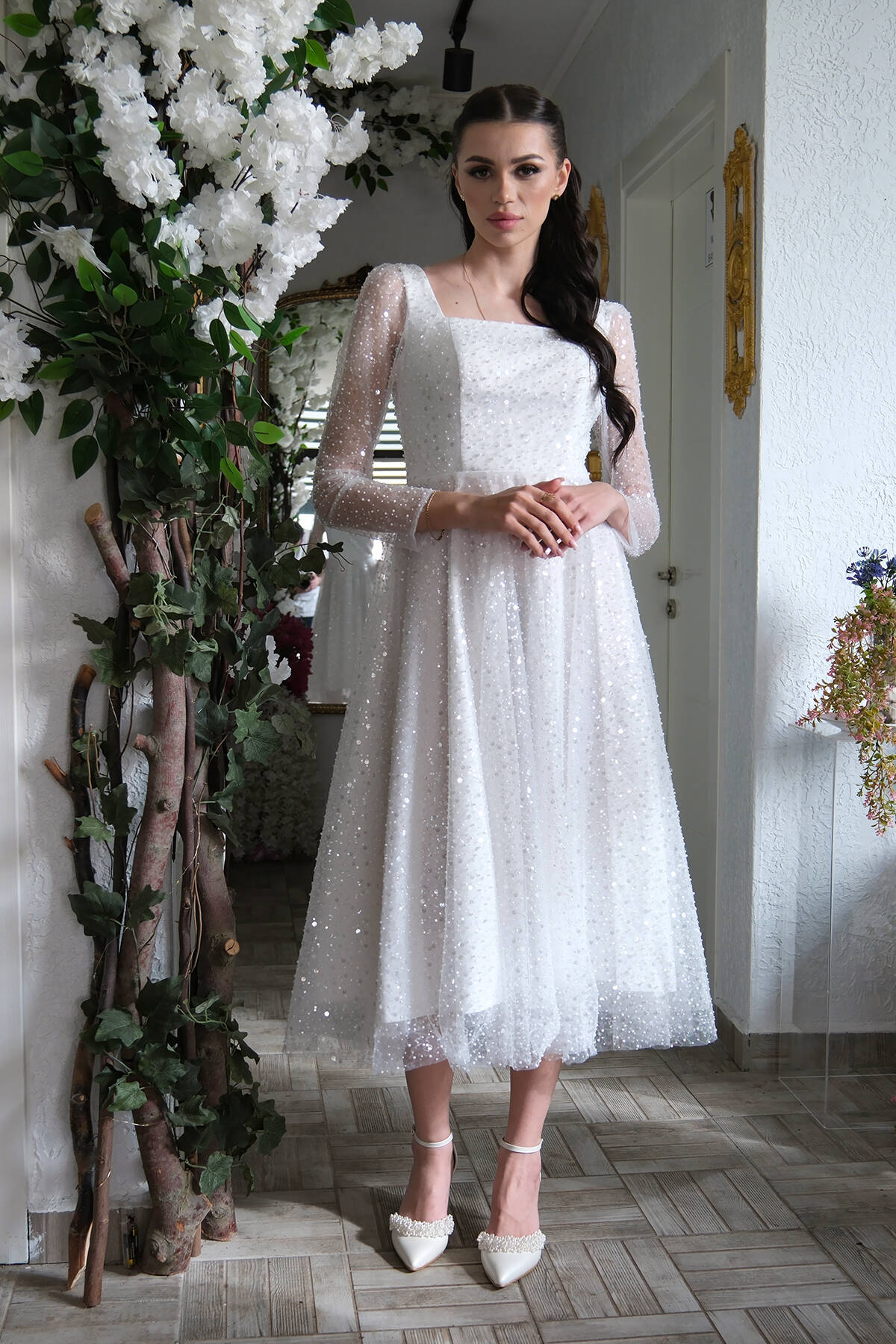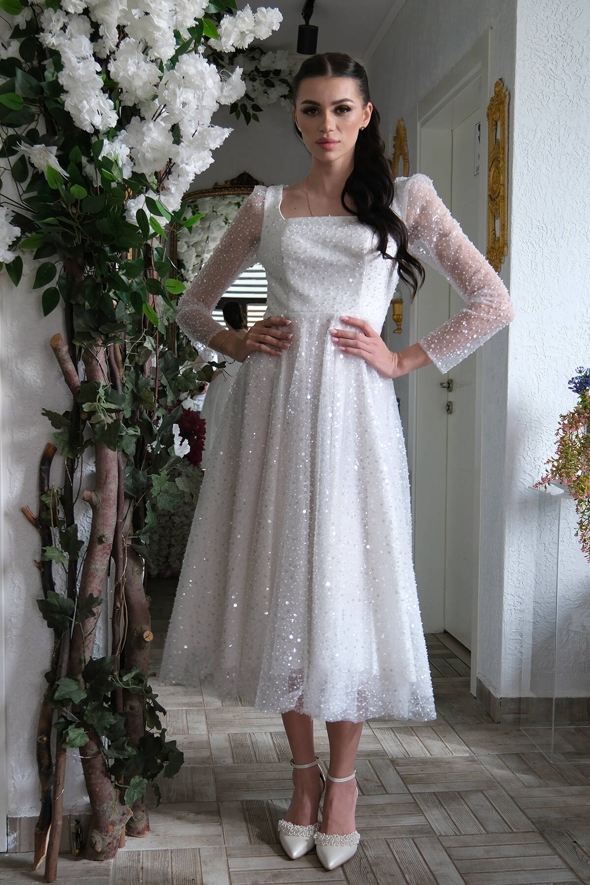 Beyaz Kare Yaka Pul Payetli Midi Boy Abiye 6502491.15