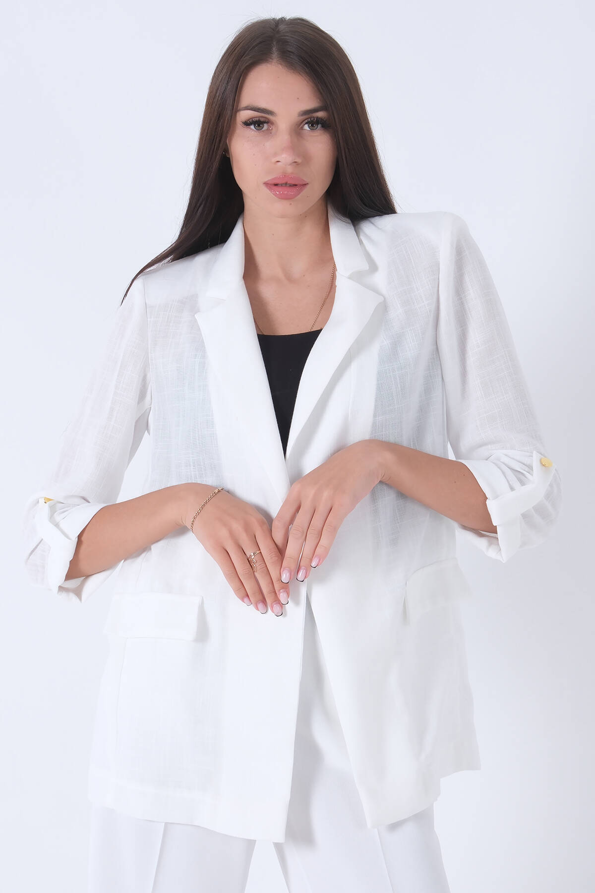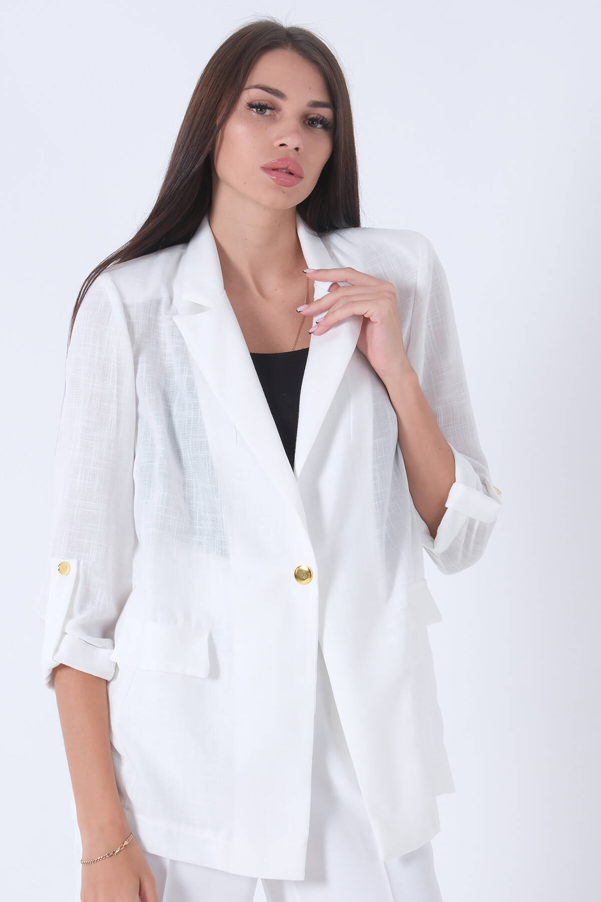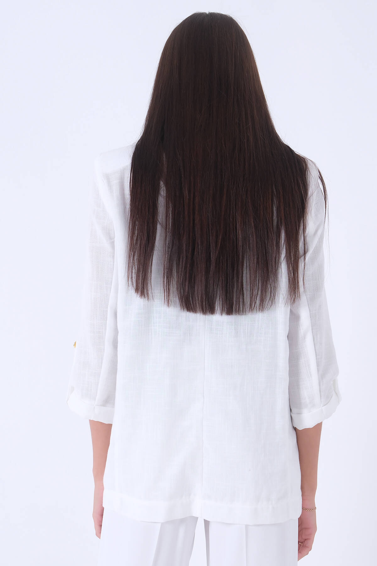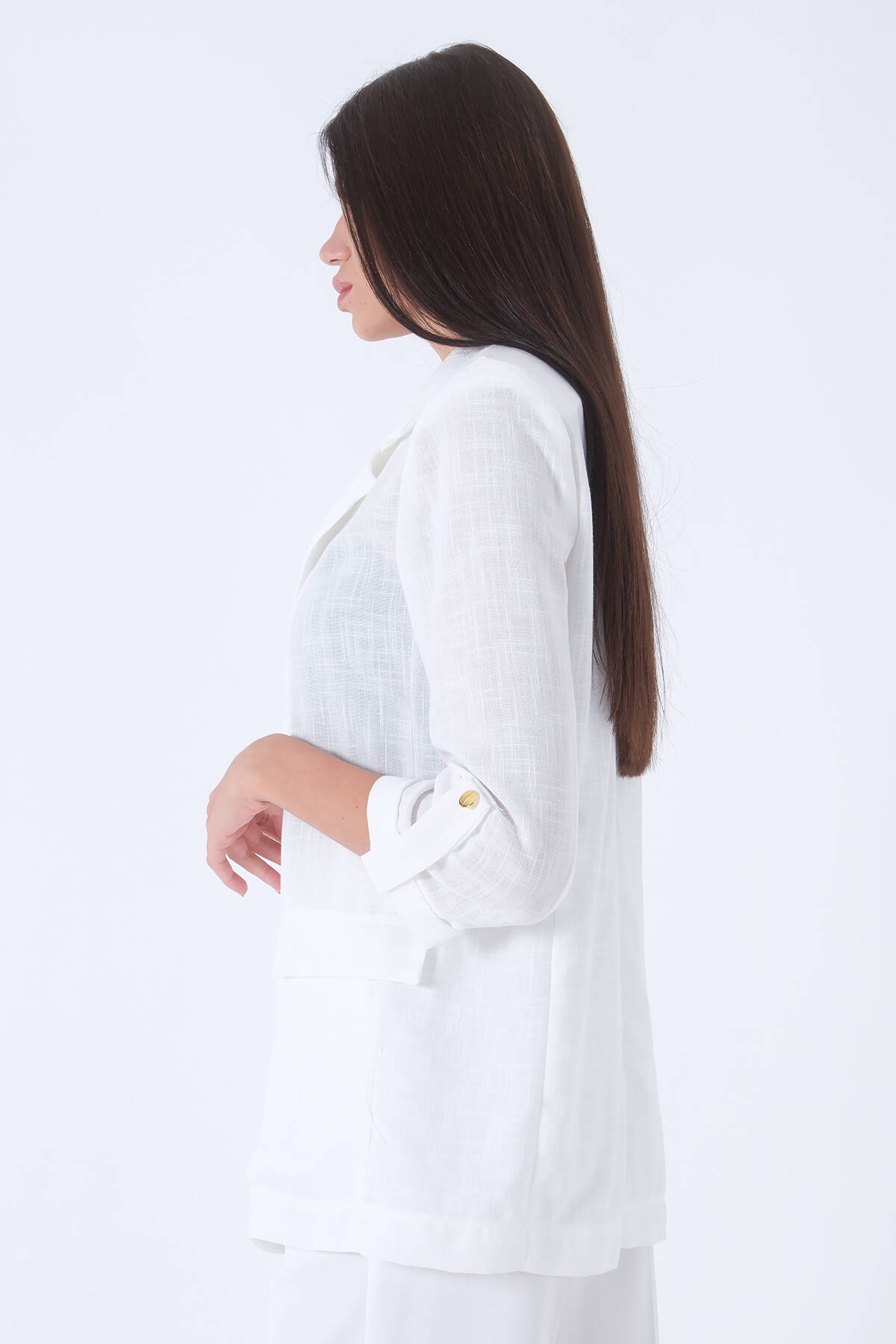 Beyaz Kolları Düğme Toparlamalı Keten Ceket 01051361.15