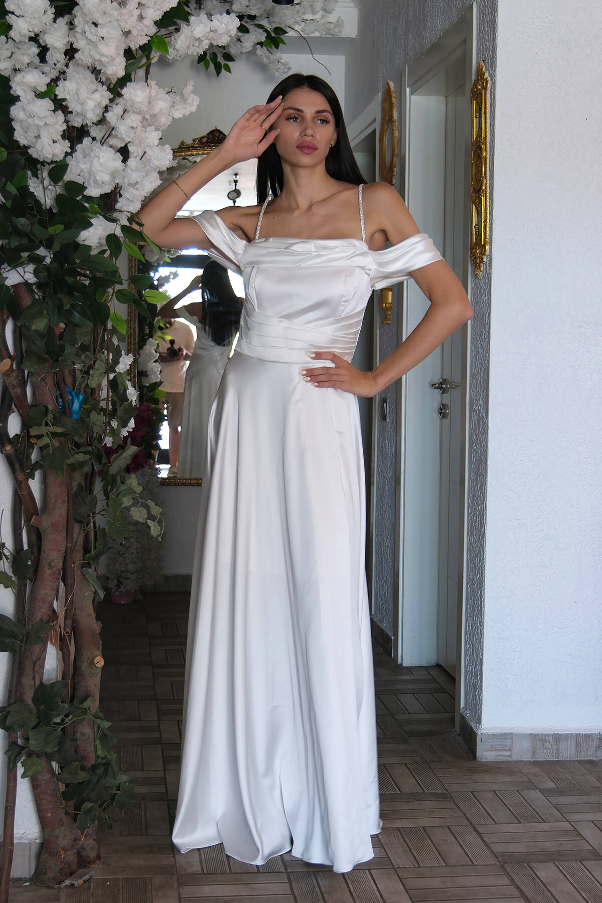 Beyaz Taş Askılı Düşük Kol Saten Abiye 0806118.15