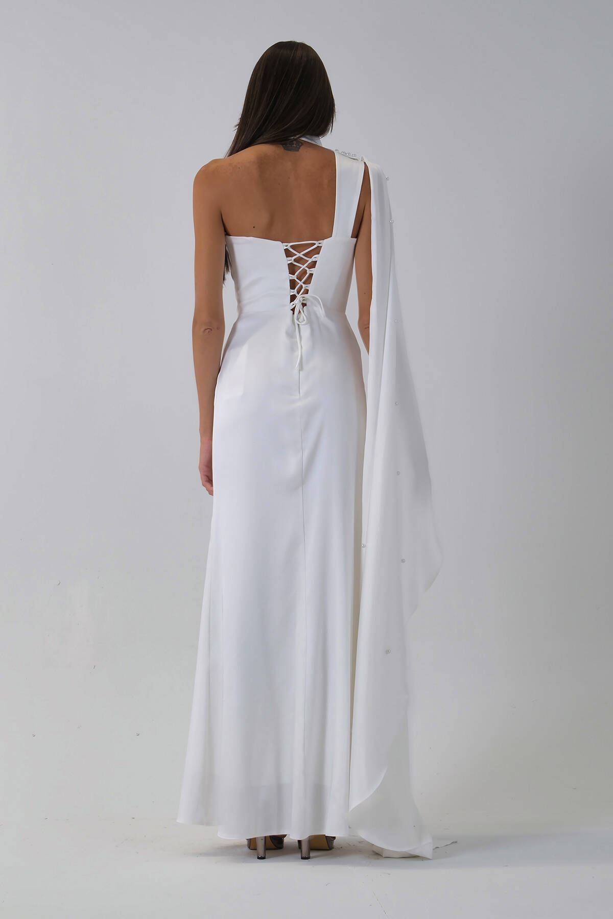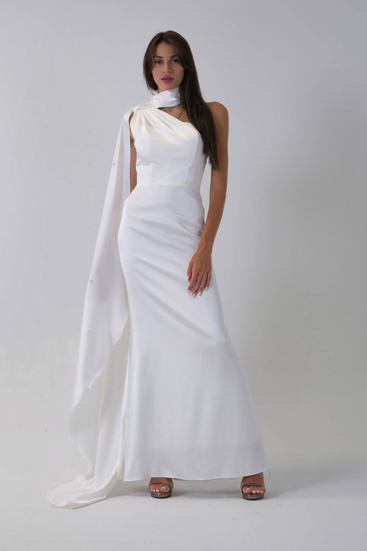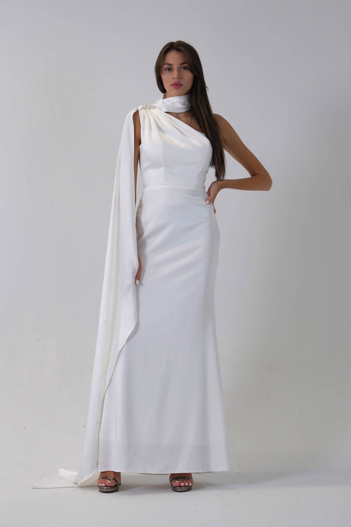Beyaz Yaka Kuşak Detaylı Tek Omuz Abiye 0801099.15