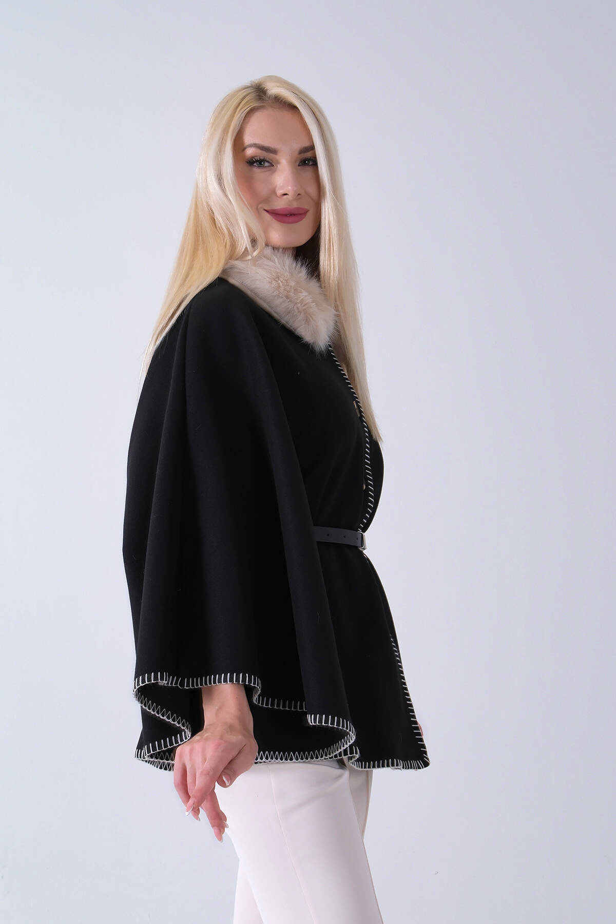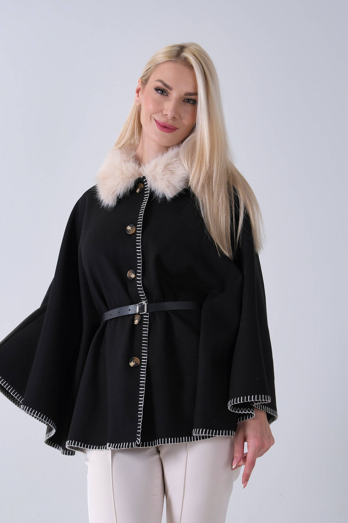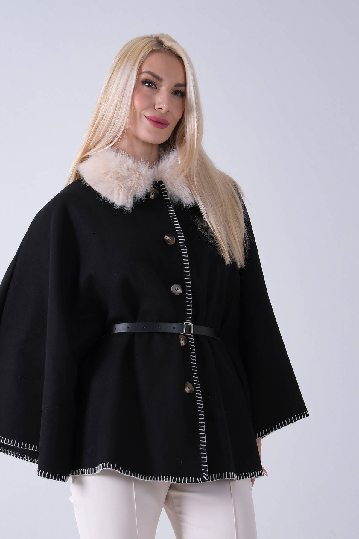 Siyah Önü Düğme Kapamalı Kemerli Yakası Kürklü Panço 47122714.01