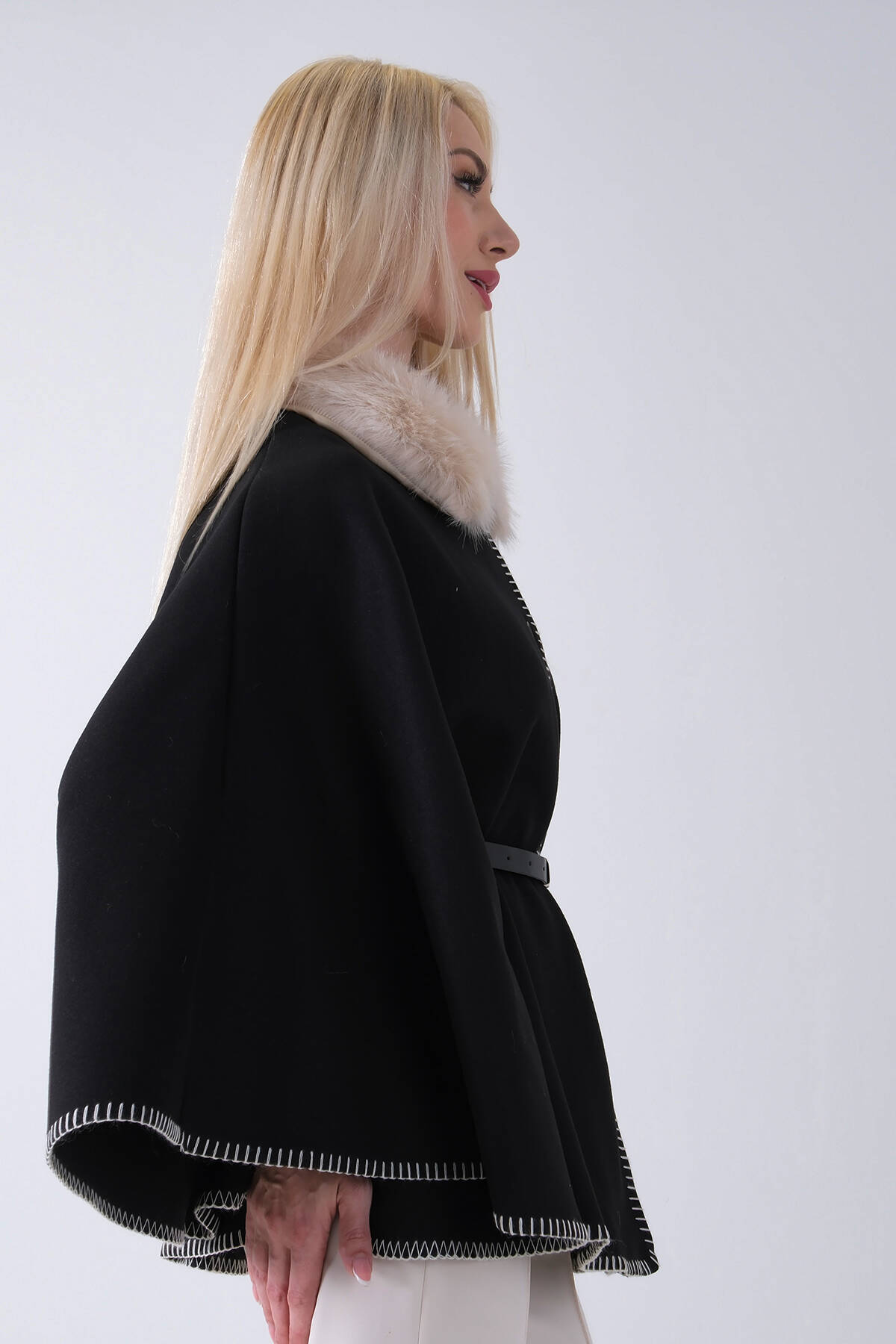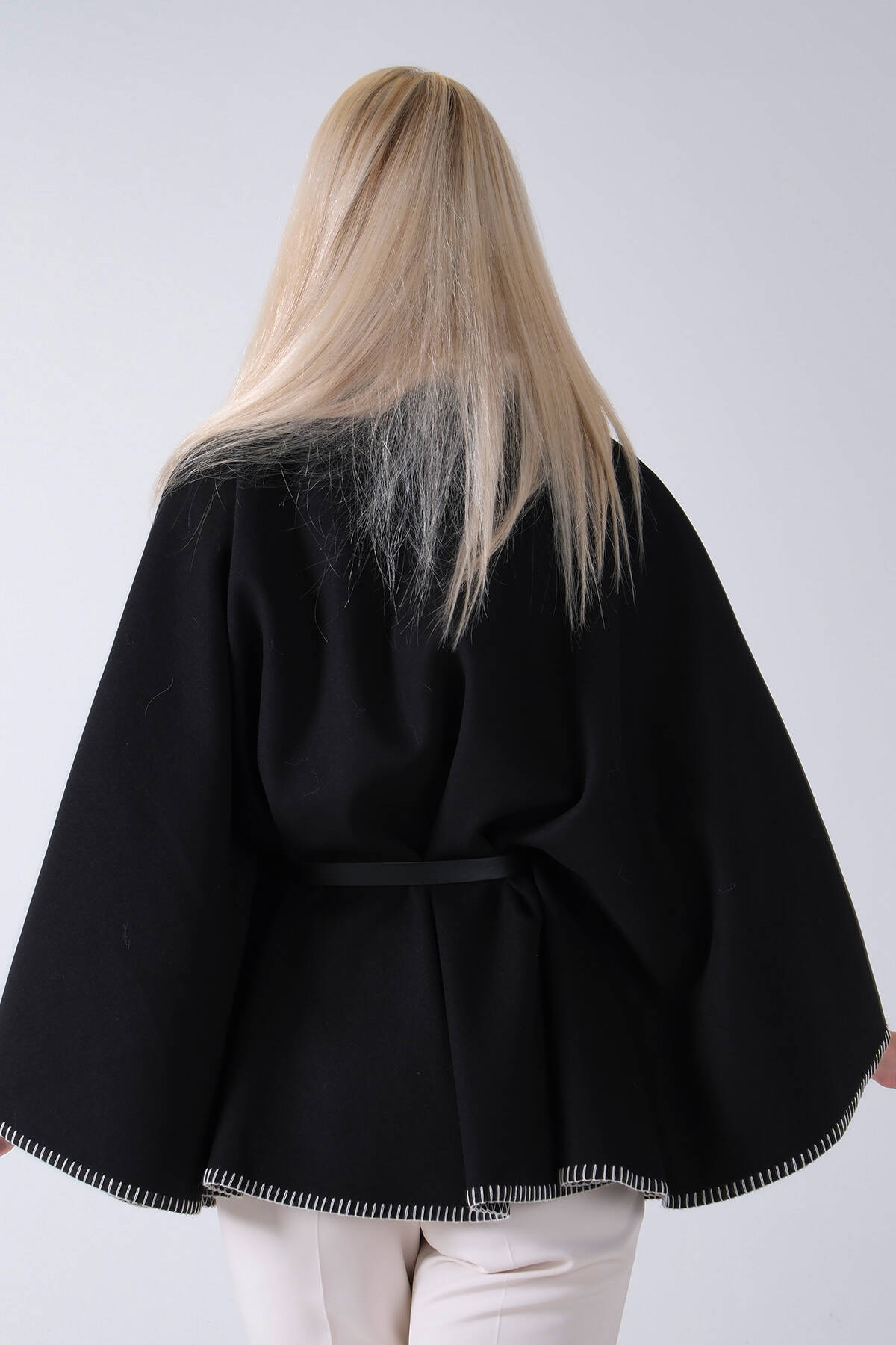 Siyah Yakası Kürklü Dikiş Detaylı Kemerli Panço 47122731.01
