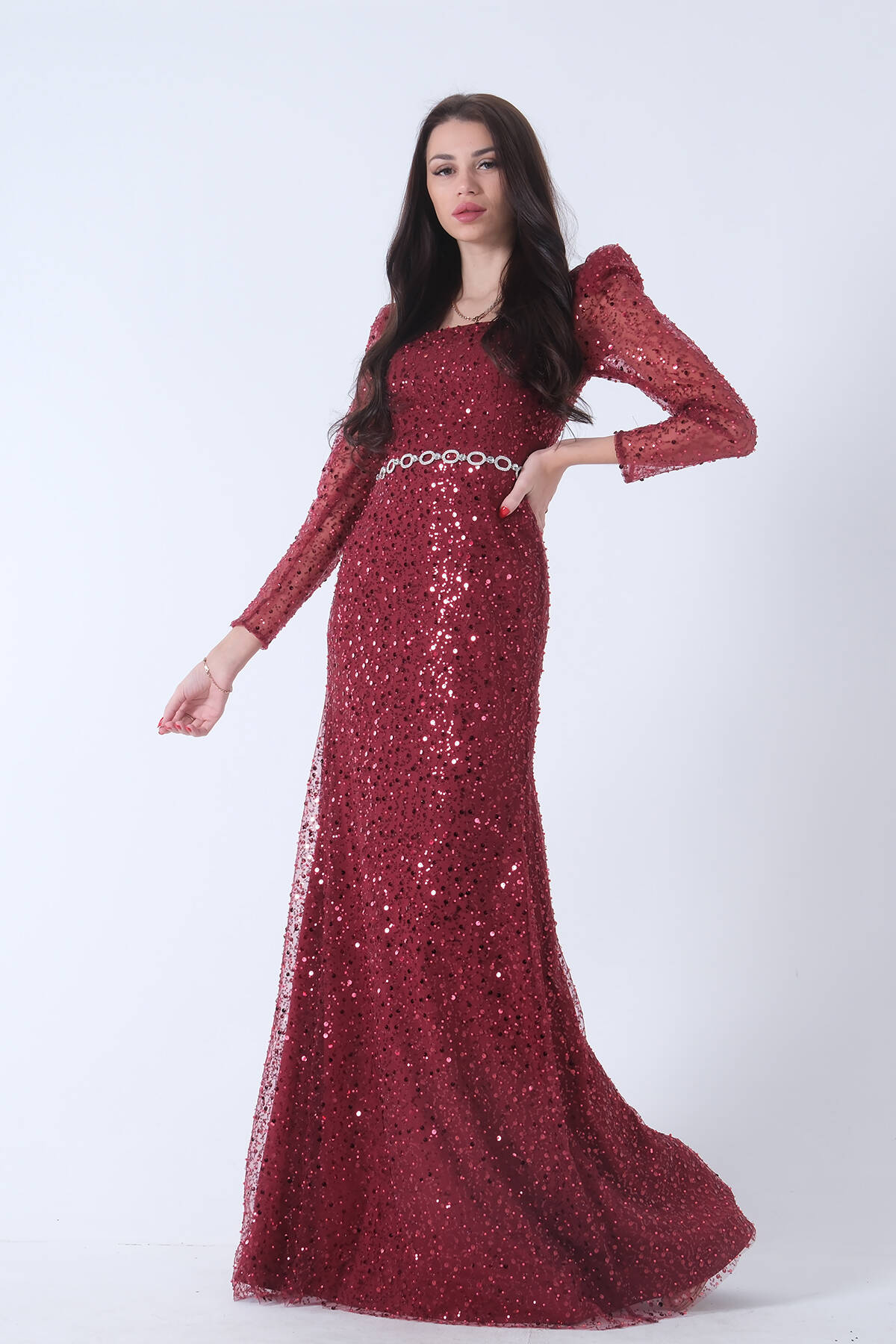 Bordo Kare Yaka Kolları Transparan Abiye Elbise 9705196.04