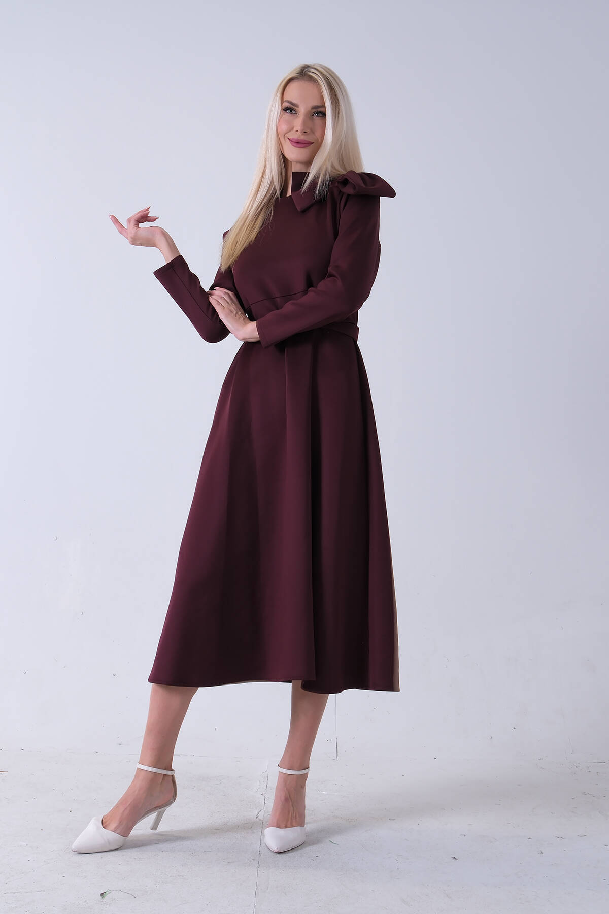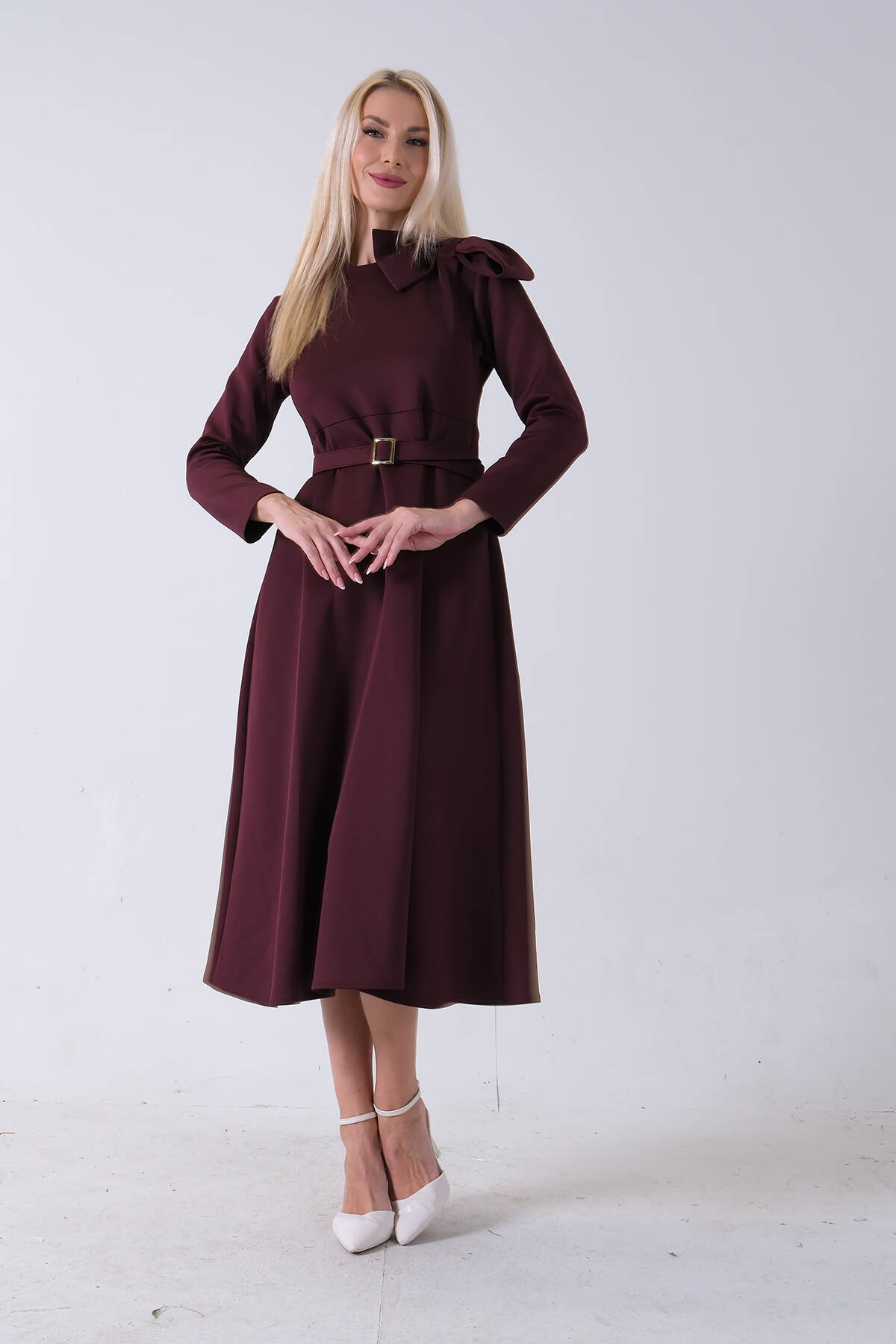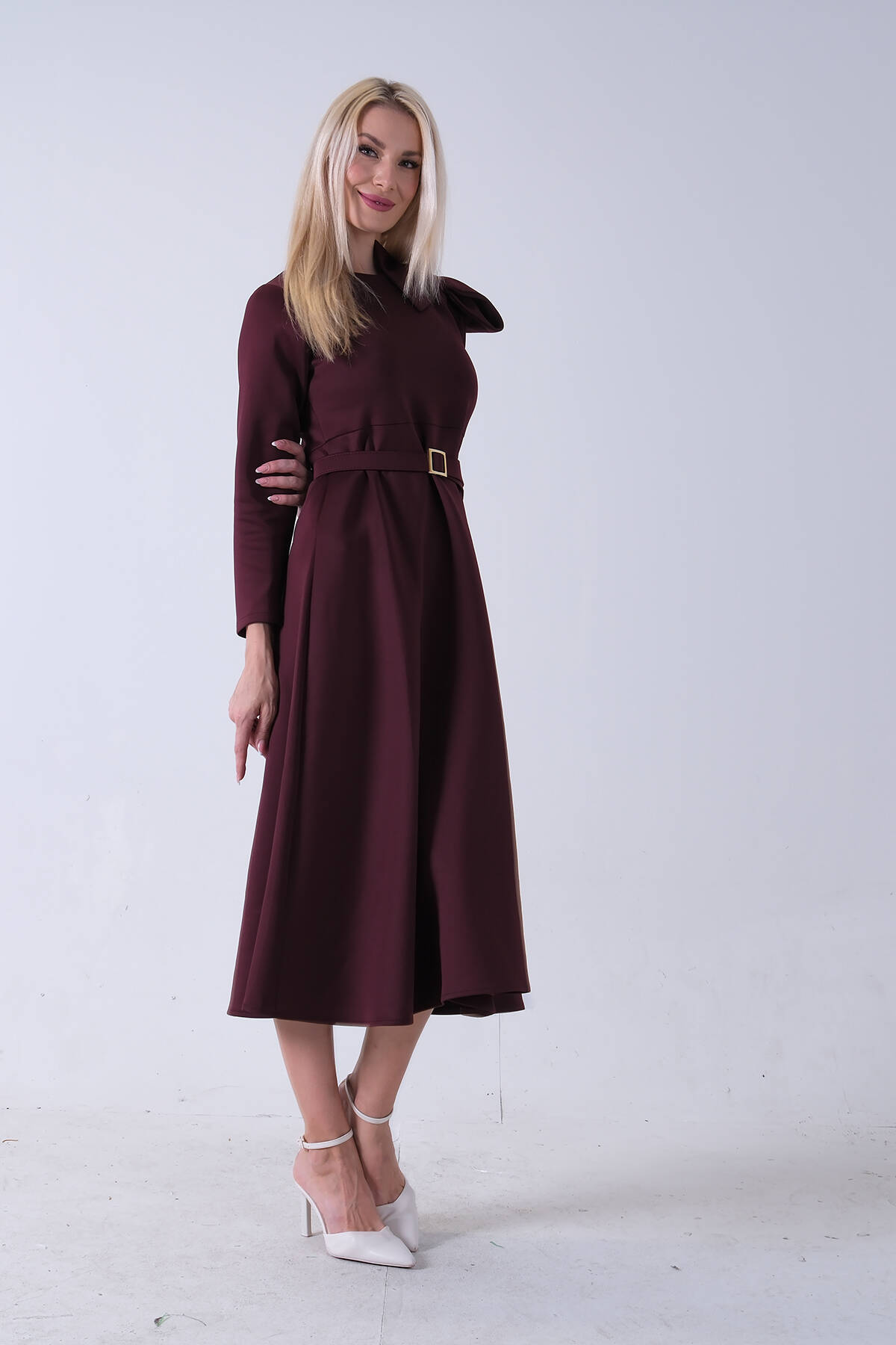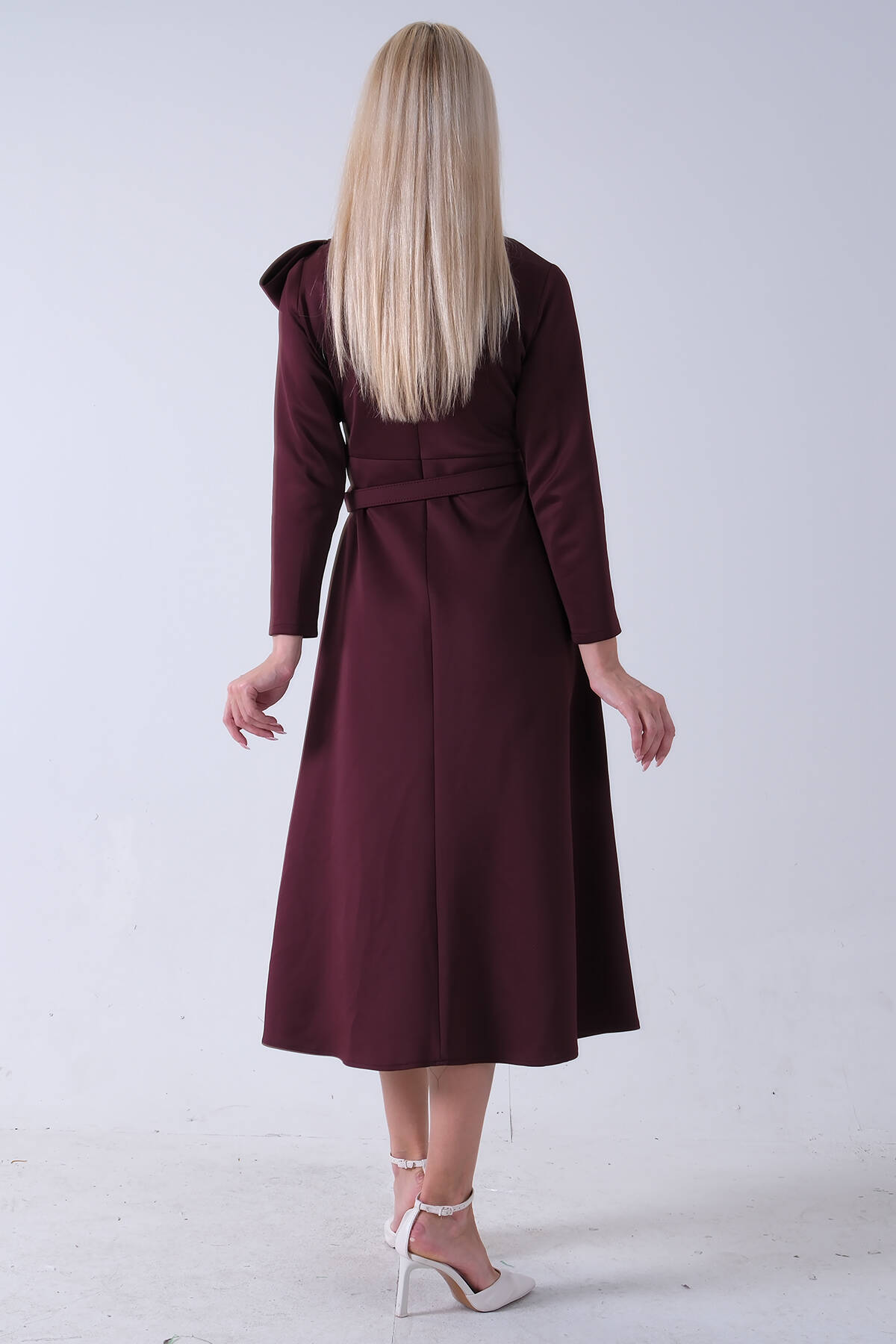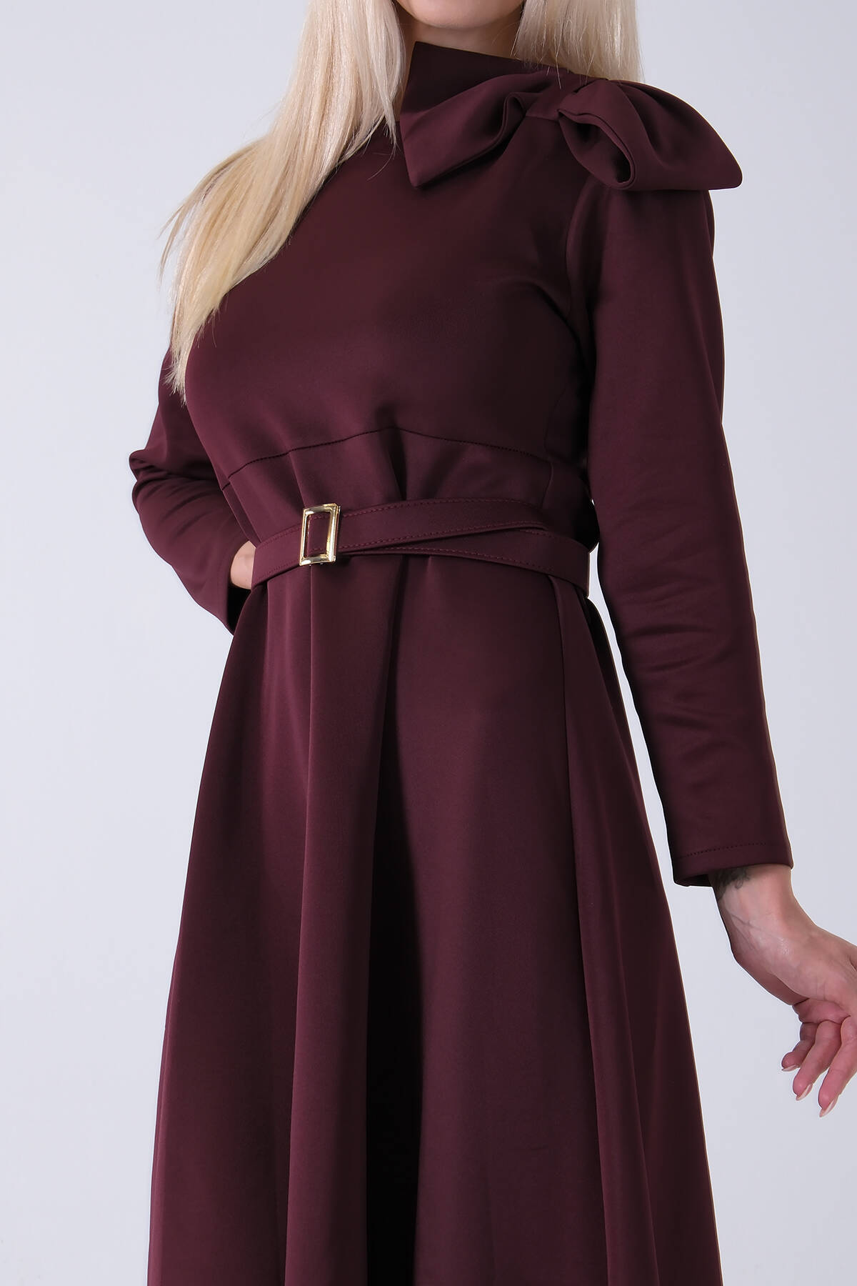 Bordo Omuz Fiyonk Detaylı Kemerli Bisiklet Yaka Scuba Tesettür Elbise 4593456.04