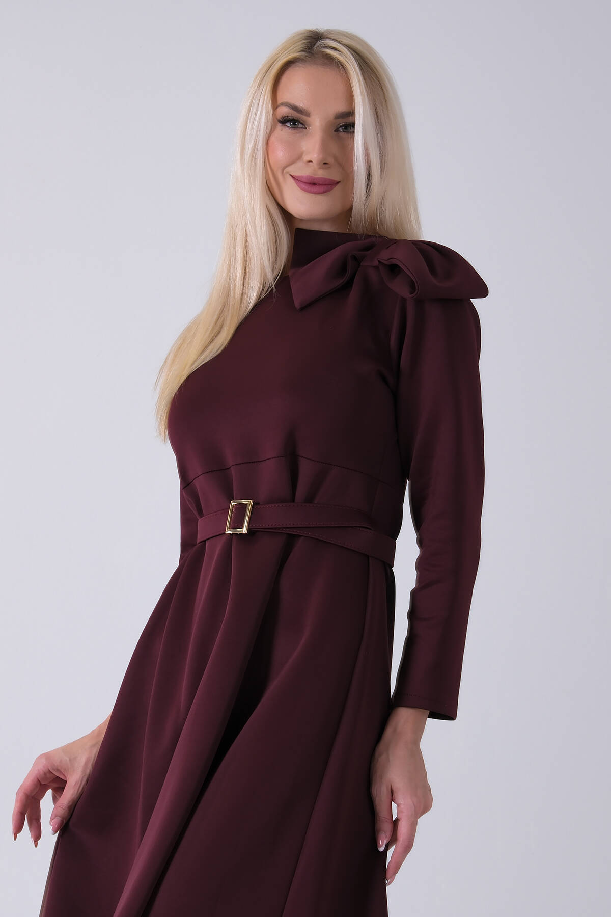 Bordo Bisiklet Yaka Önü Pile Detaylı Beli Kemerli Elbise 4593453.04