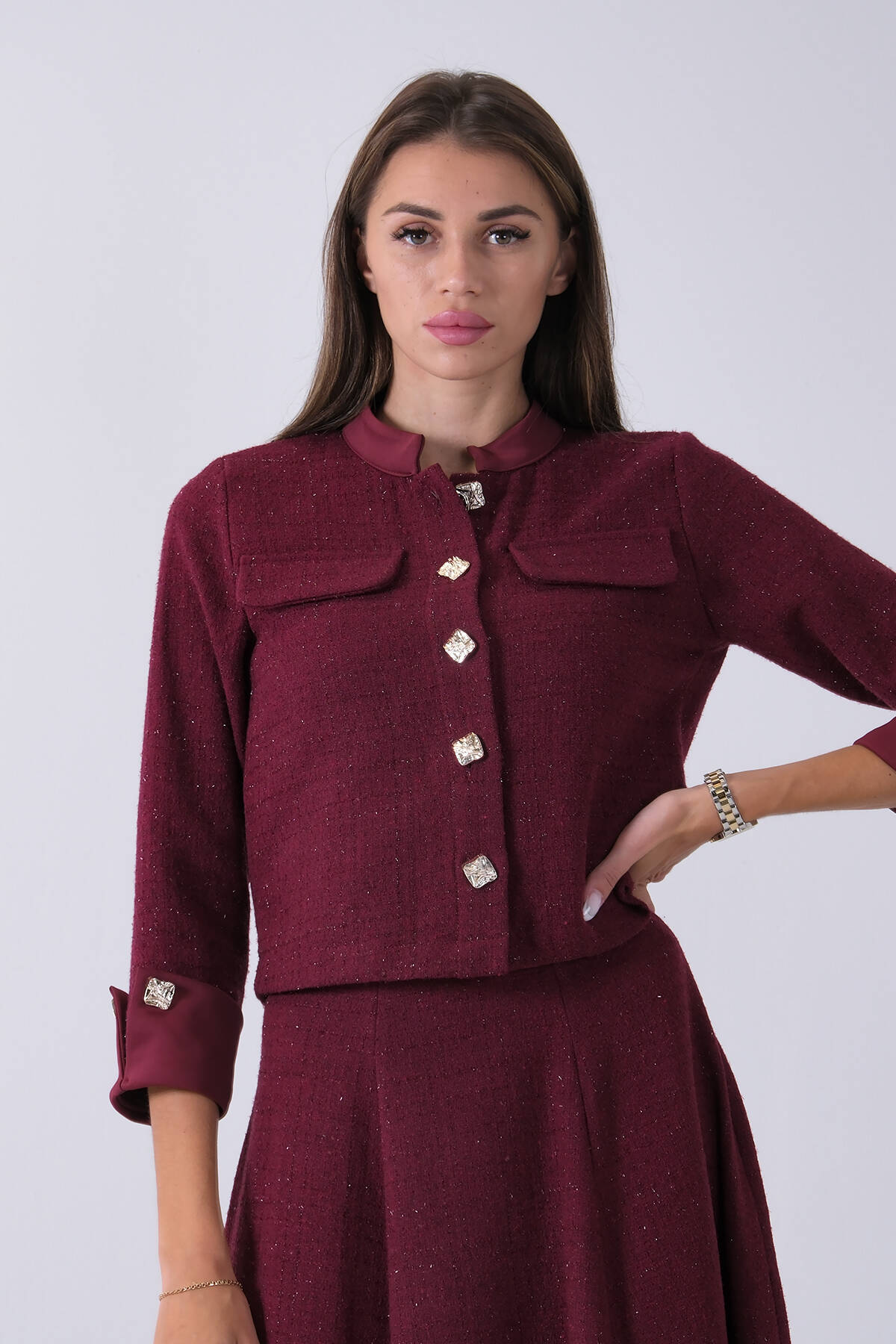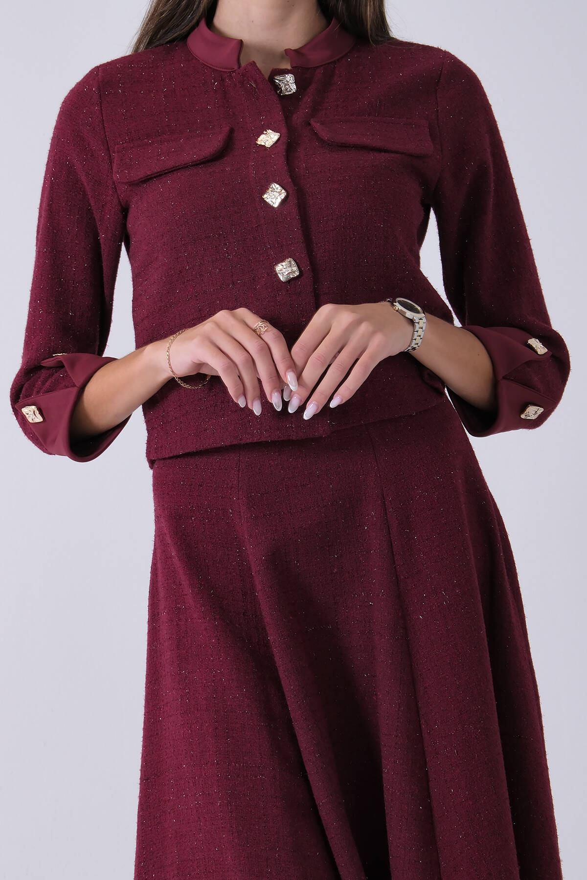 Bordo Önü Düğme Kapamalı Crop Ceket Etekli Tüvid Takım 45950601.04