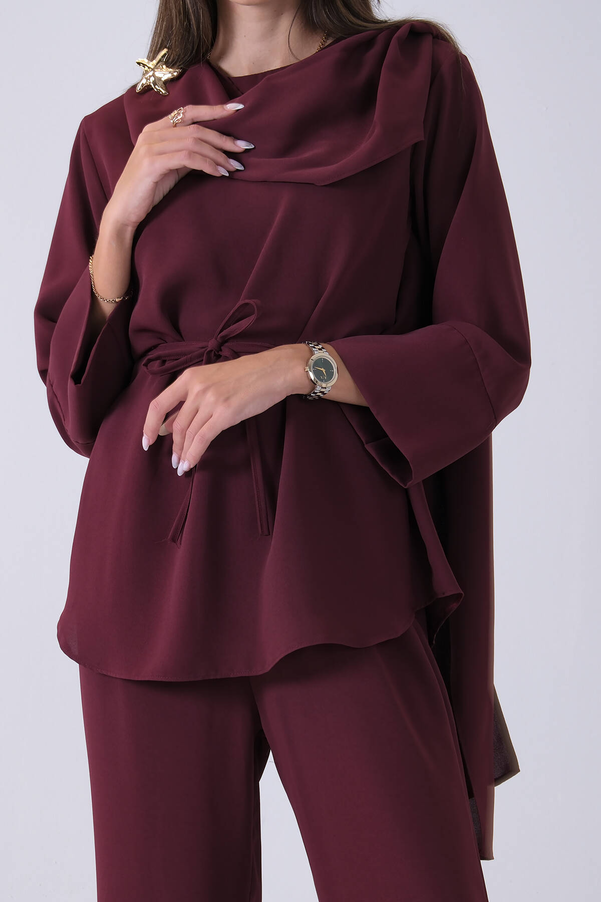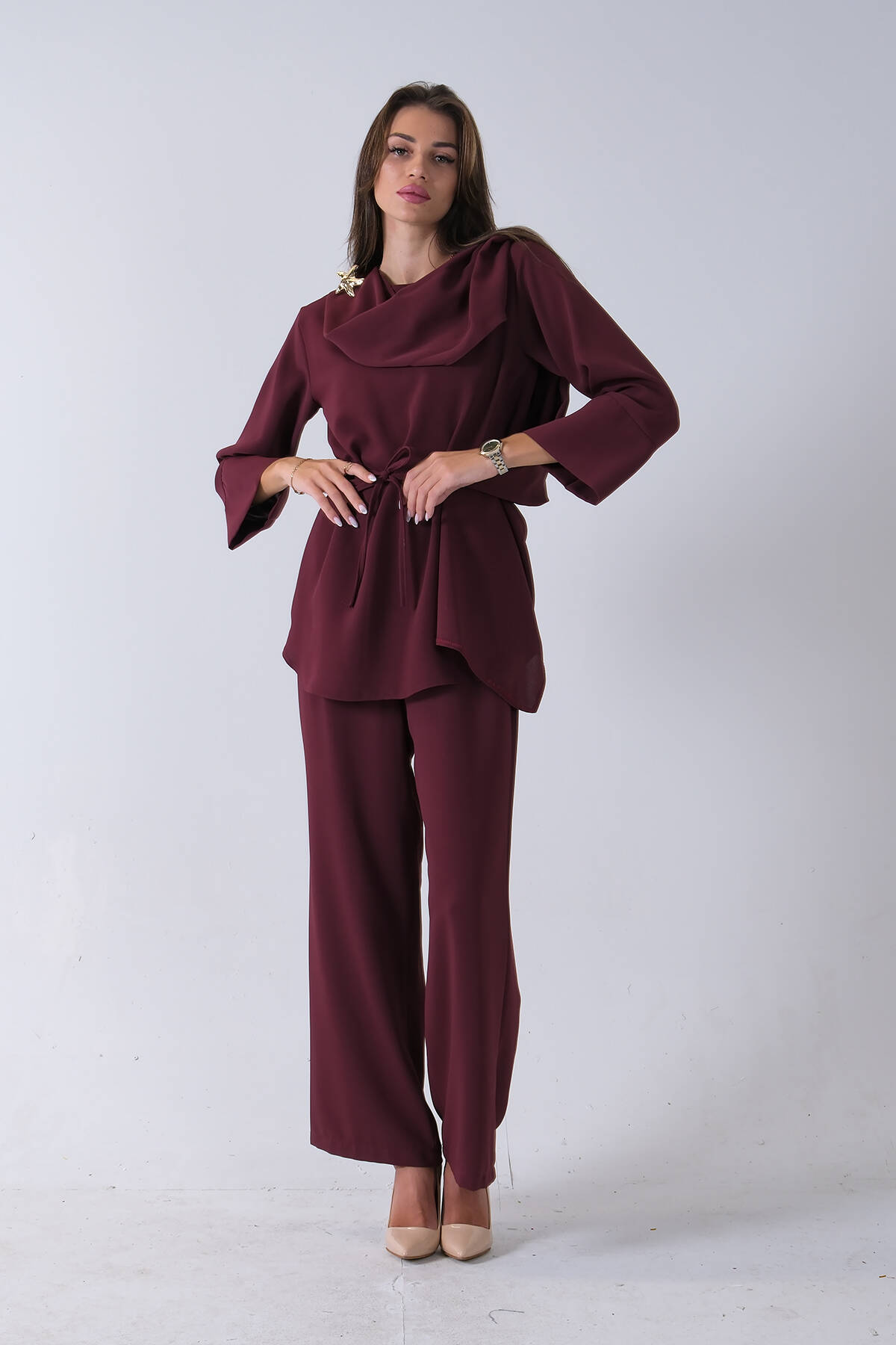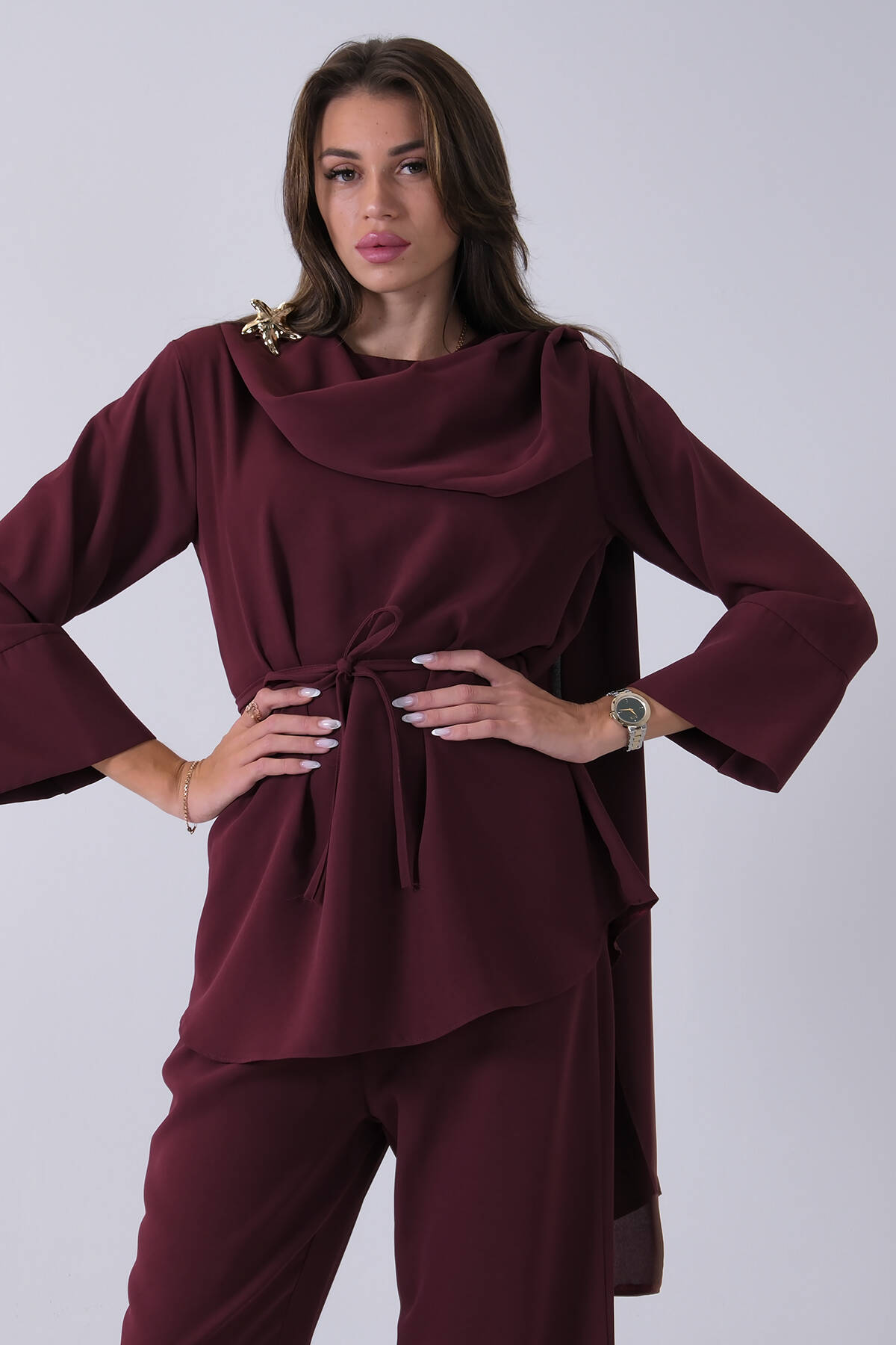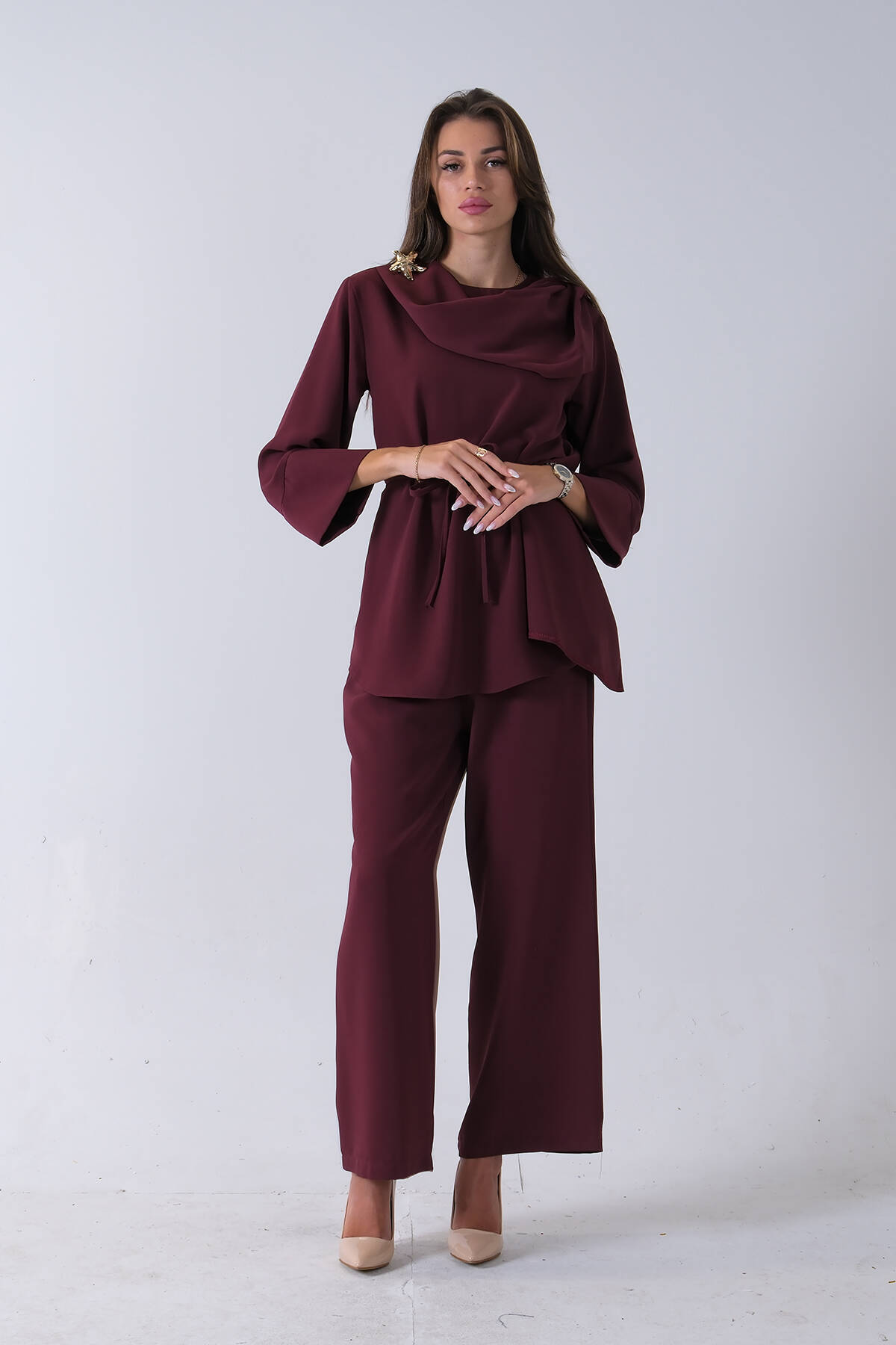 Mürdüm Üzeri Desenli Yaka Deri Detaylı Fermuar Kapamalı Tunik Pantolonlu Takım 4703058.21