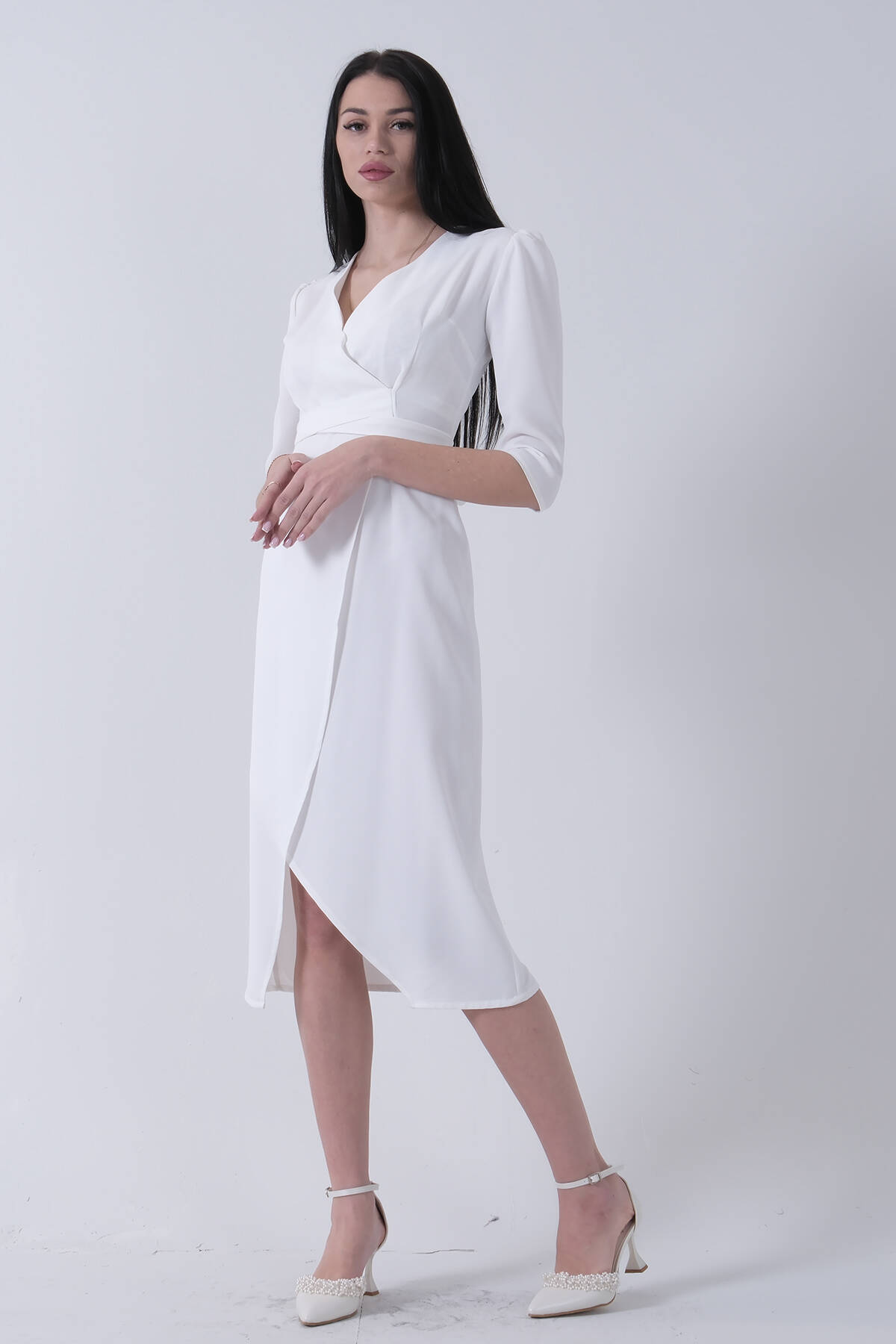 Truvakar Kol Kruvaze Yaka Kendinden Kemerli Yırtmaçlı Krep Kumaş Midi Boy Abiye