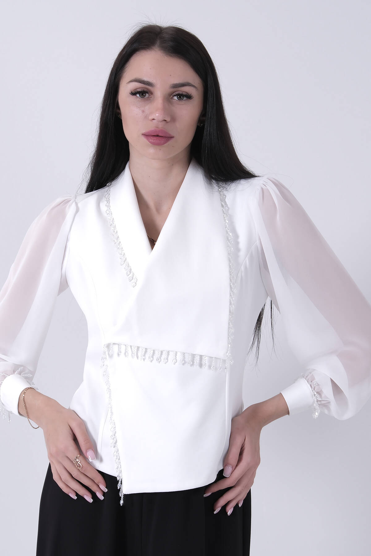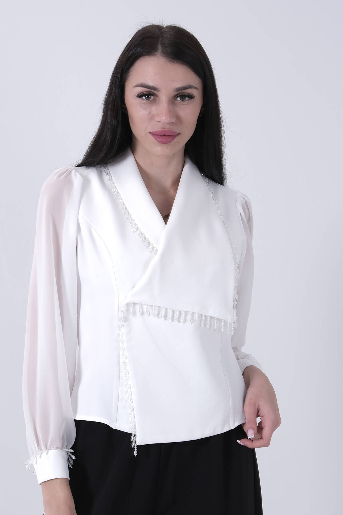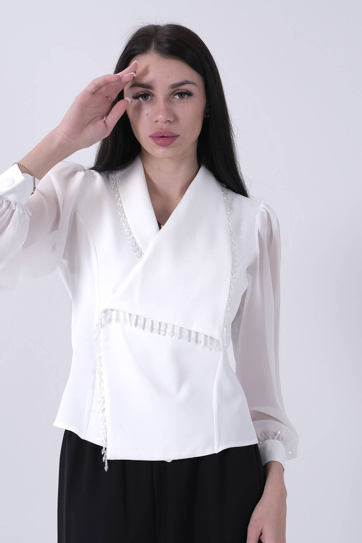 Ekru Kruvaze Yaka Taş Boncuk Detaylı Bluz 4202781.147