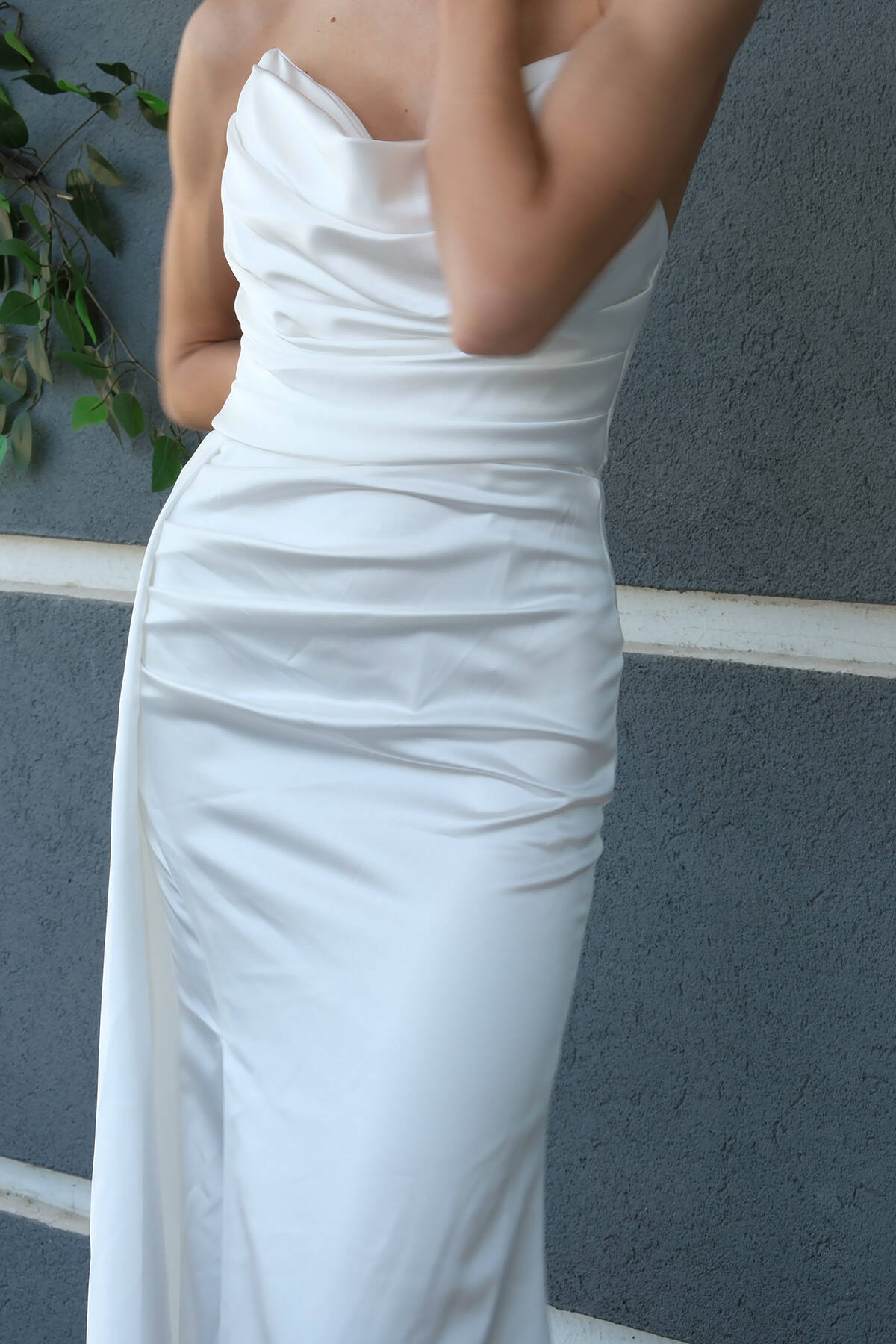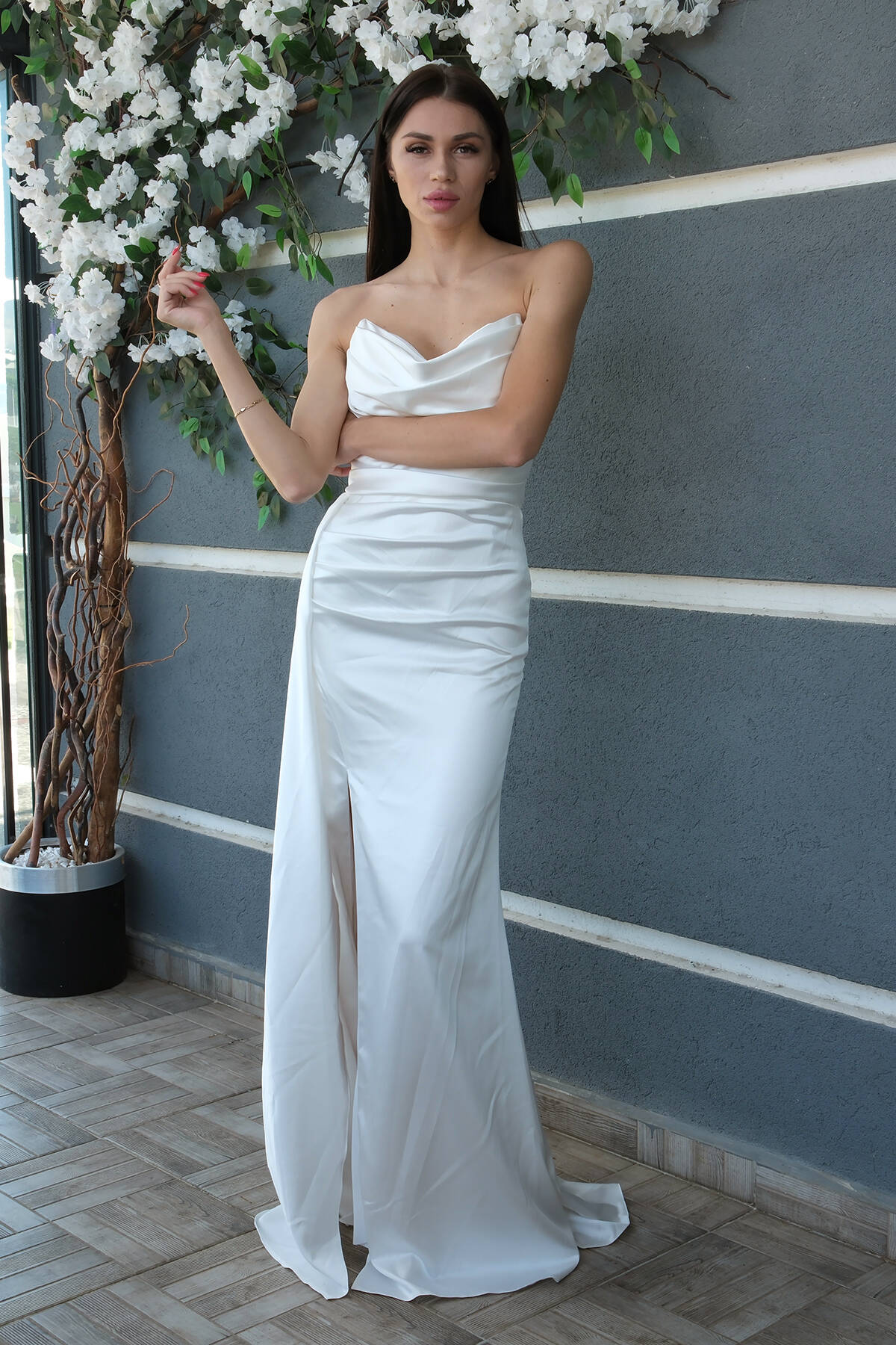 Straplez Göğüsü Drapeli Önden Yırtmaçlı Saten Kumaş Abiye Elbise