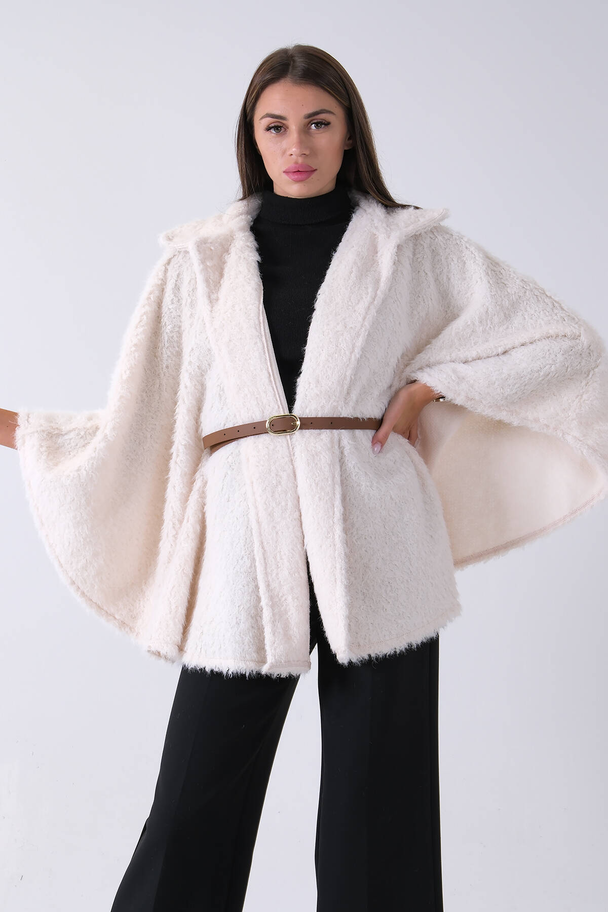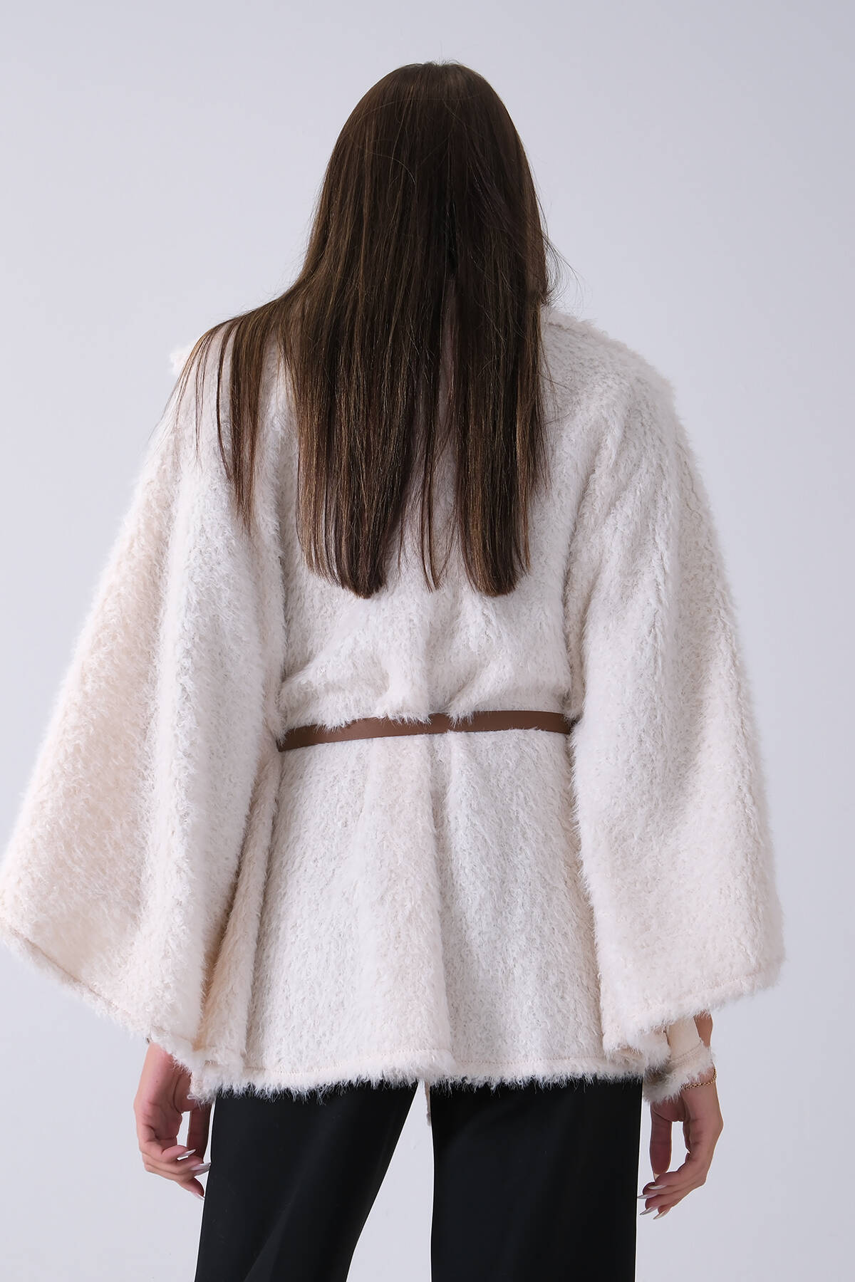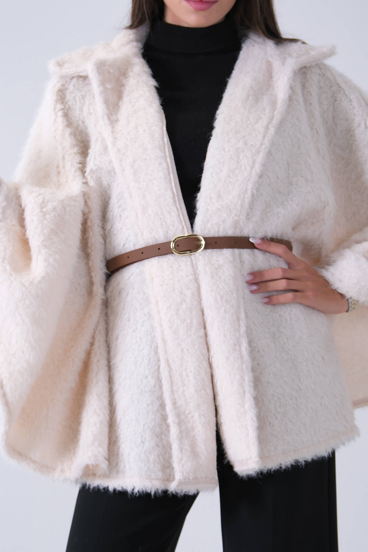 Ekru Tek Düğme Kapamalı Kemerli Yün Peluş Ceket 940140183.147