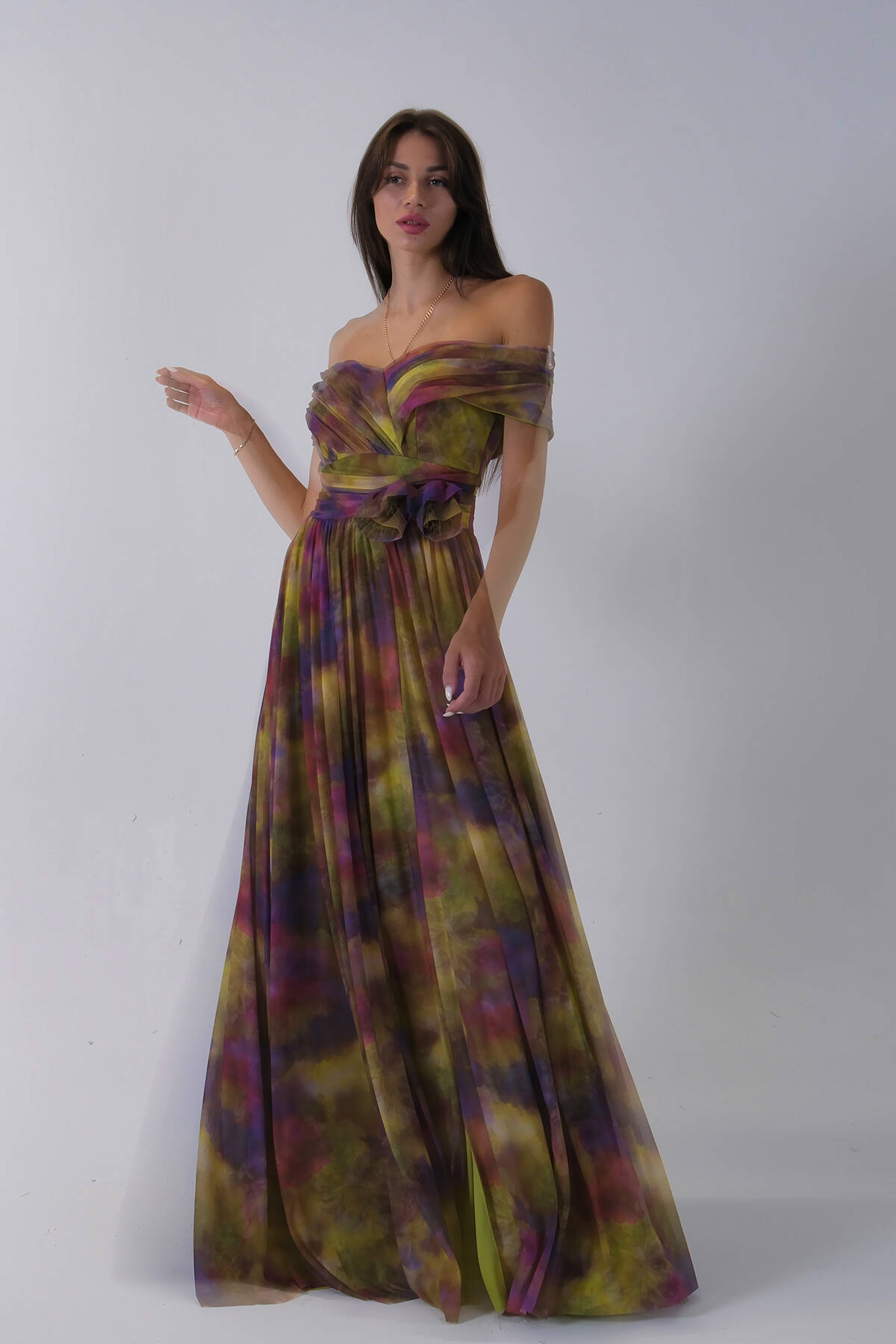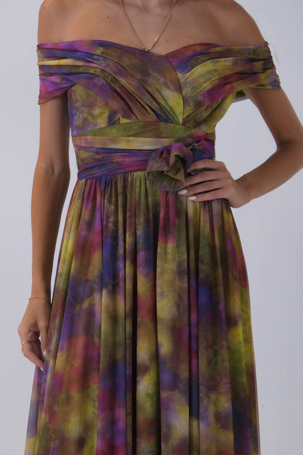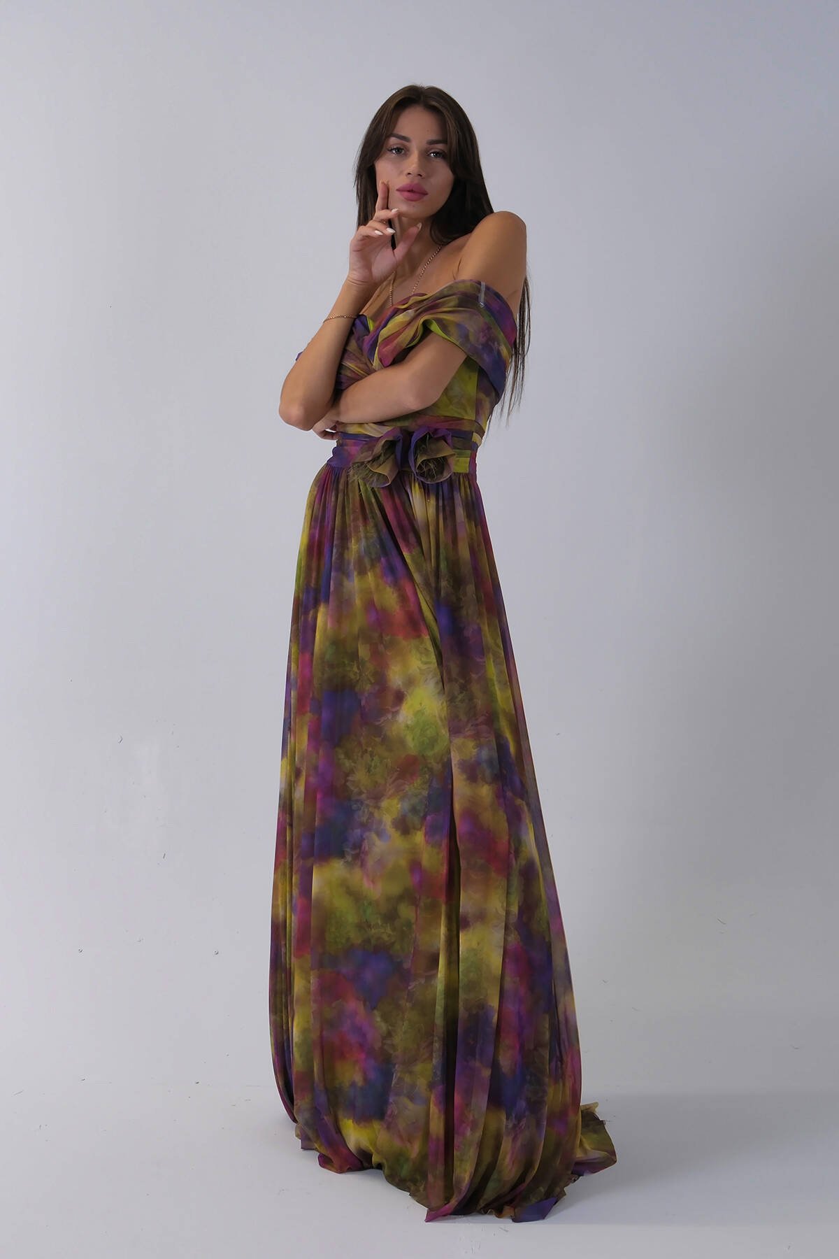 Fıstık Beli Çiçek Detaylı Desenli Şifon Abiye 0801102.22