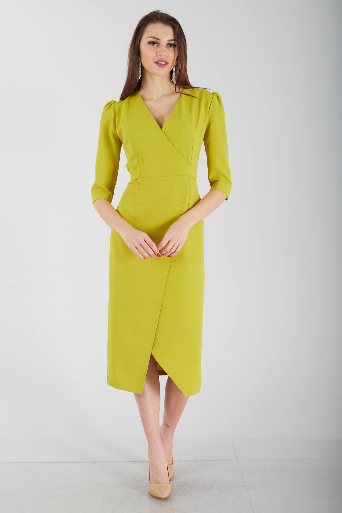 Truvakar Kol Kruvaze Yaka Kendinden Kemerli Yırtmaçlı Krep Kumaş Midi Boy Abiye