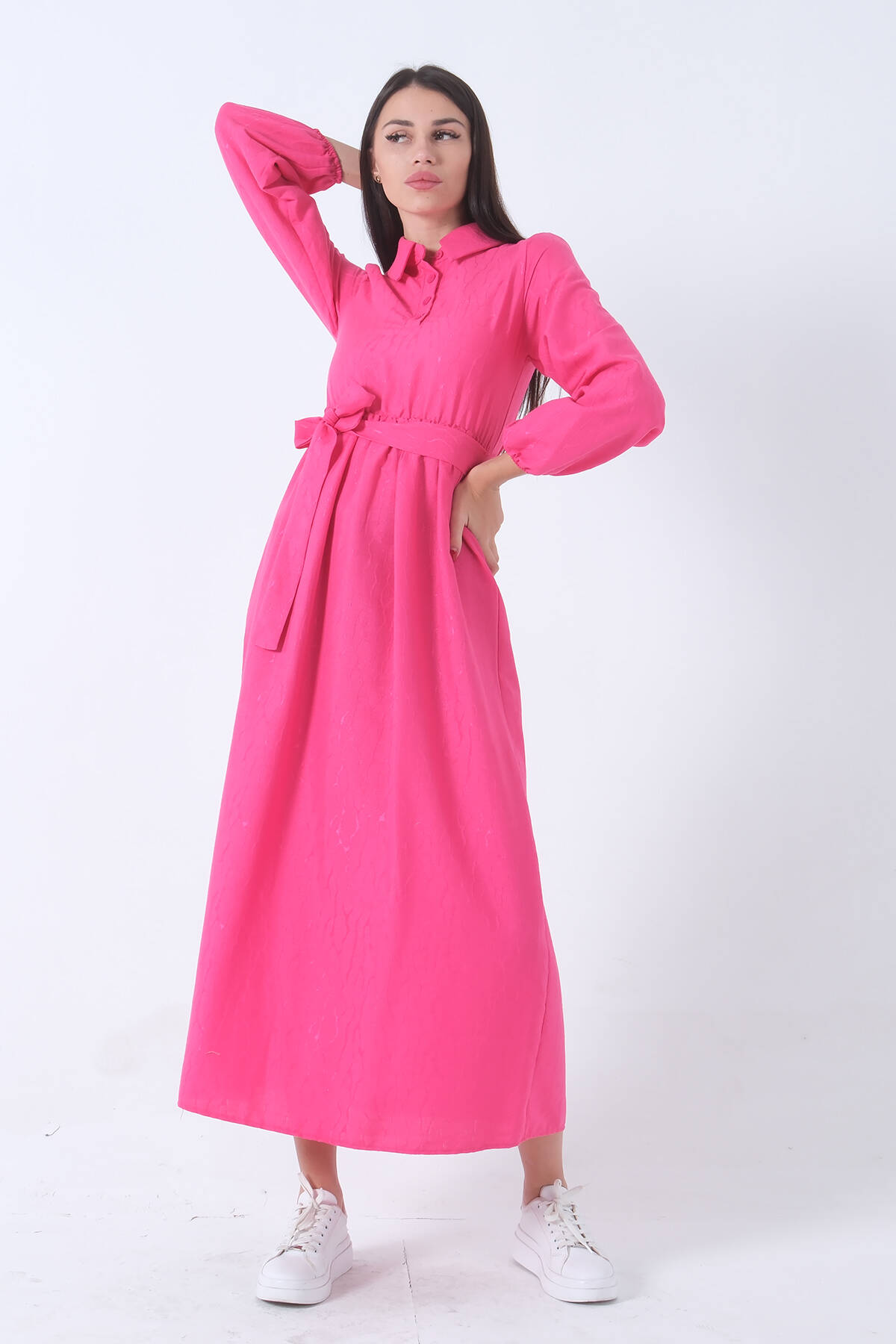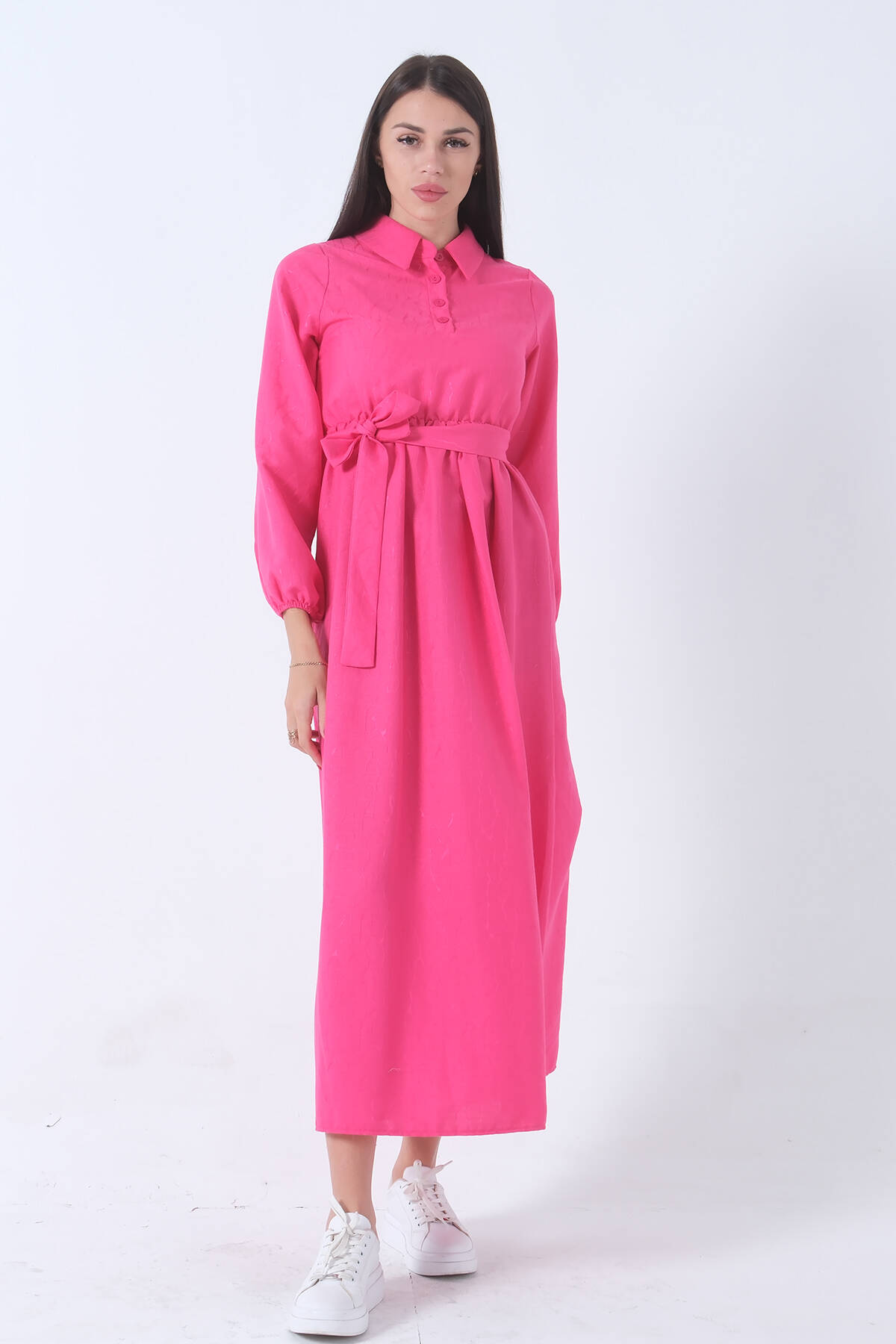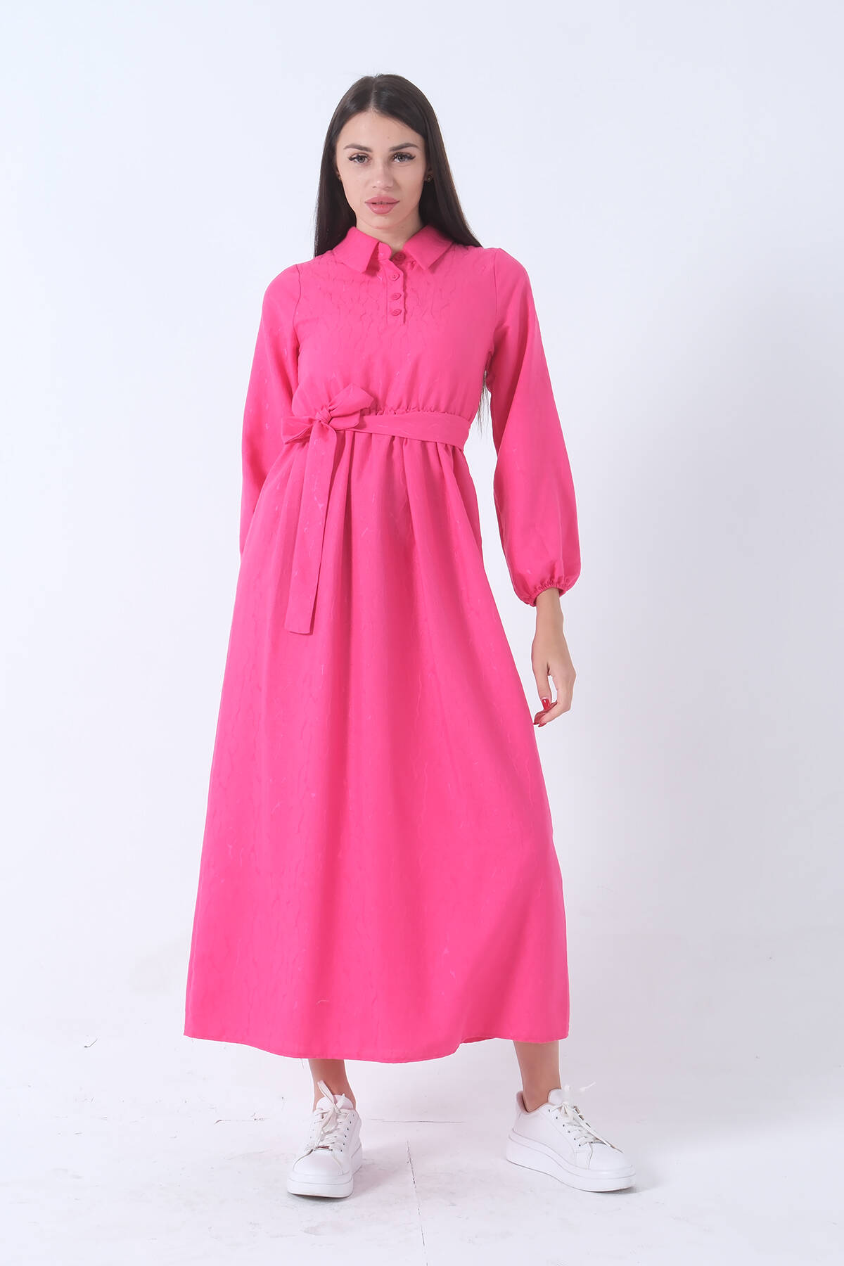 Fuşya Beli Lastikli Gömlek Yaka Kuşaklı Tesettür Elbise 4593296.12