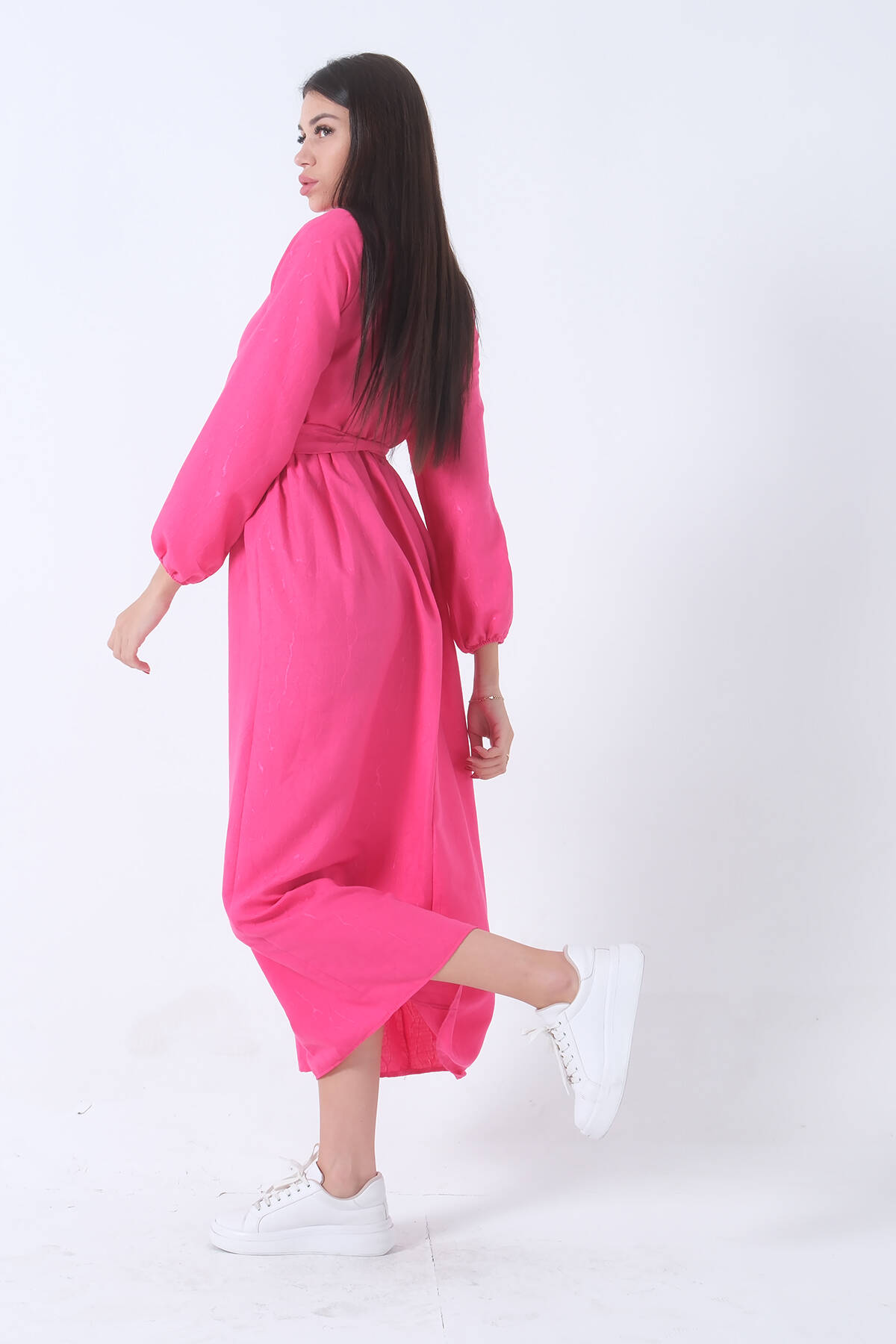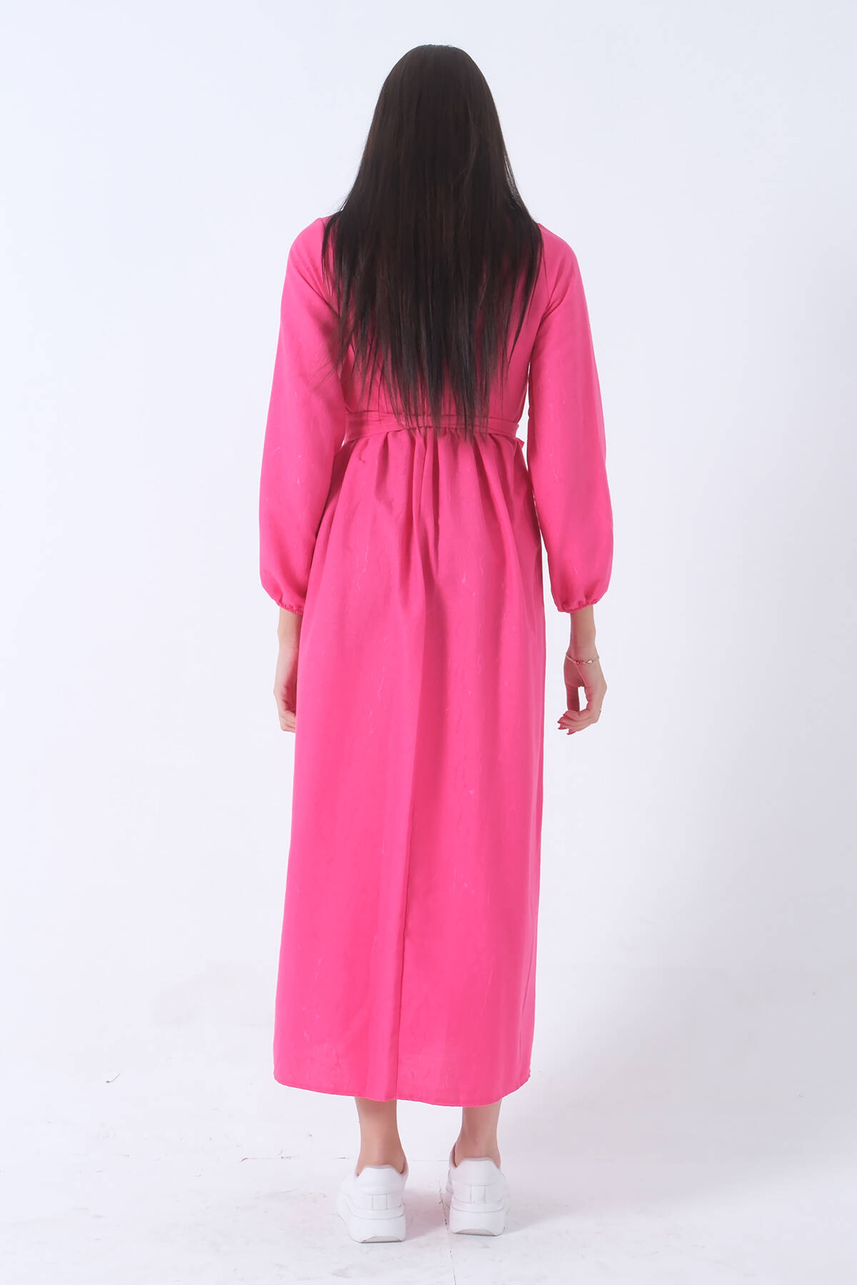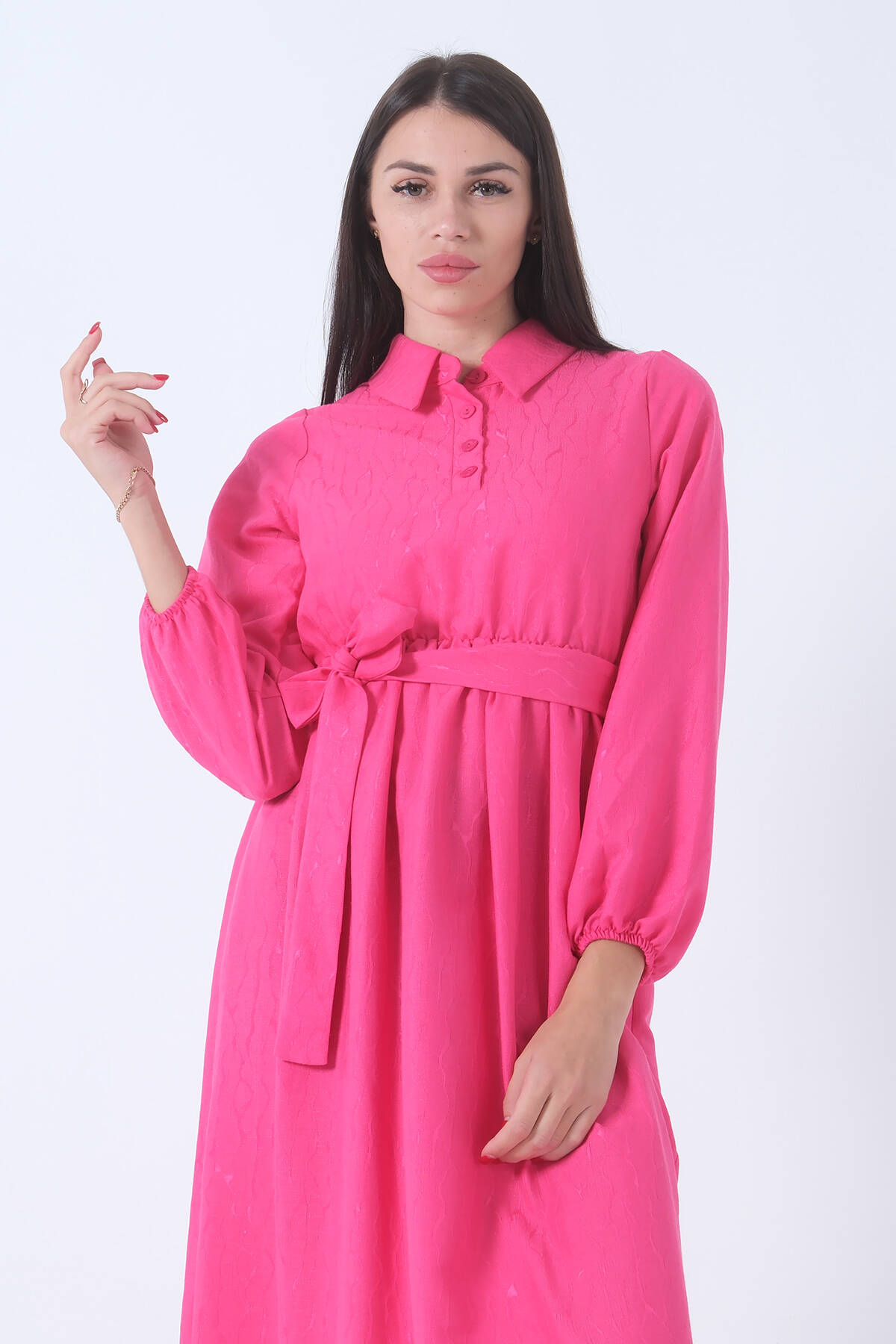Fuşya Beli Lastikli Gömlek Yaka Kuşaklı Tesettür Elbise 4593296.12