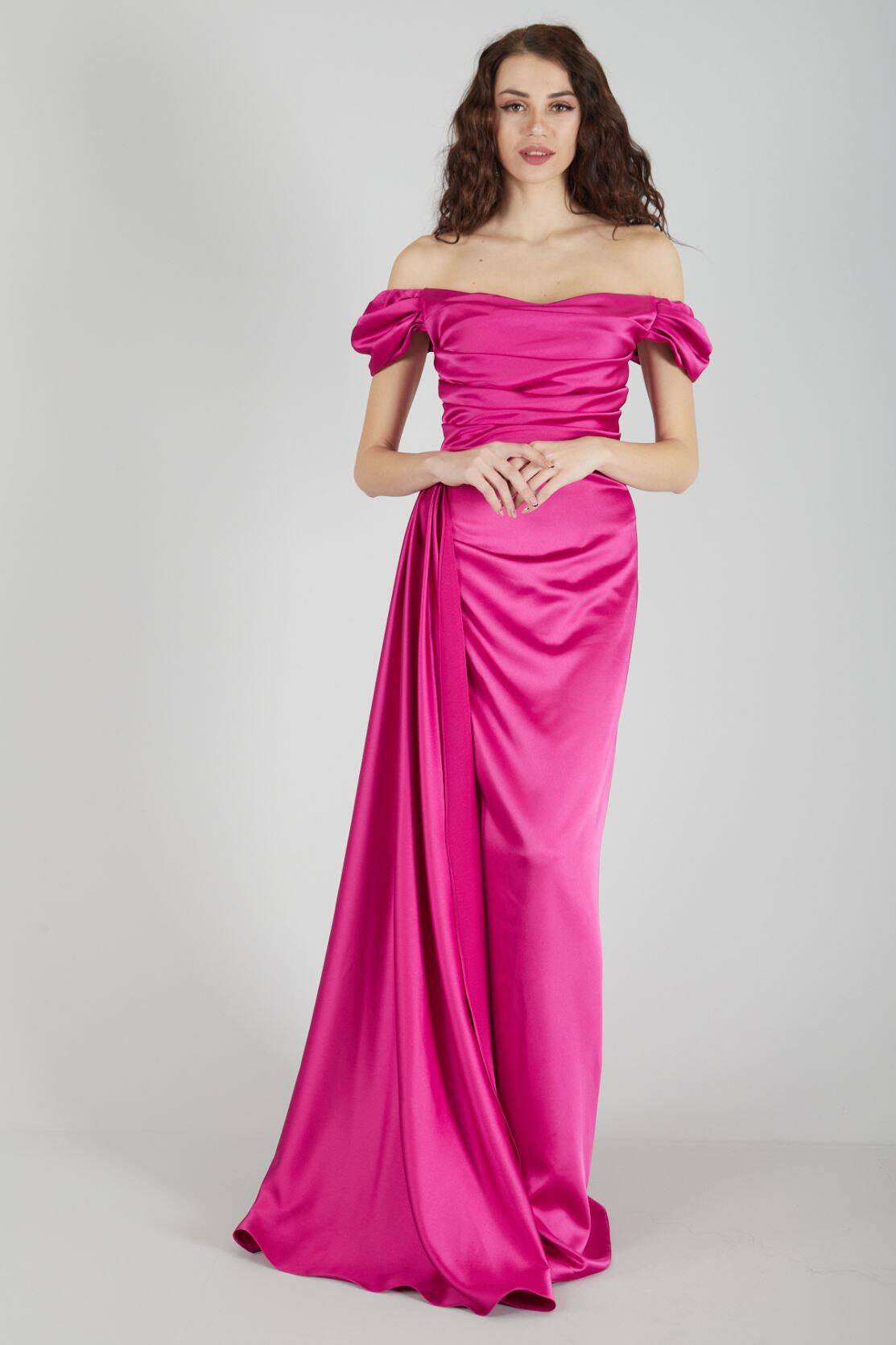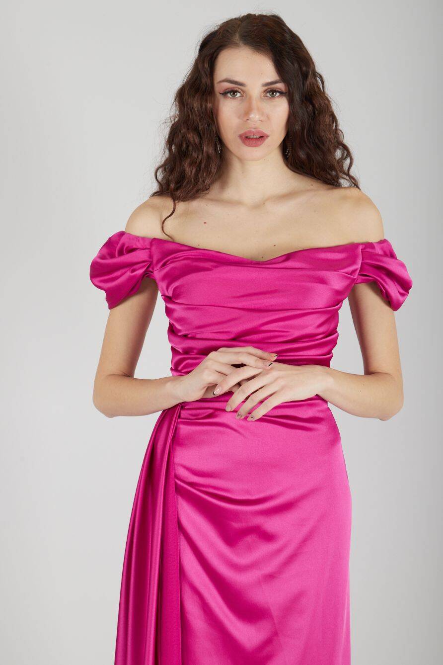 Fuşya Drape Detaylı Saten Kumaş Abiye Elbise 9704858.12