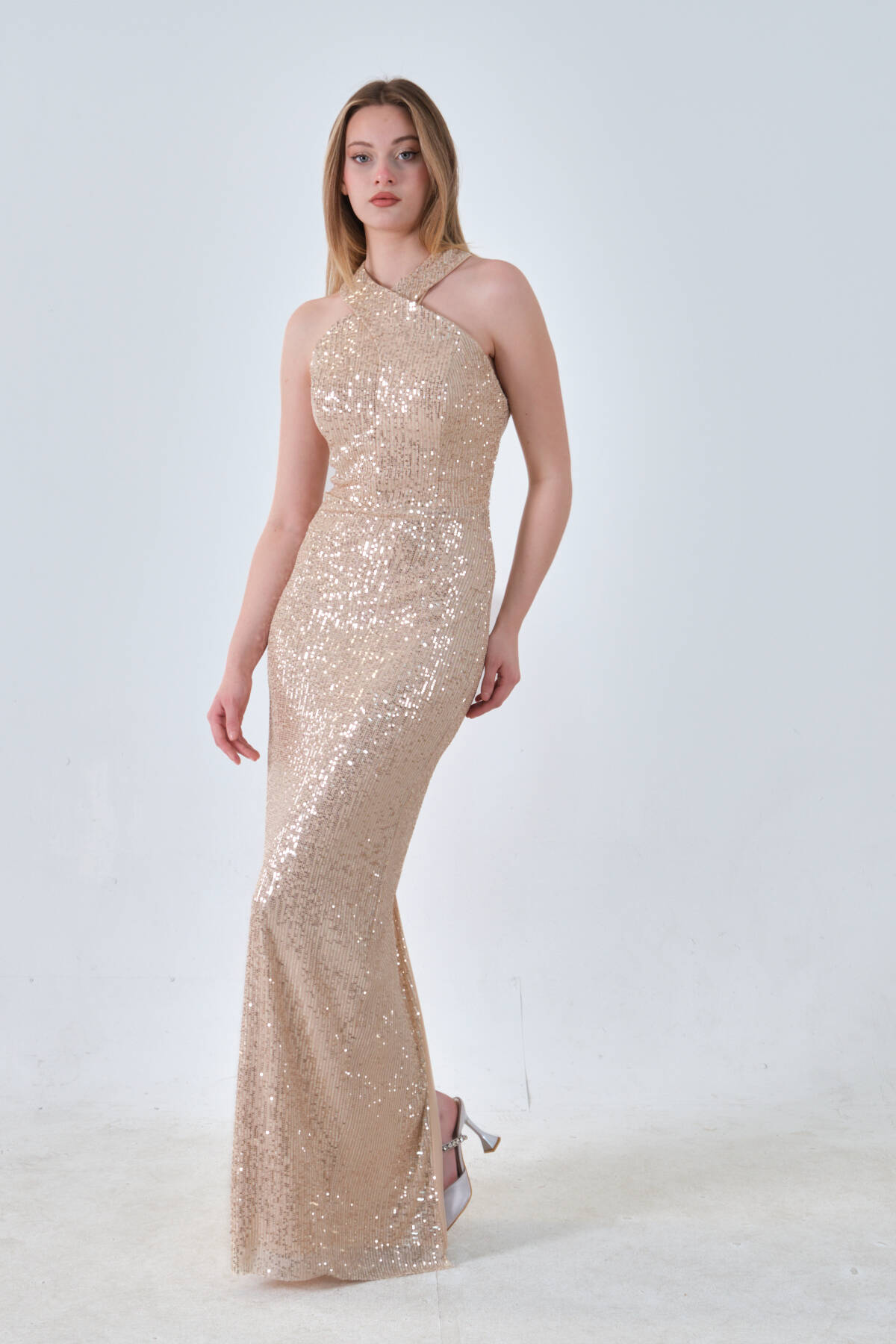 Gold Boyundan Bağlamalı Arkadan Yırtmaç Detaylı Pul Payet Abiye 0801074.122