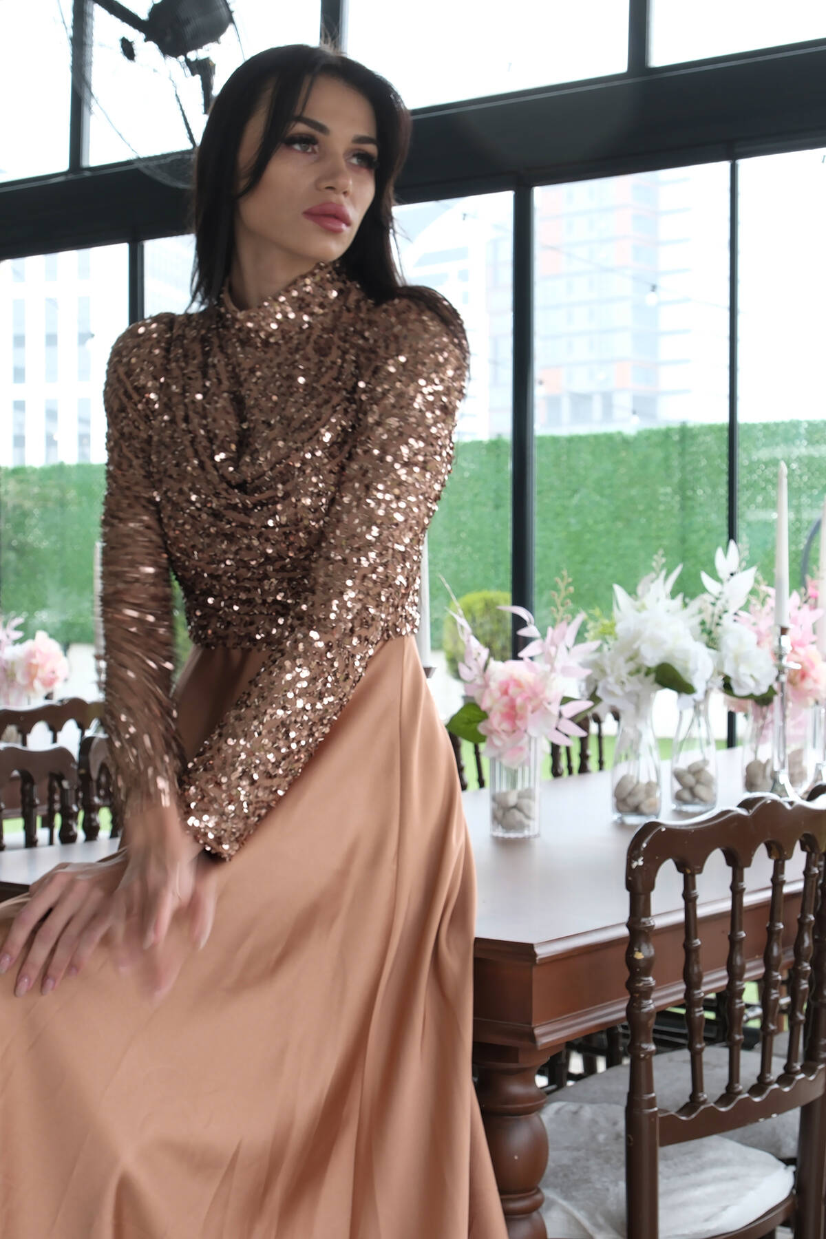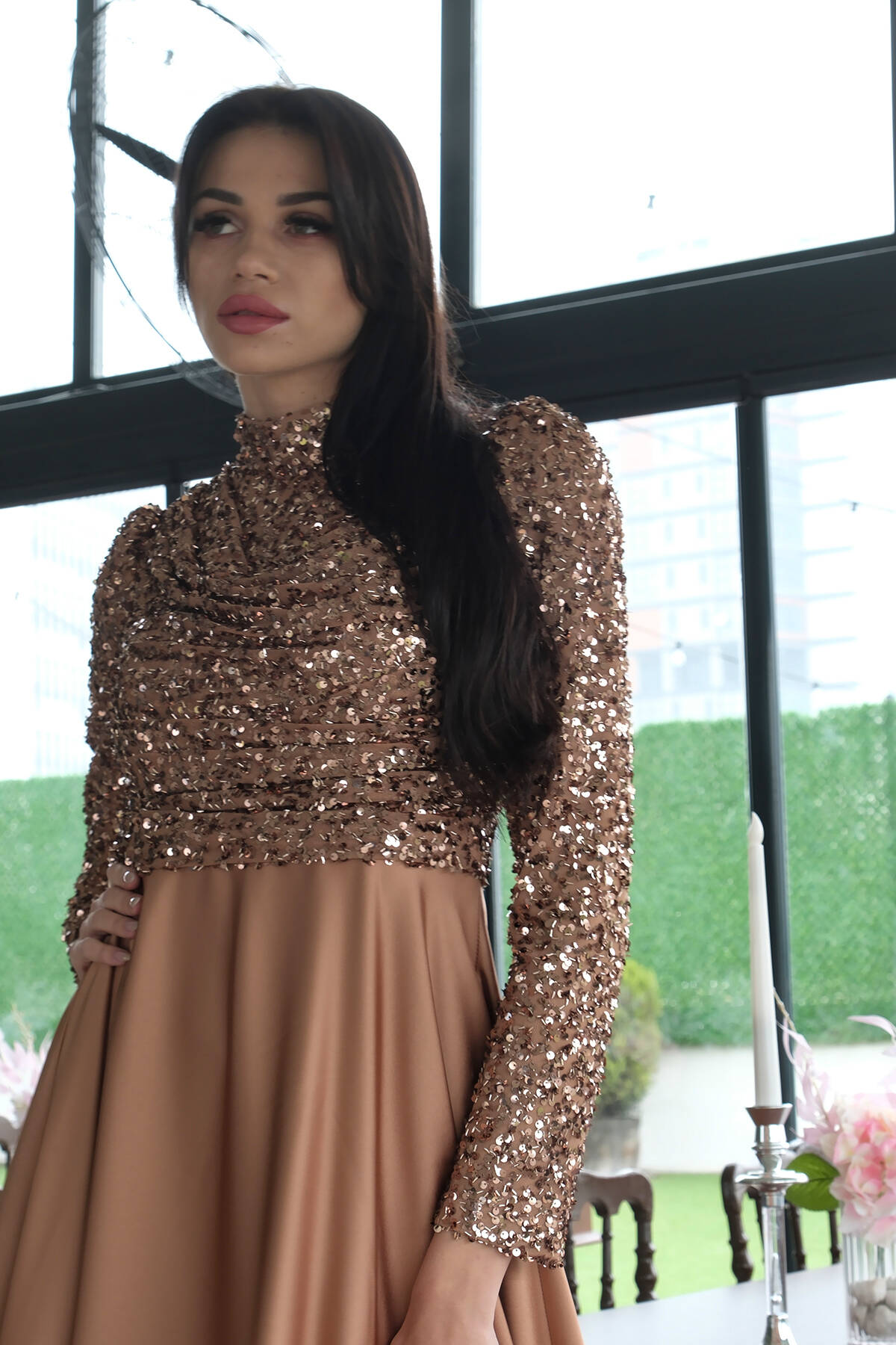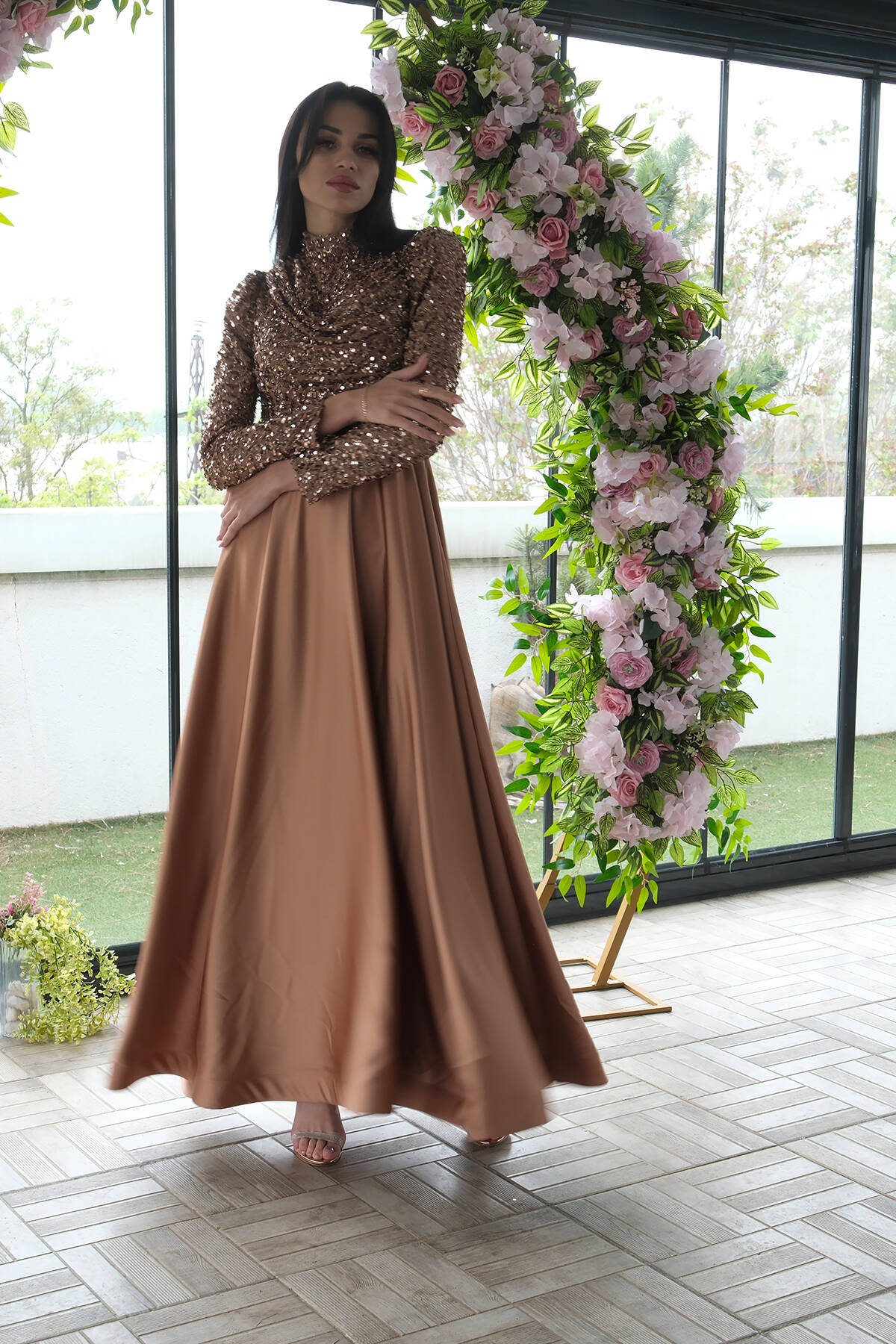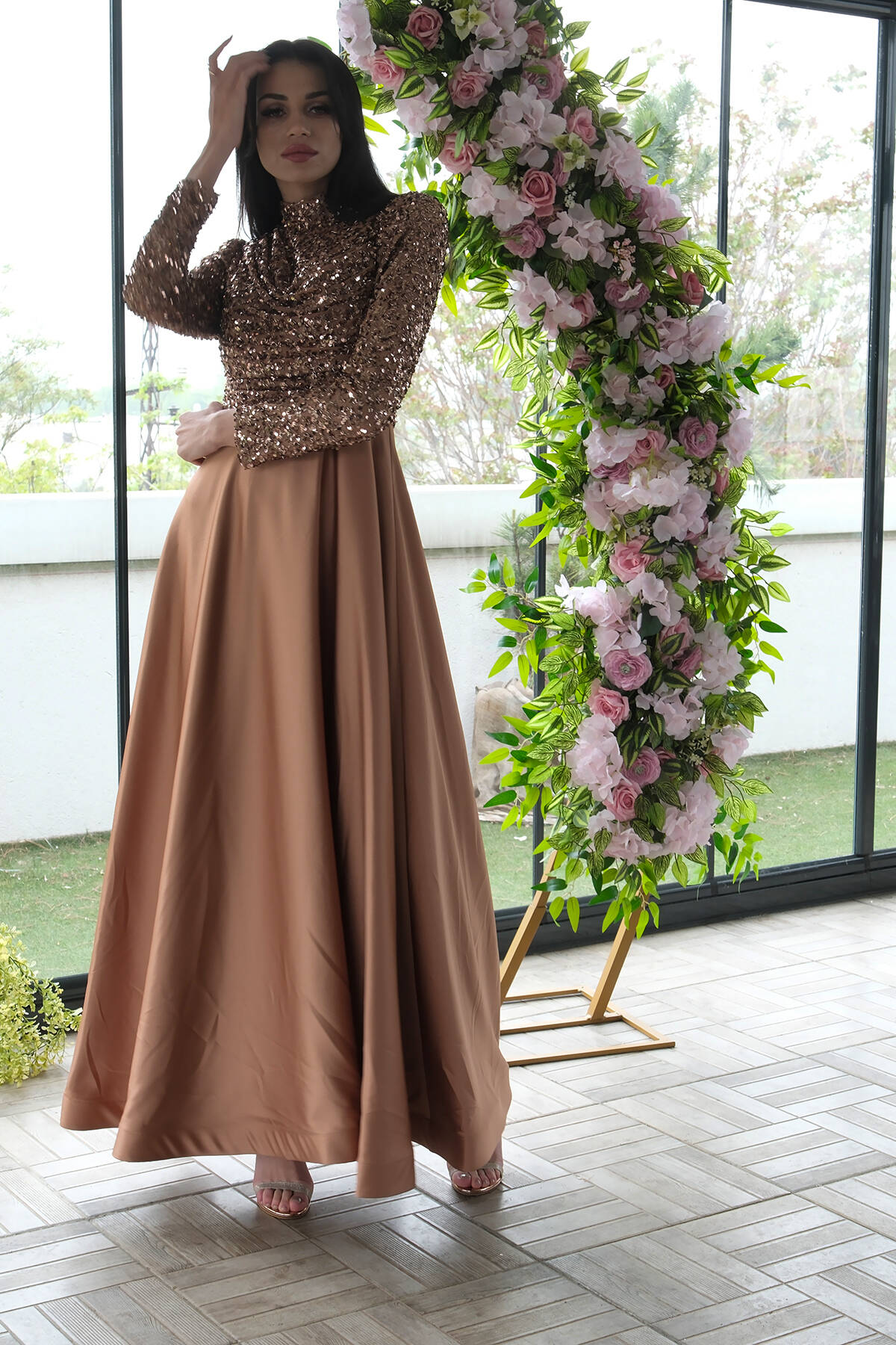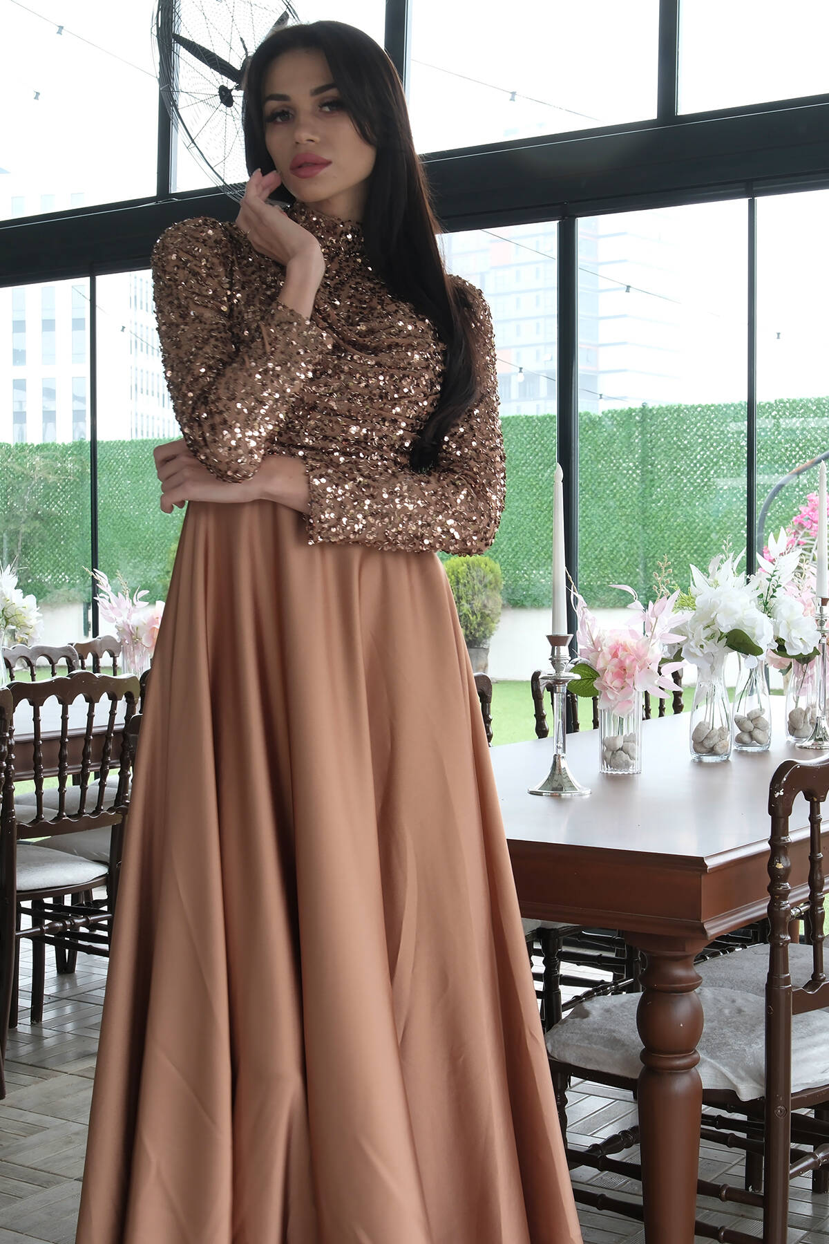Gold Drapeli Payet Üst Detaylı Eteği Saten Tesettür Abiye 6502504.122