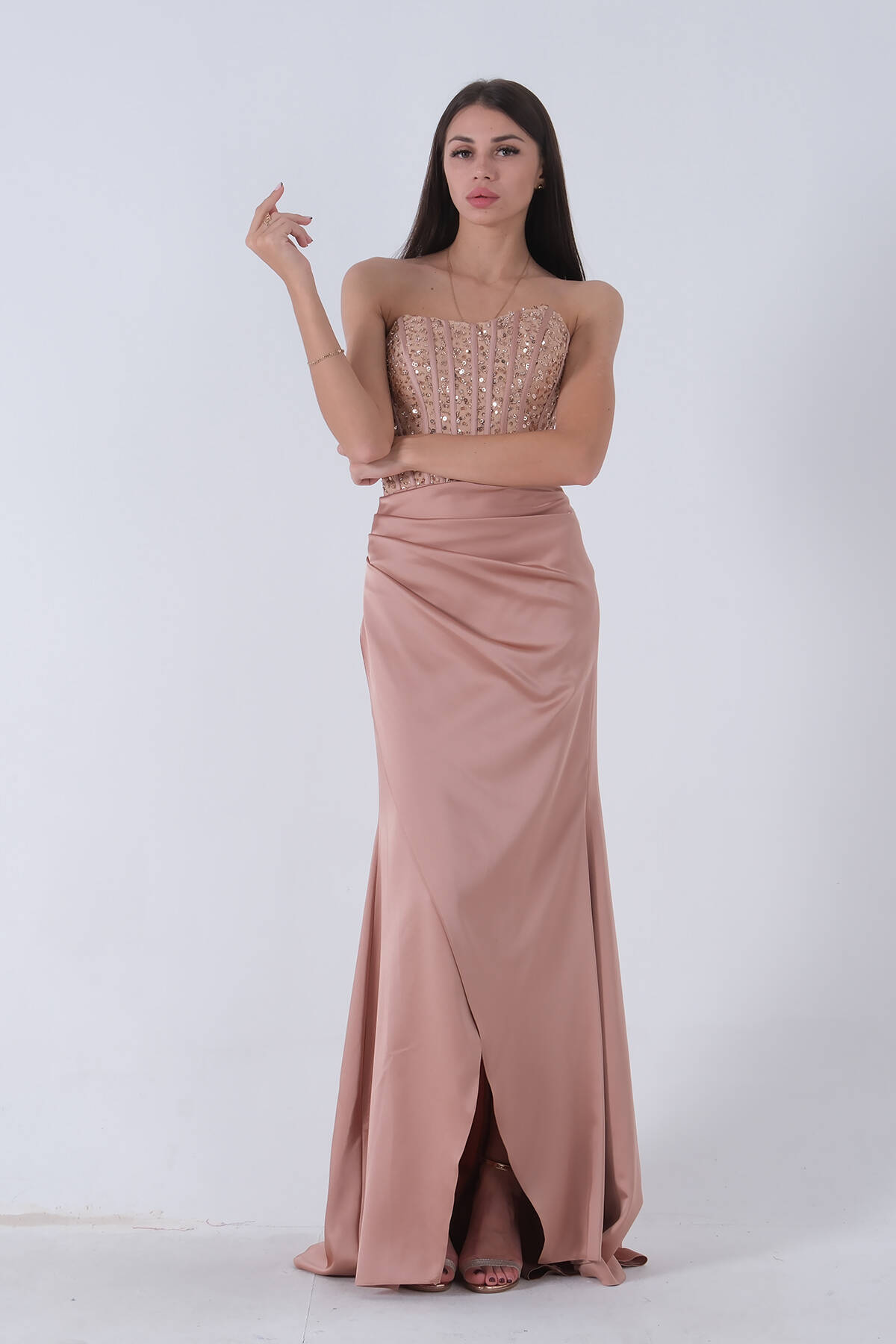 Pudra Önü Taş Detaylı Yırtmaçlı Pul Payet Straplez Abiye 0801163.79