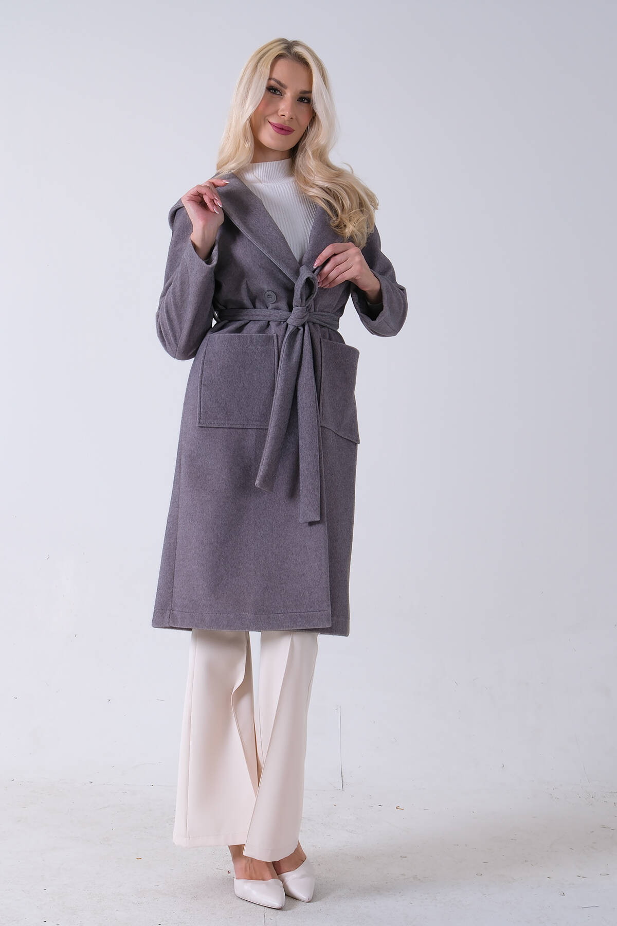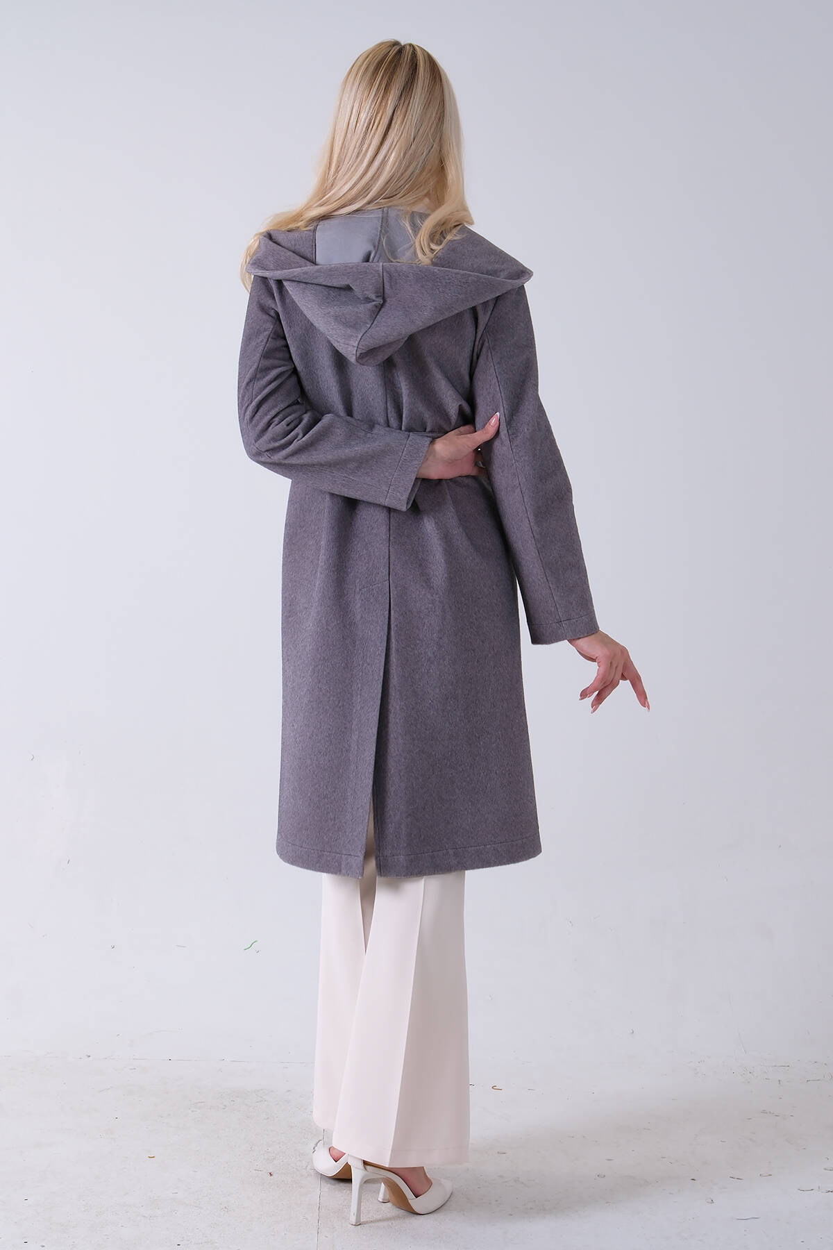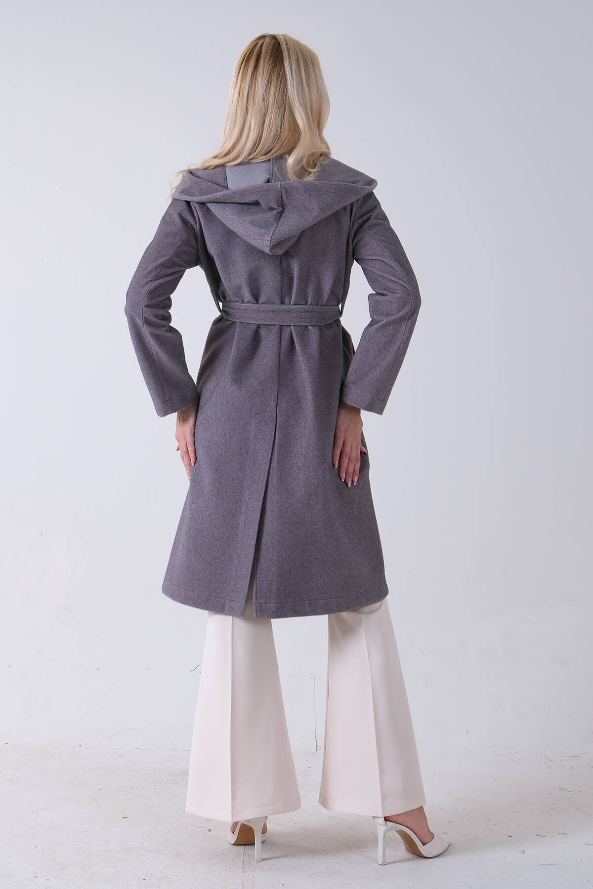 Gri Çift Cepli Kemer Bağlamalı Kapüşonlu Yün Kaban 0108089.06
