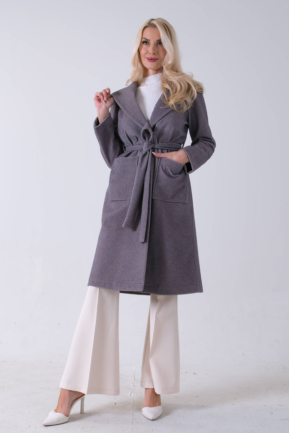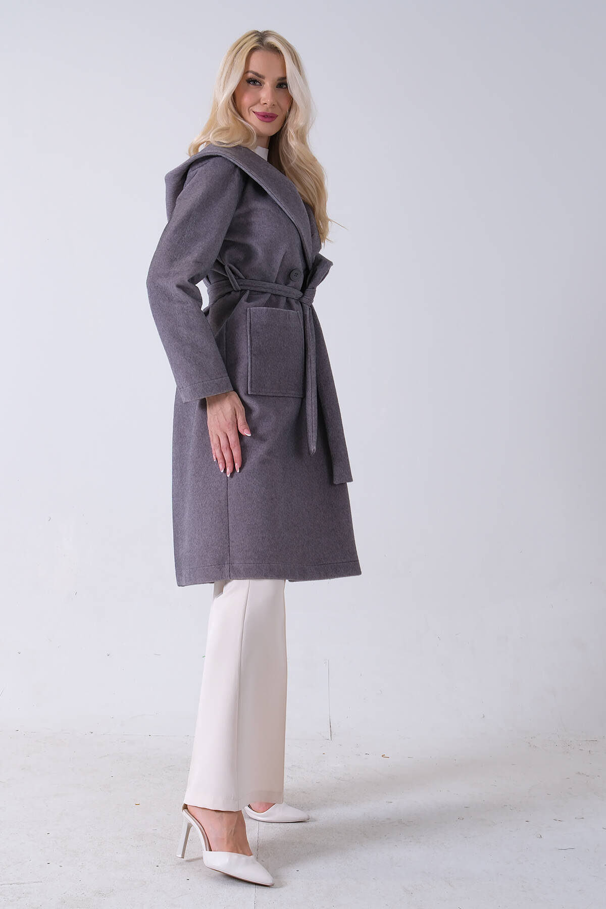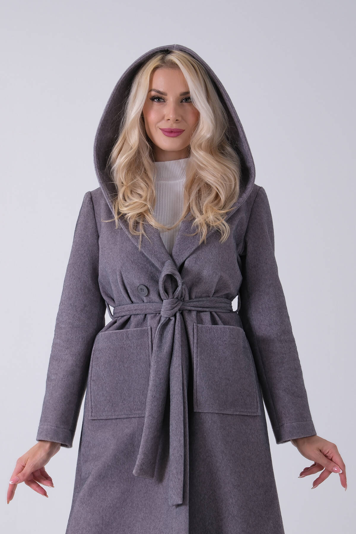 Gri Çift Cepli Kemer Bağlamalı Kapüşonlu Yün Kaban 0108089.06