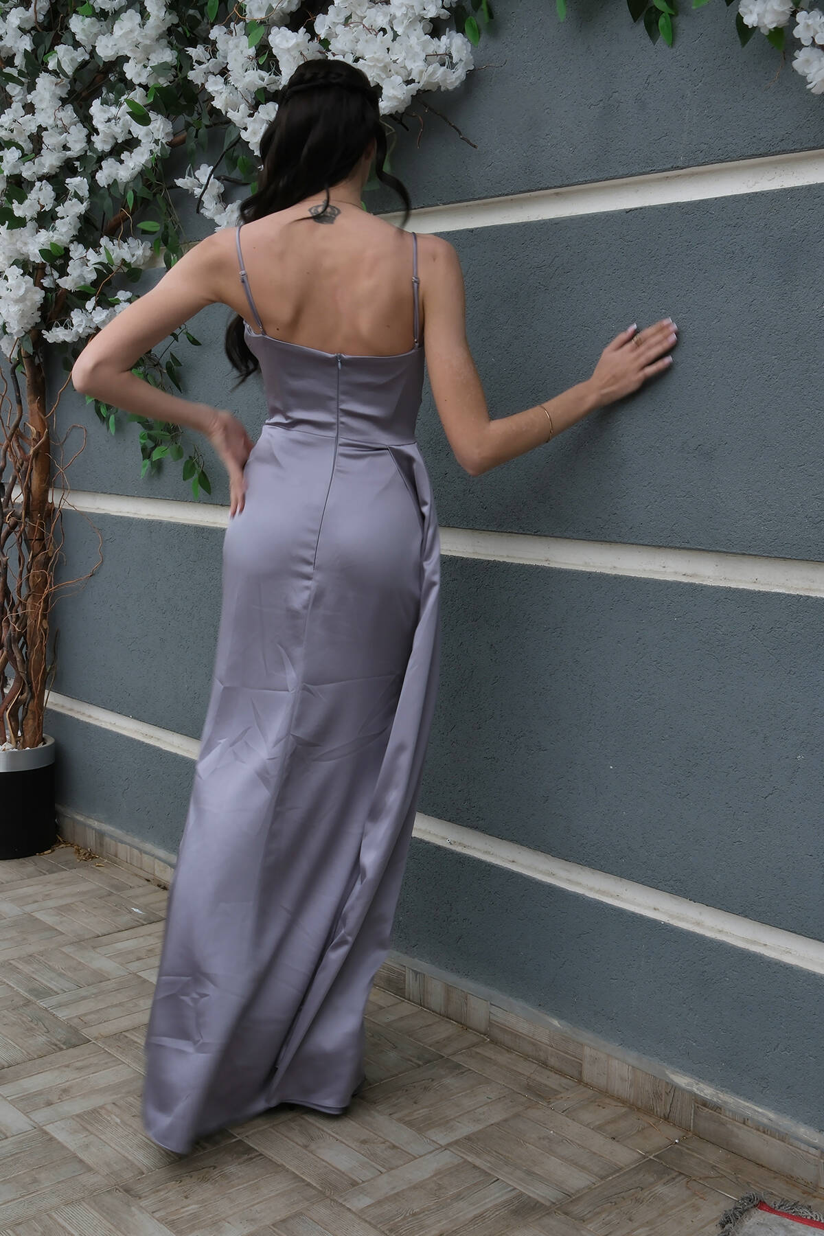 Gri Göğüs Taşlı Yırtmaçlı Kuyruk Detaylı Abiye 0801027.06