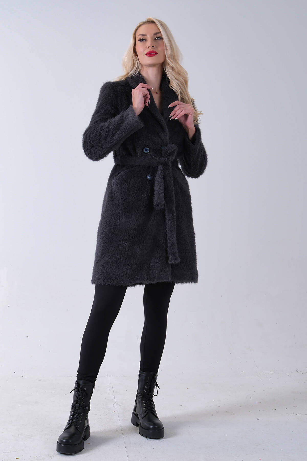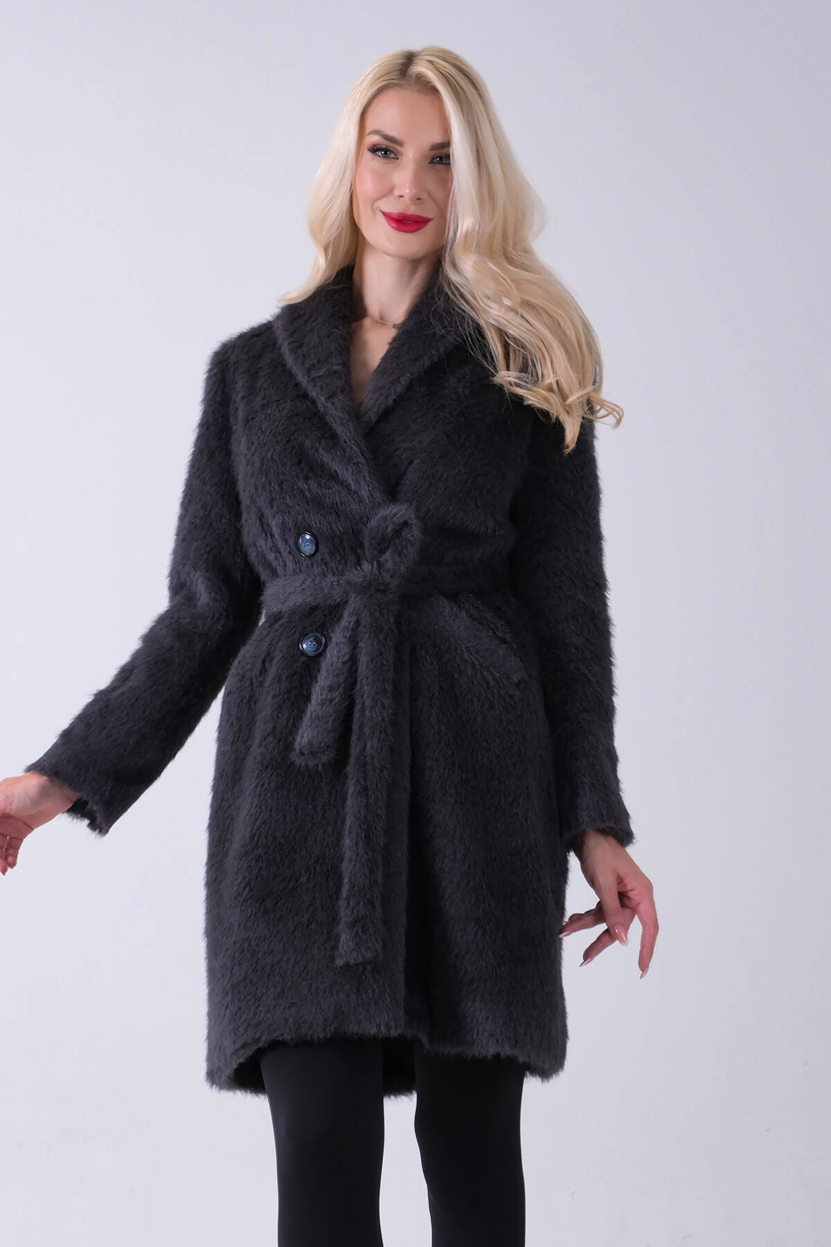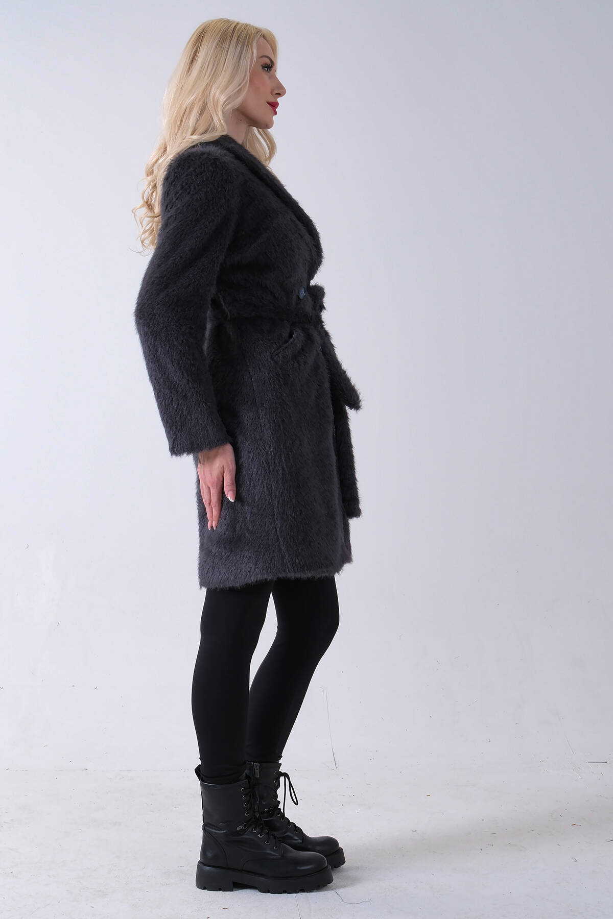 Gri Şal Yaka Çift Cepli Düğme Kapamalı Kemerli Peluş Kaban 0108088.06