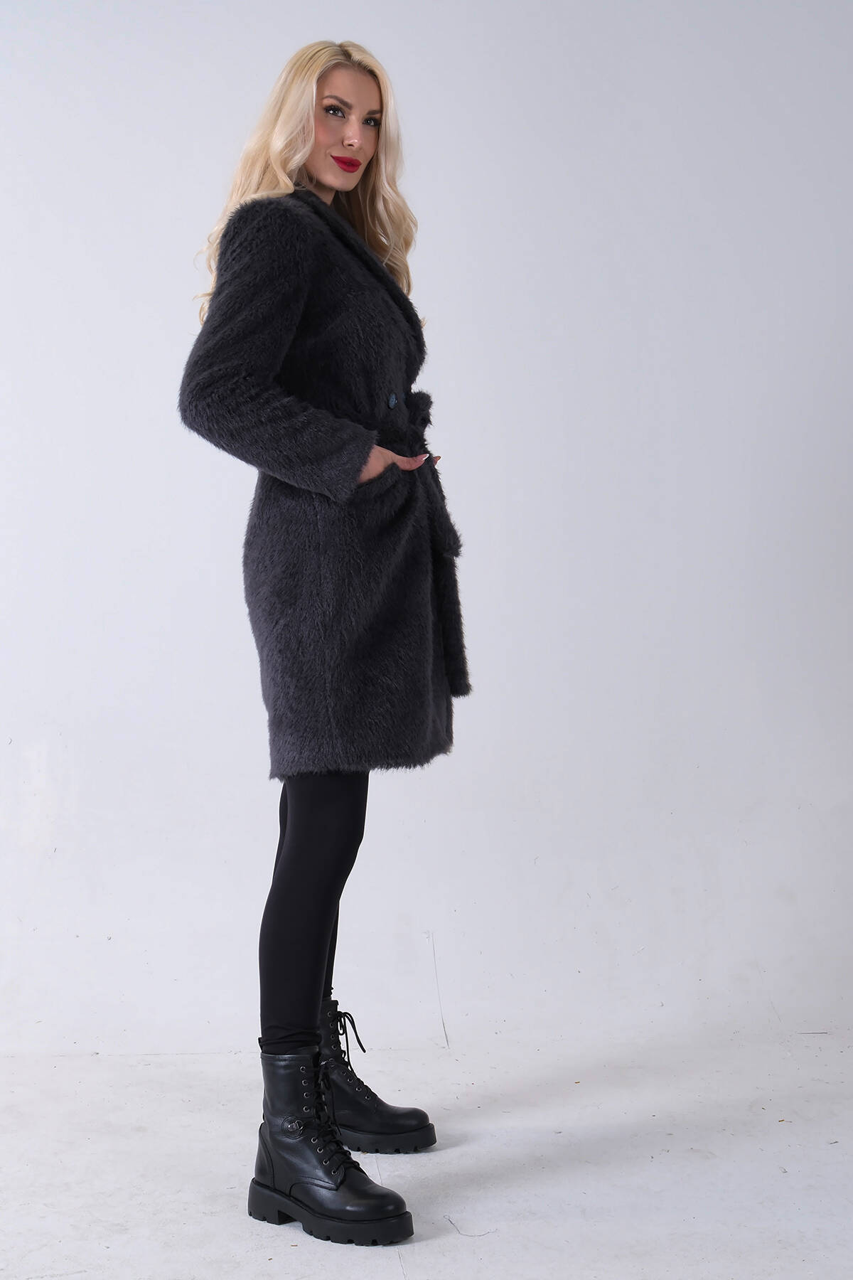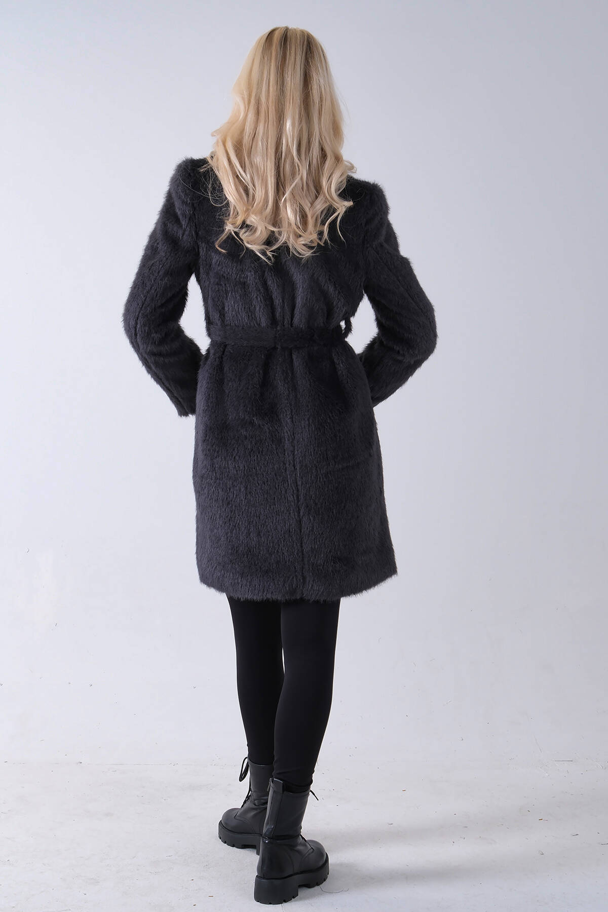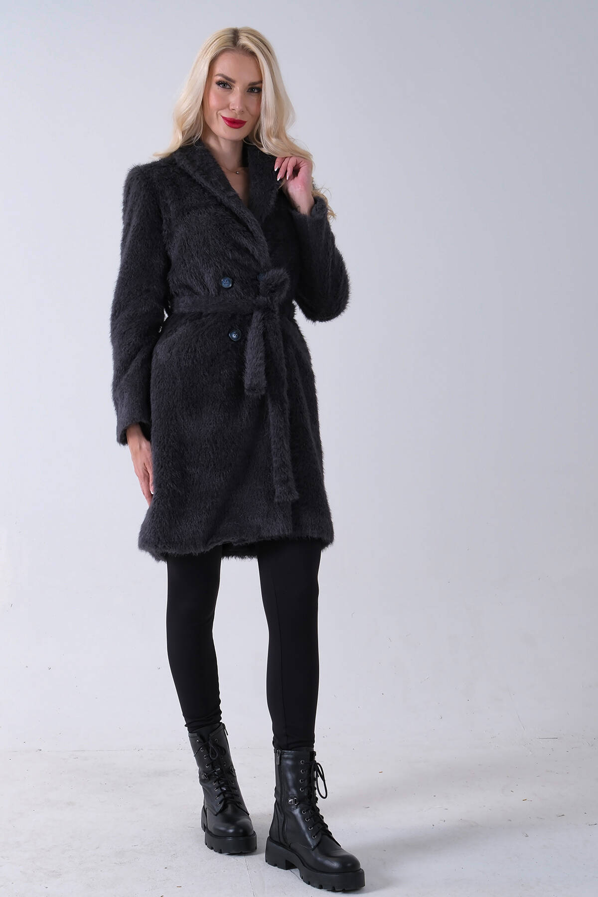 Gri Şal Yaka Çift Cepli Düğme Kapamalı Kemerli Peluş Kaban 0108088.06