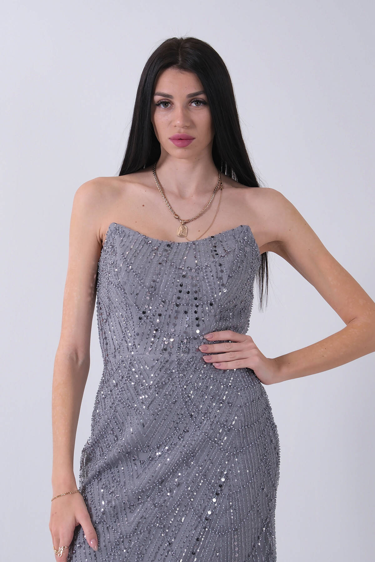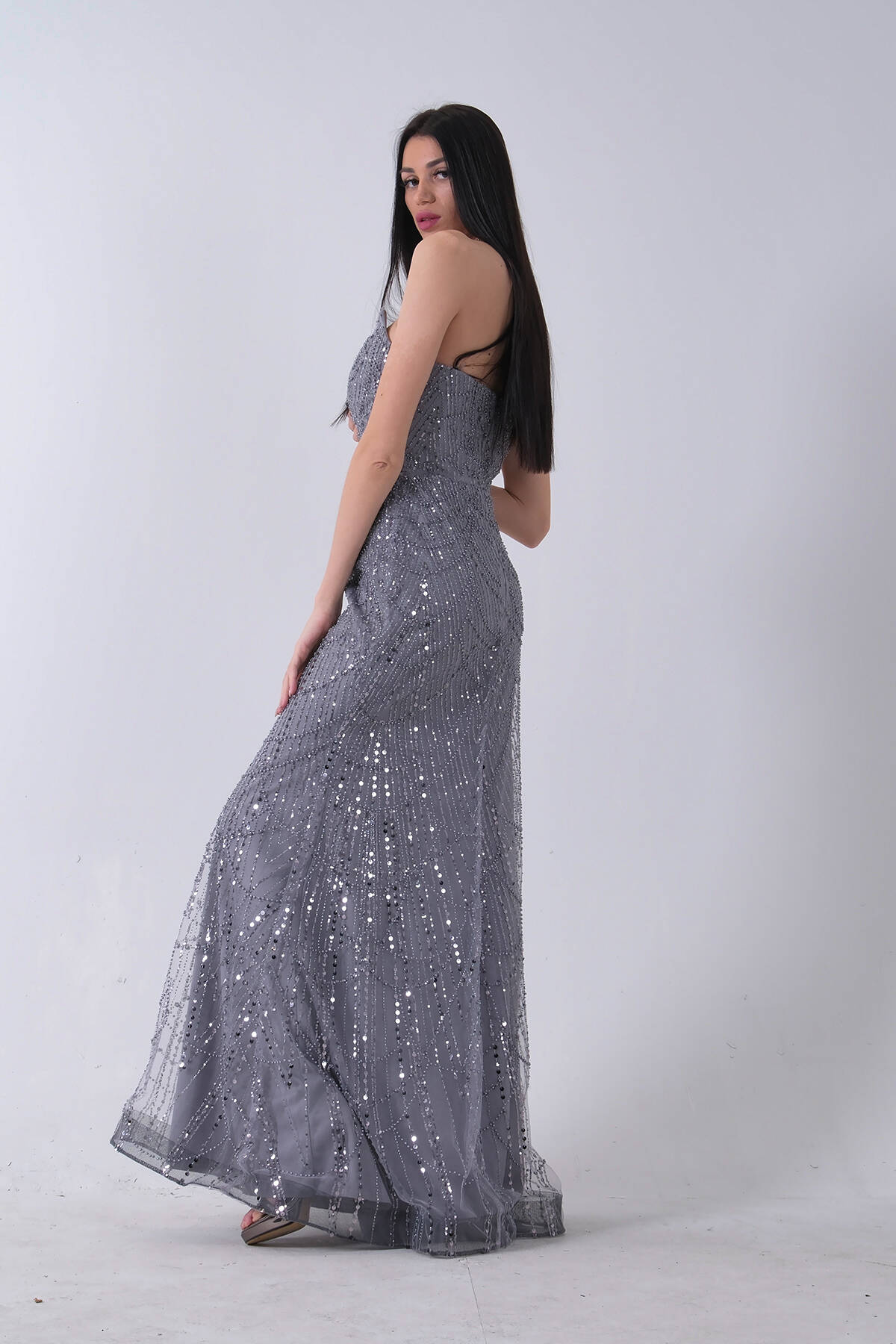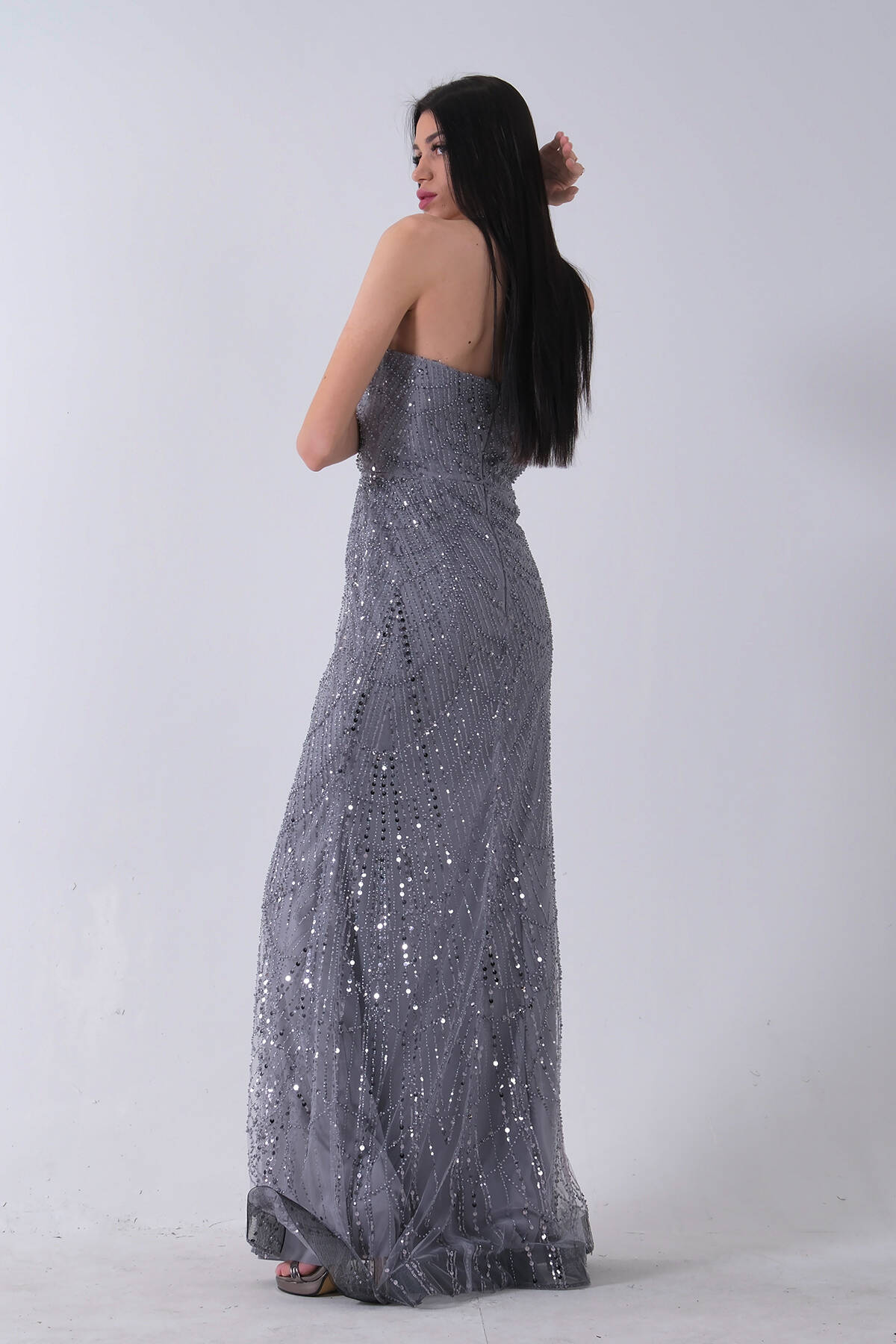 Gri Önü Taş Detaylı Yırtmaçlı Pul Payet Straplez Abiye 0801163.06