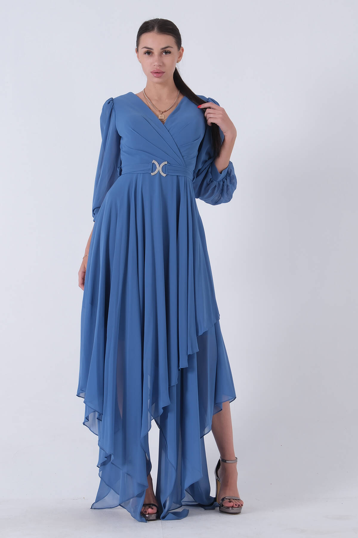Uzun Balon Kol Kruvaze Yaka Seyyar Kemerli Eteği Asimetrik Kesim Şifon Abiye Elbise