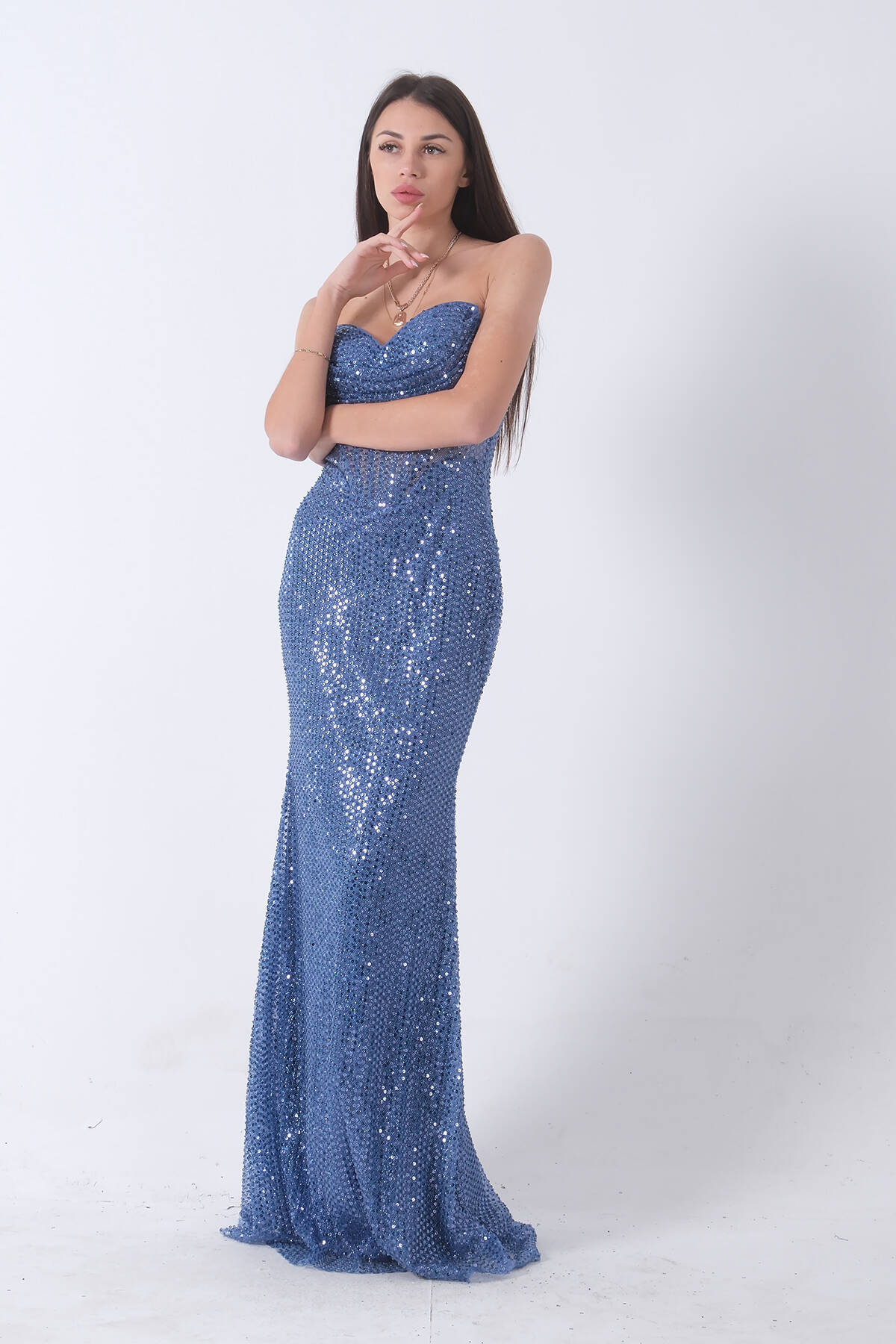 İndigo Pul Taş İşlemeli Straplez Balık Abiye 9705304.98