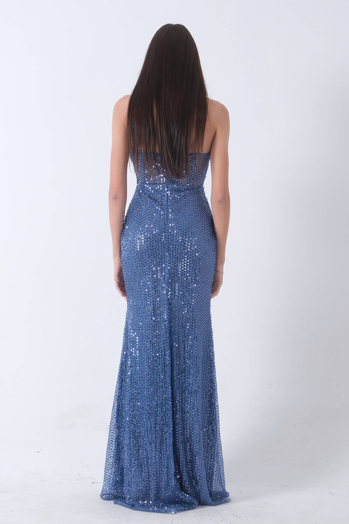 Bebe Mavi Önü Taş Detaylı Yırtmaçlı Pul Payet Straplez Abiye 0801163.449