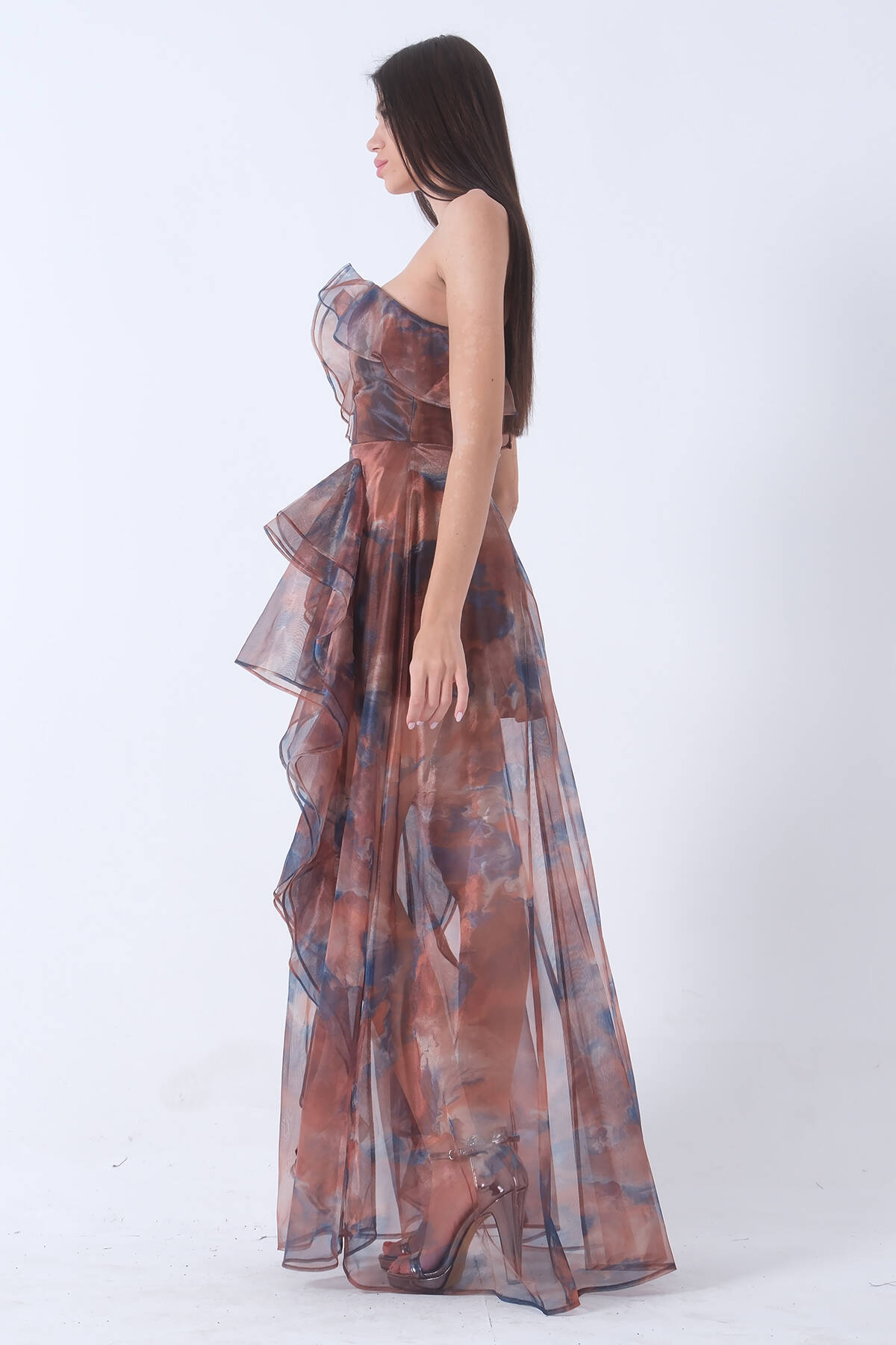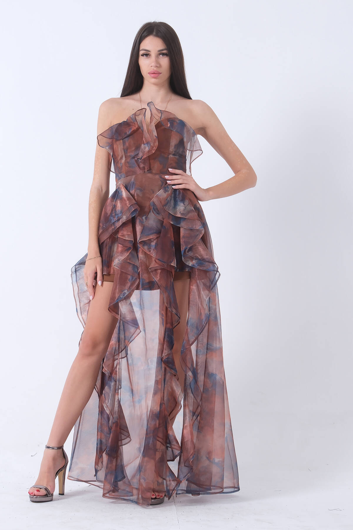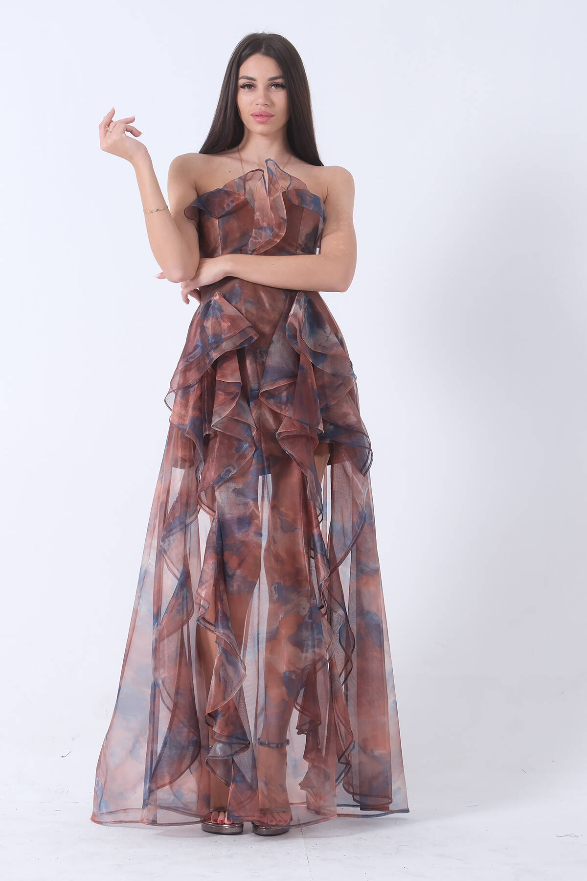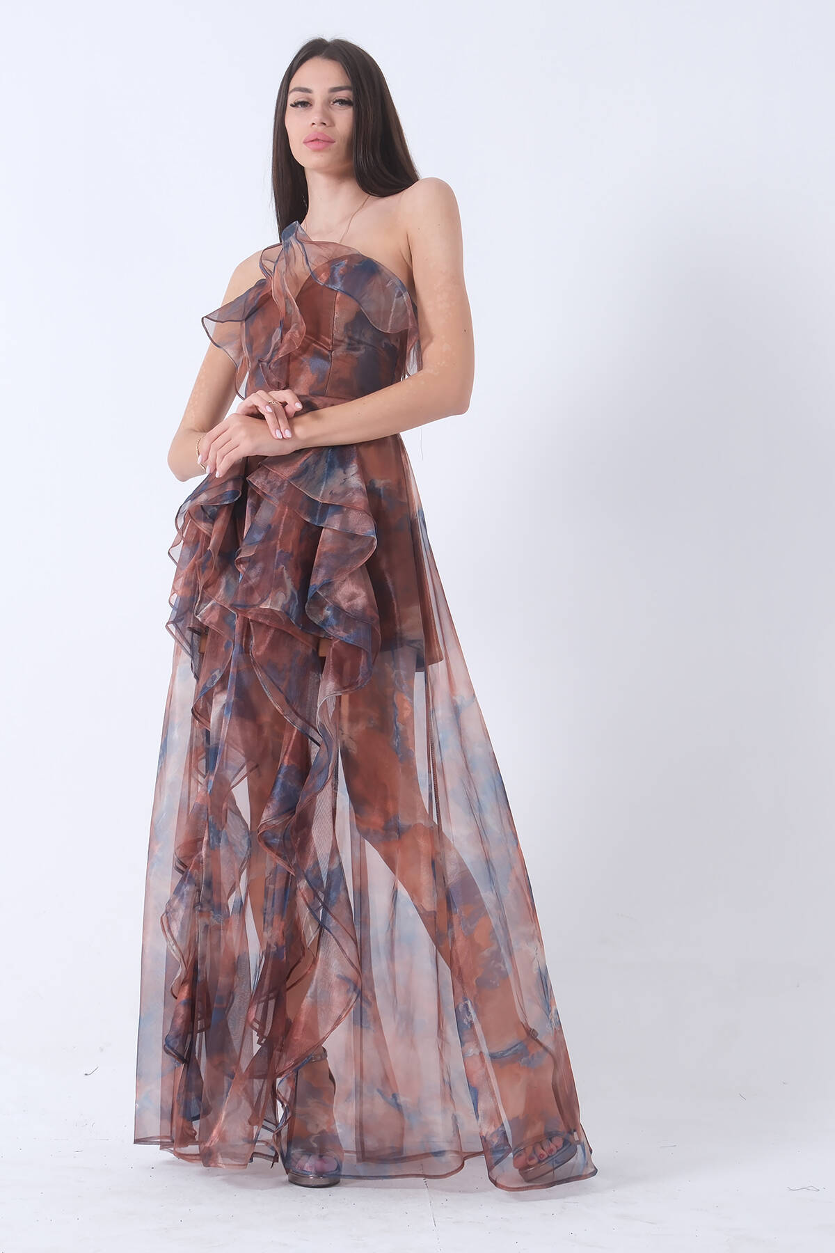Kahve Fırfırlı Tül Şifon Abiye Elbise 0802000.05