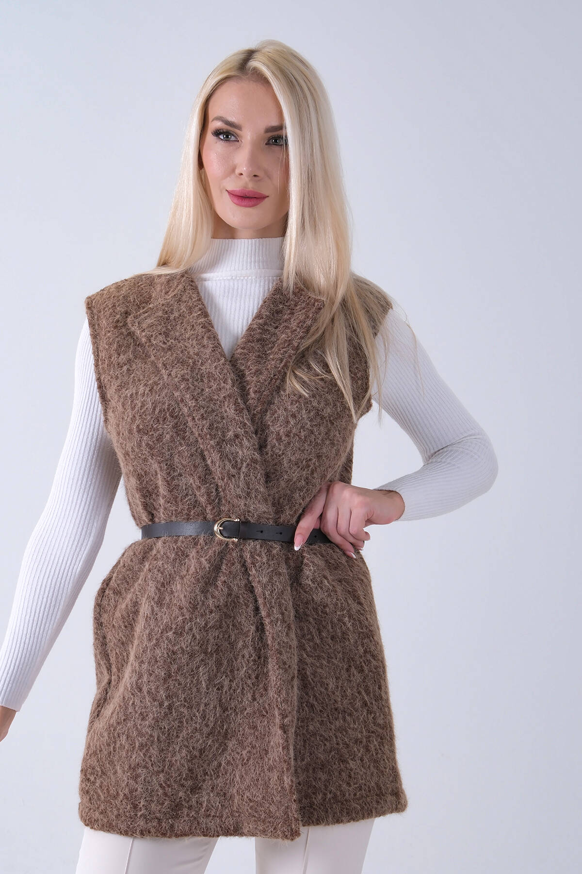 Kahve Yakalı Cepli 2 Düğmeli Kemer Bağlamalı Kaşe Yelek 5307107.05