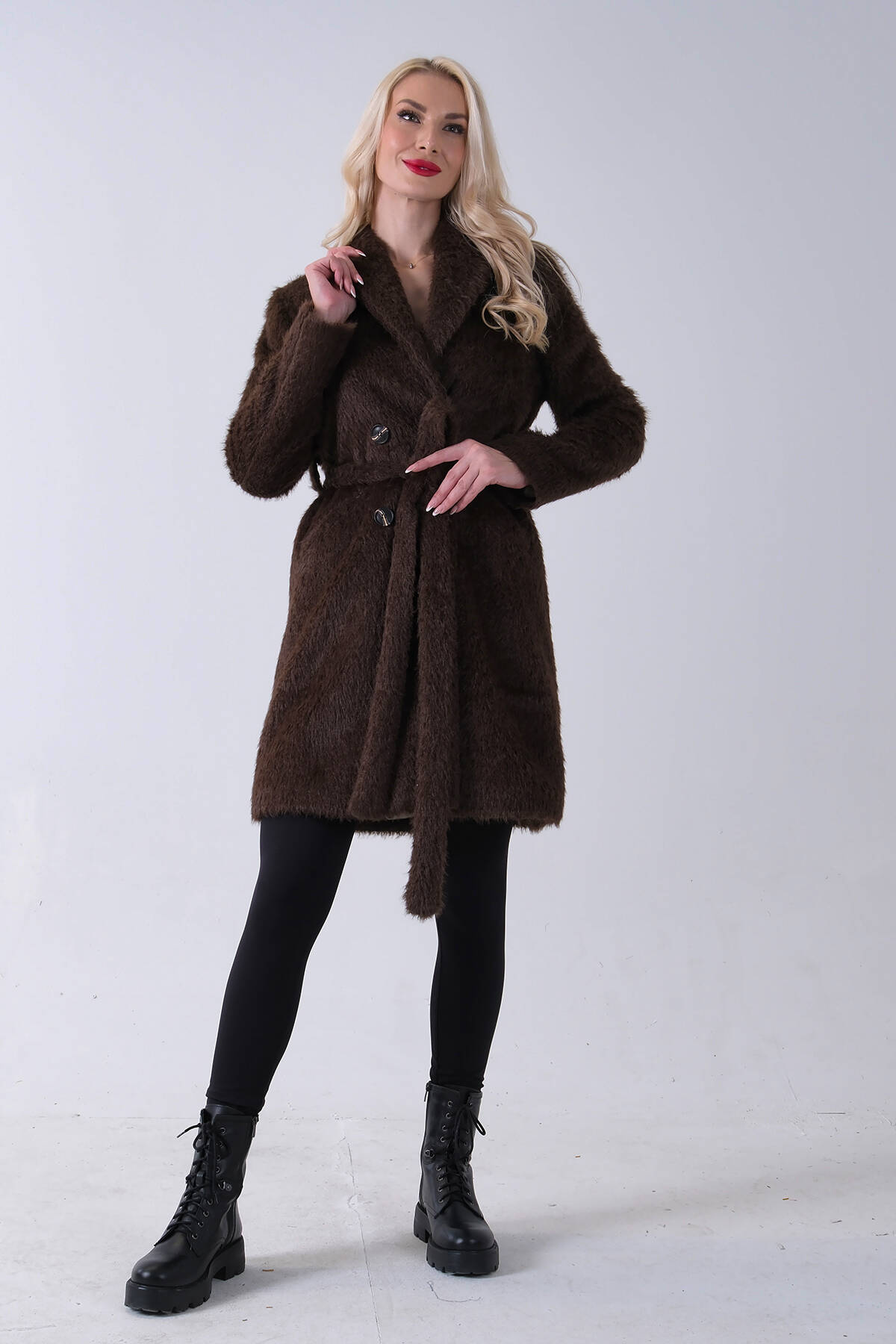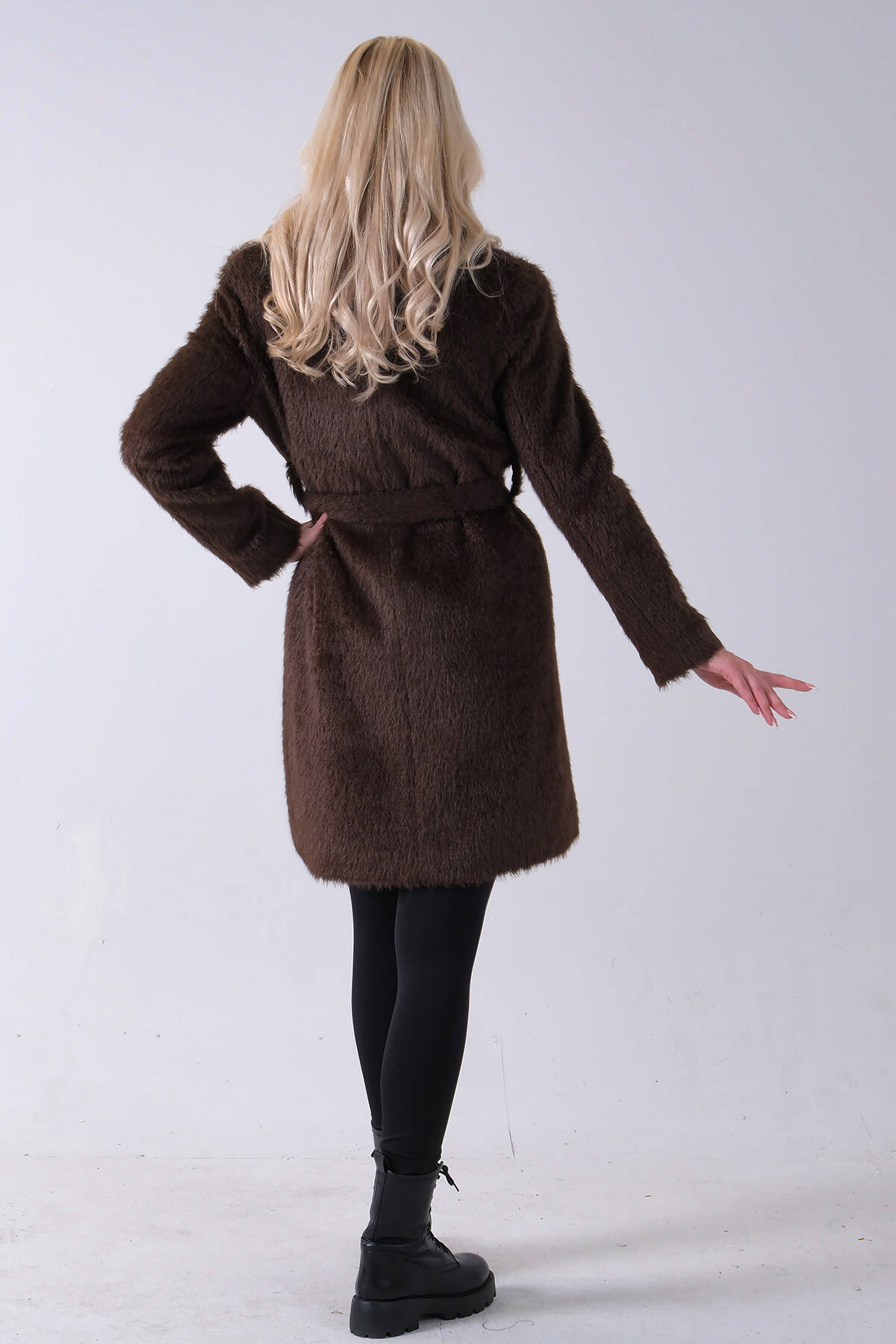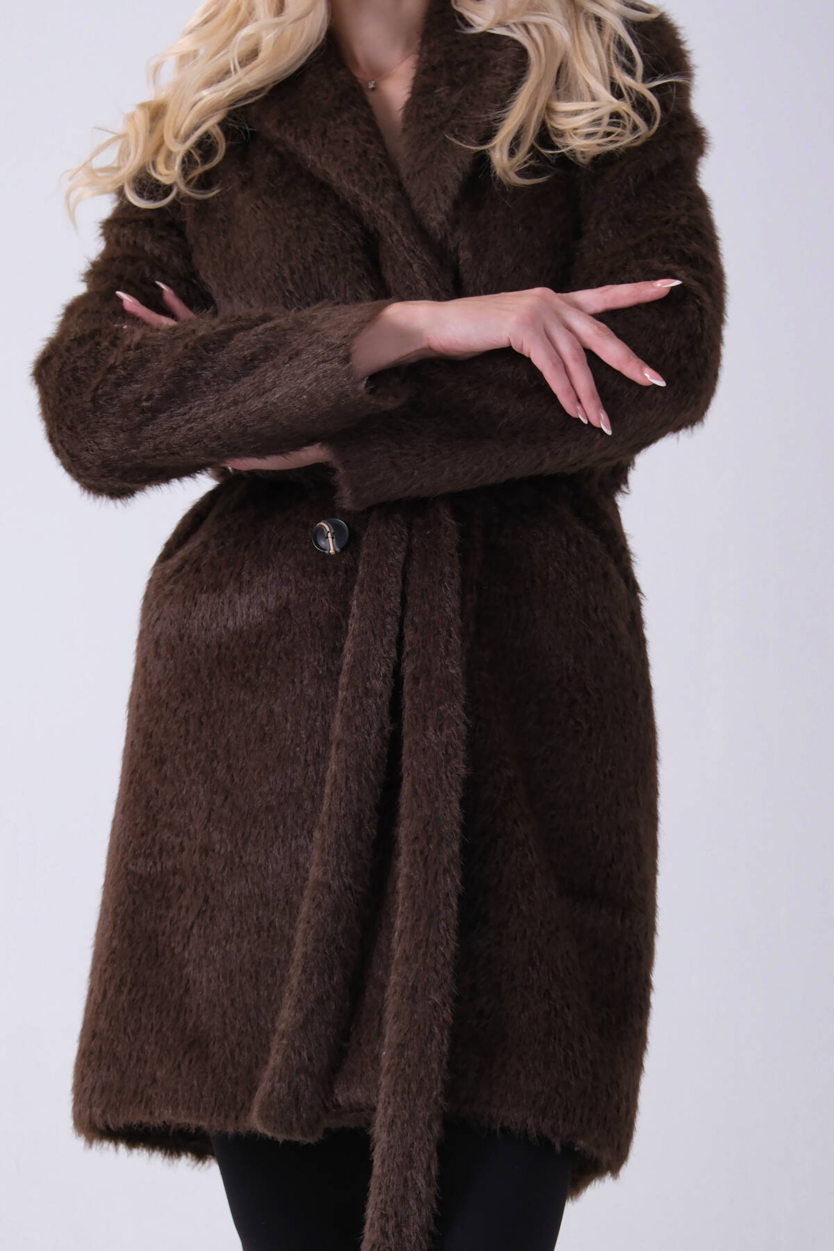 Kahve Şal Yaka Çift Cepli Düğme Kapamalı Kemerli Peluş Kaban 0108088.05