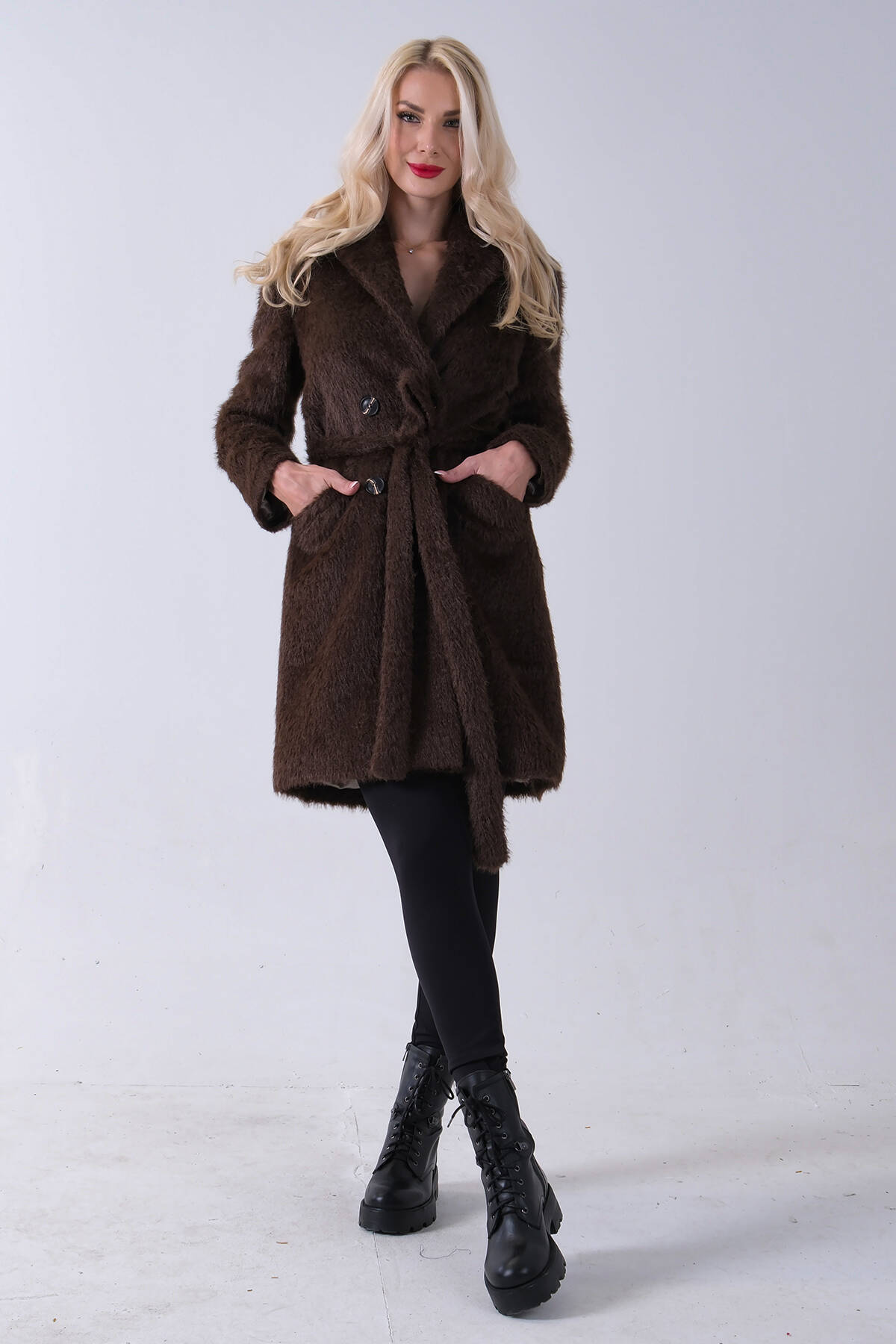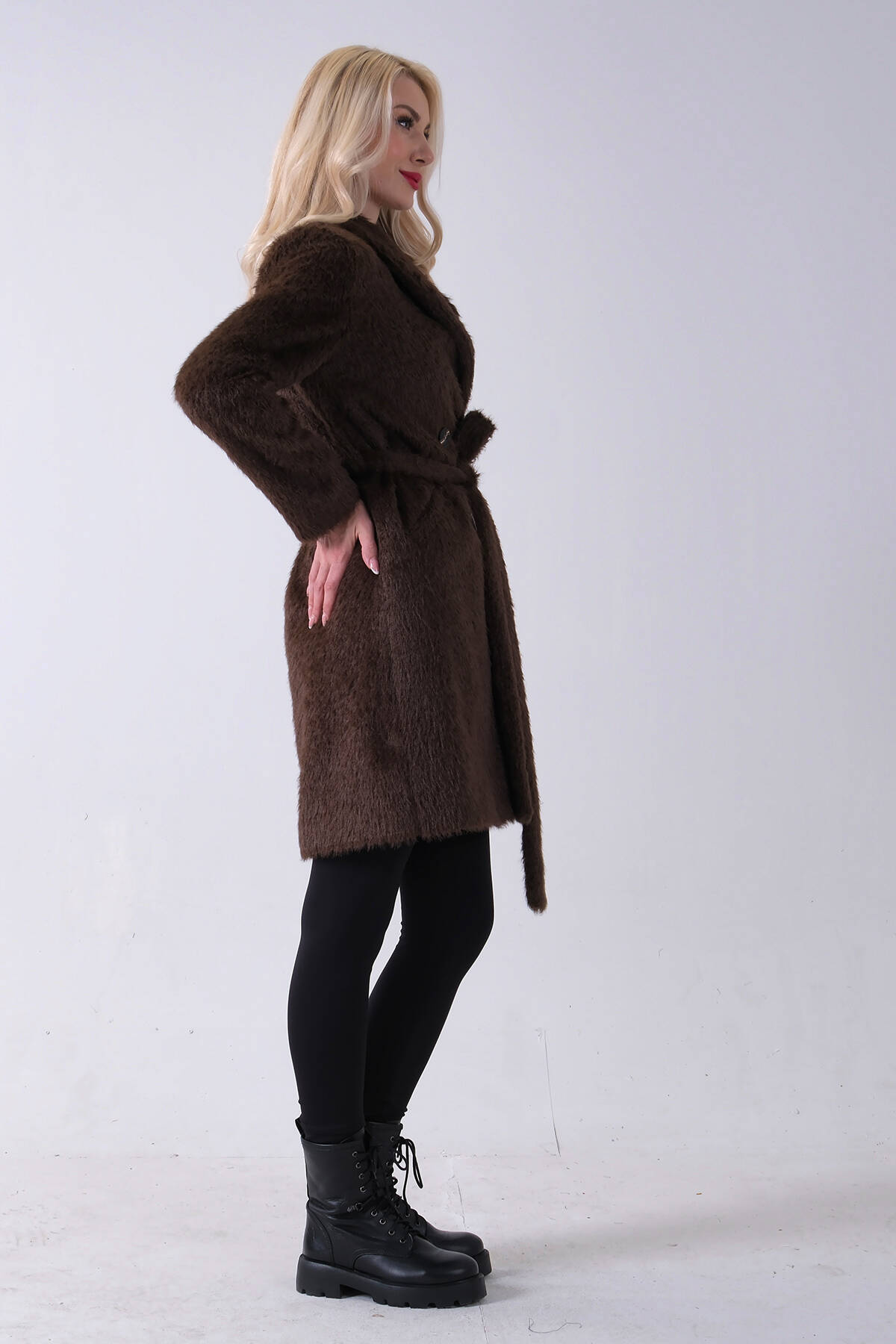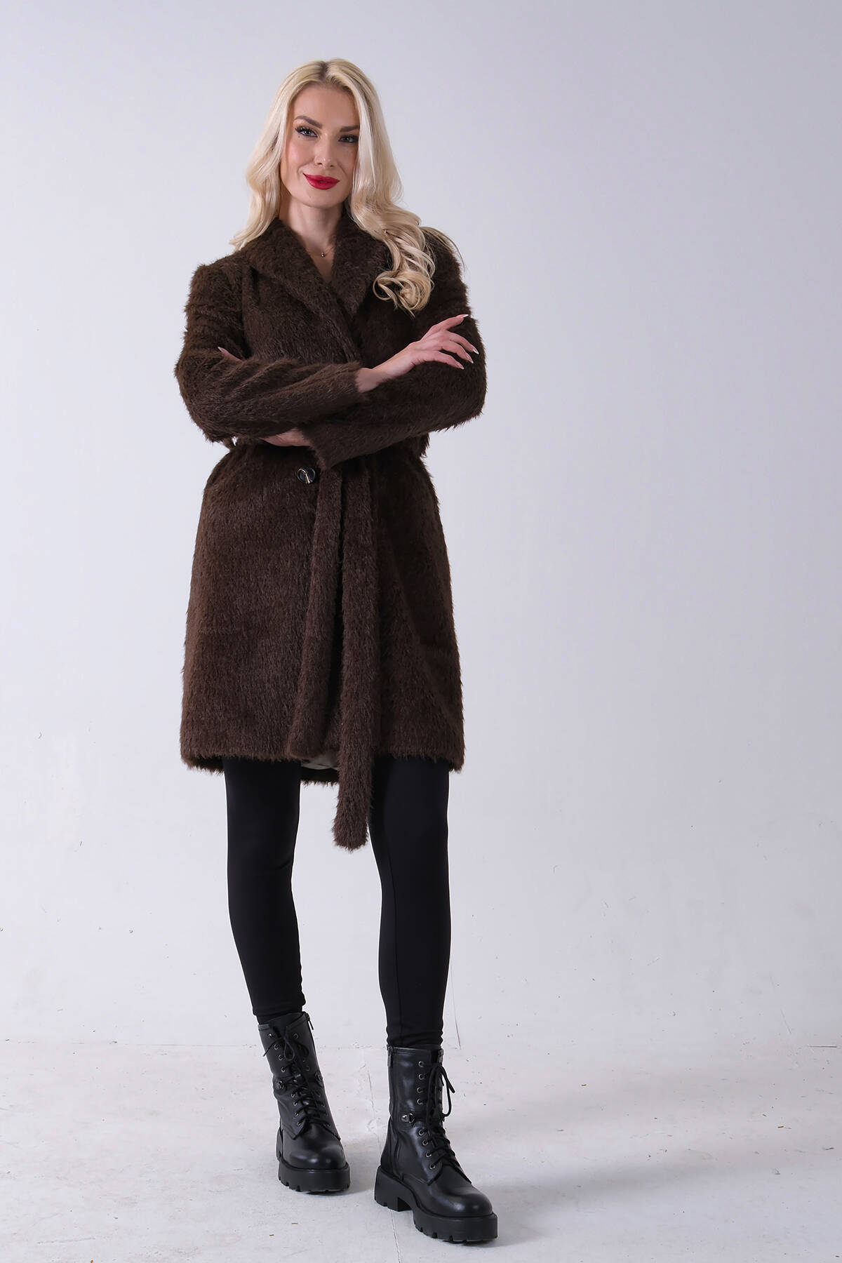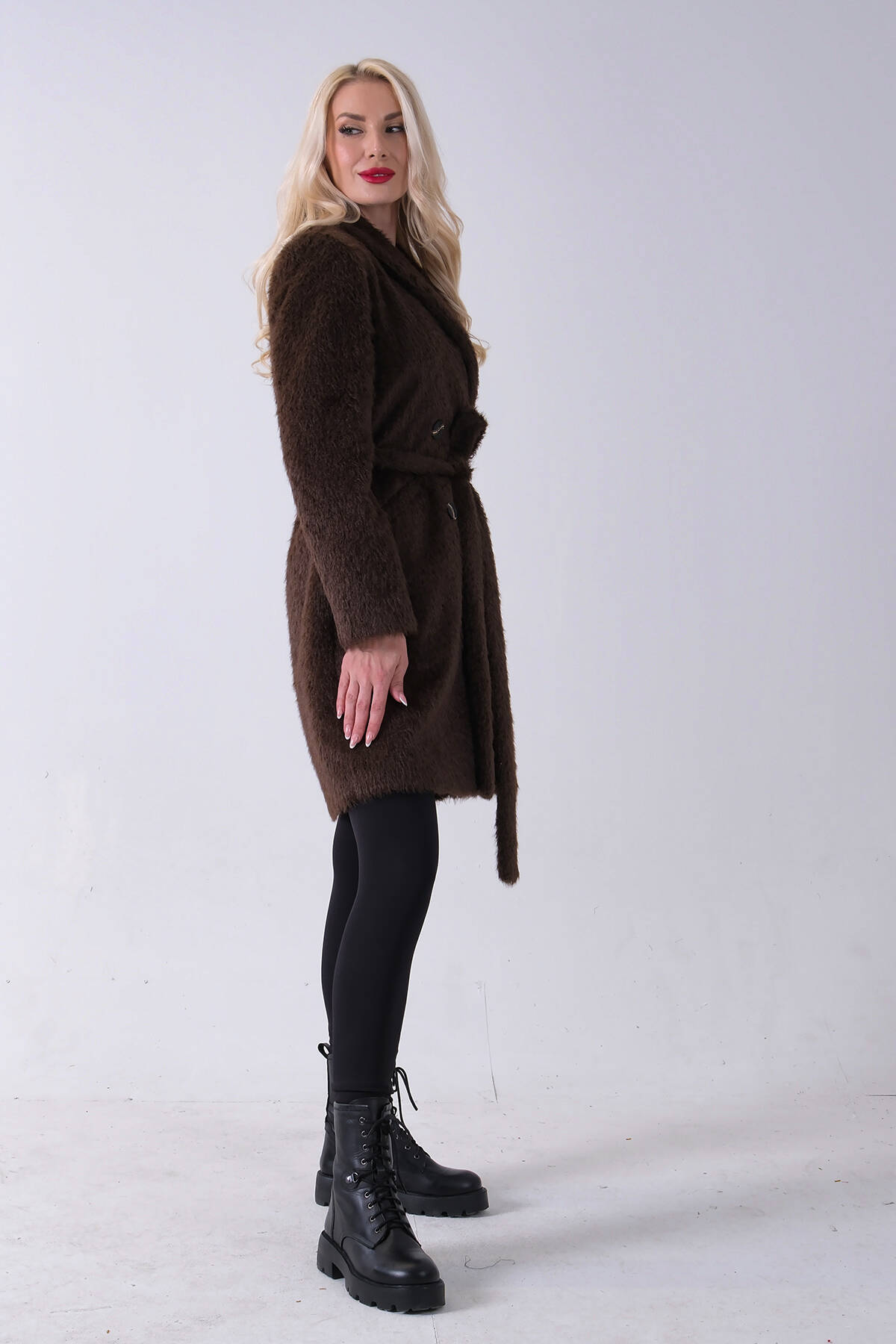 Kahve Şal Yaka Çift Cepli Düğme Kapamalı Kemerli Peluş Kaban 0108088.05