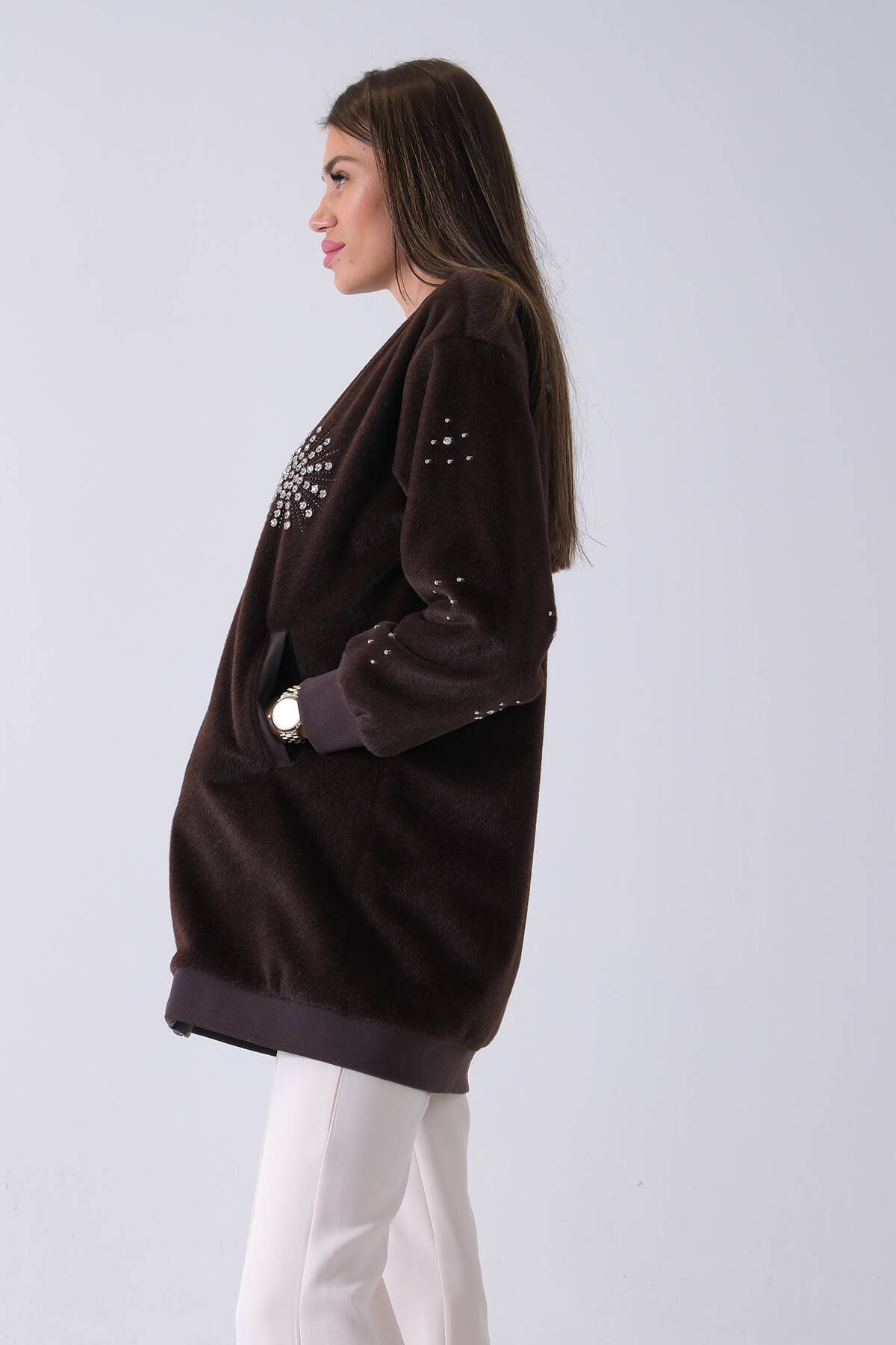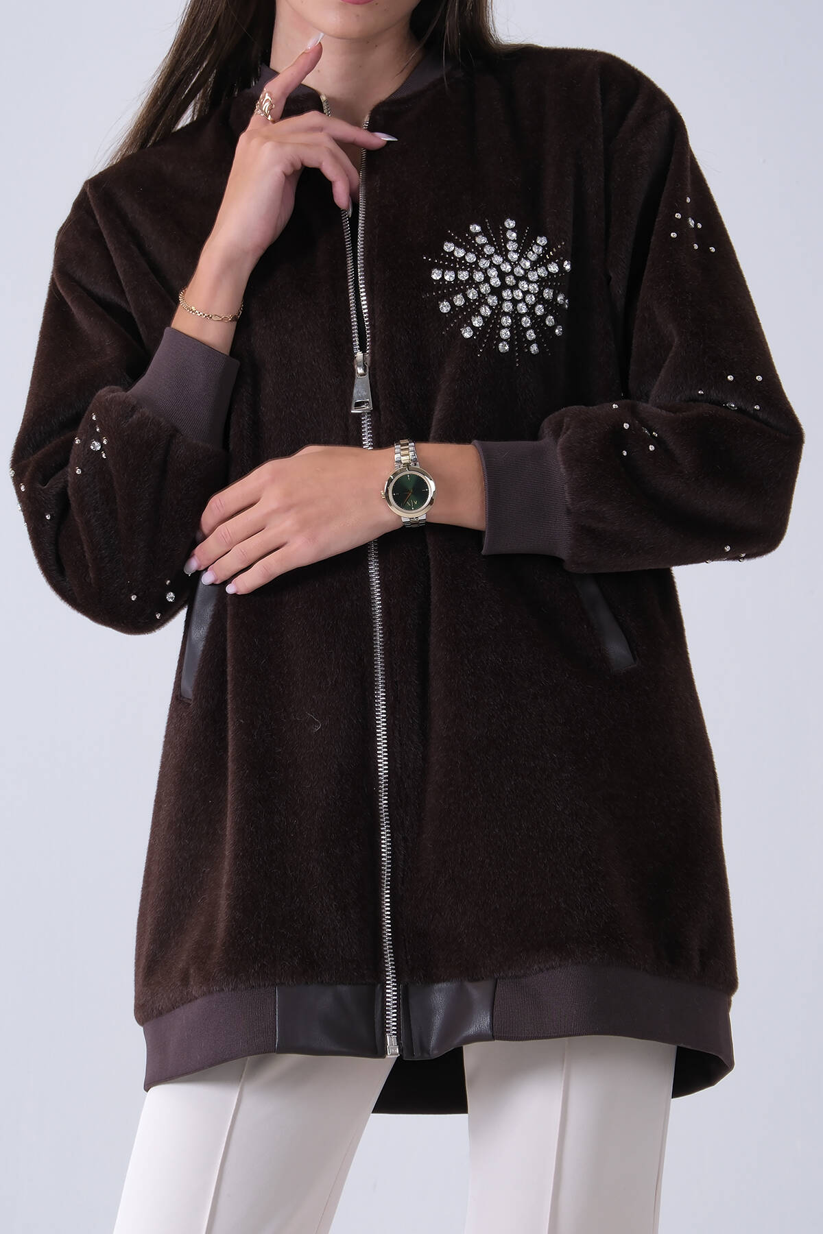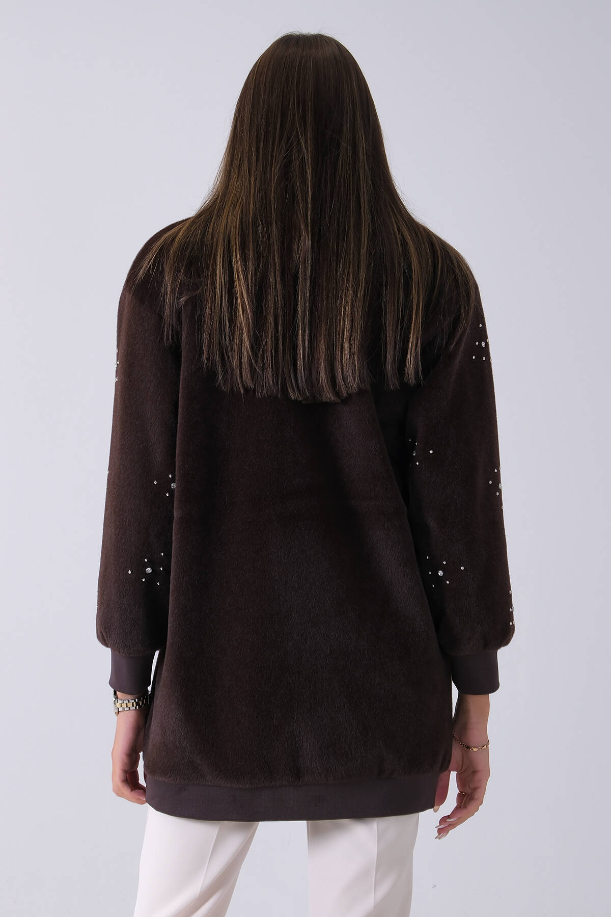 Kahve Üzeri Taş Detaylı Yandan Cepli Peluş Hırka 4701420.05