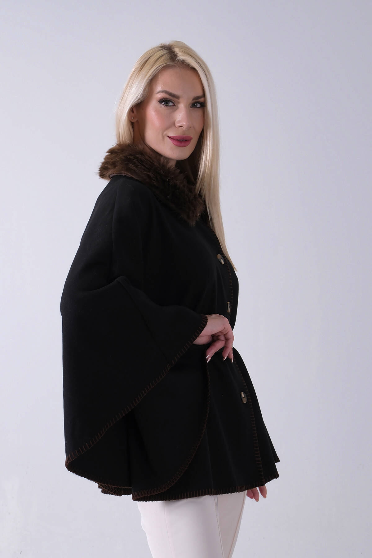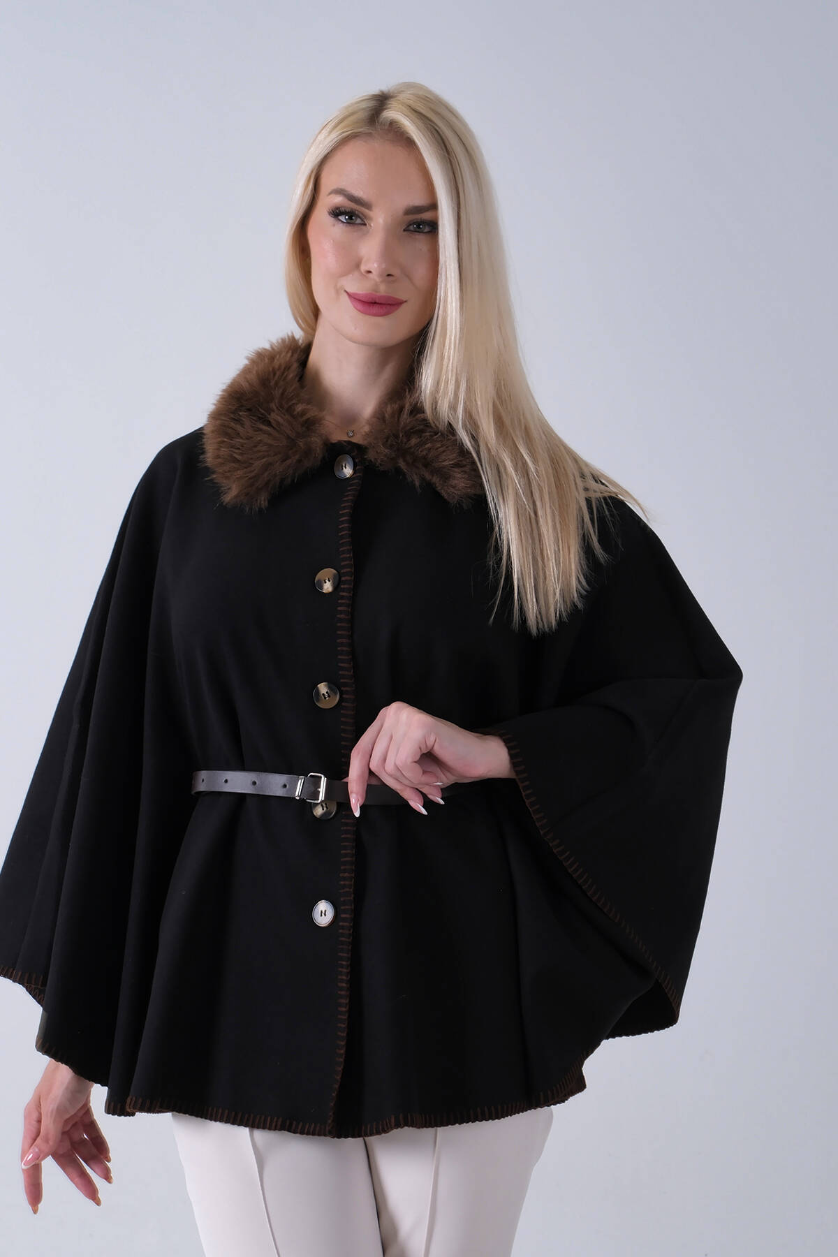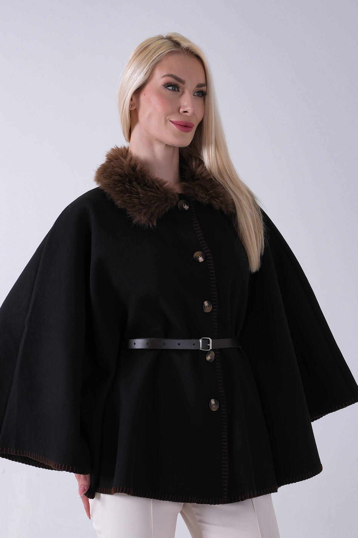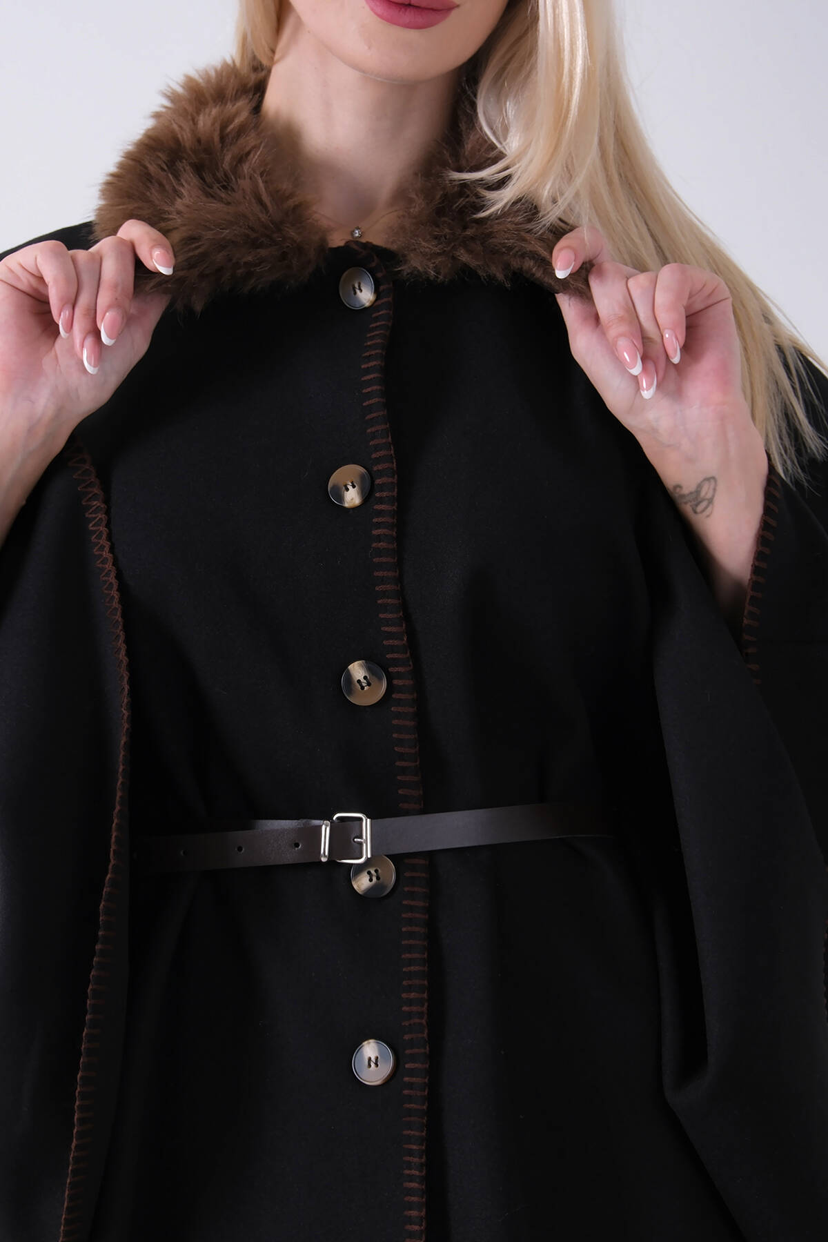 Kahve Yakası Kürklü Dikiş Detaylı Kemerli Panço 47122731.05