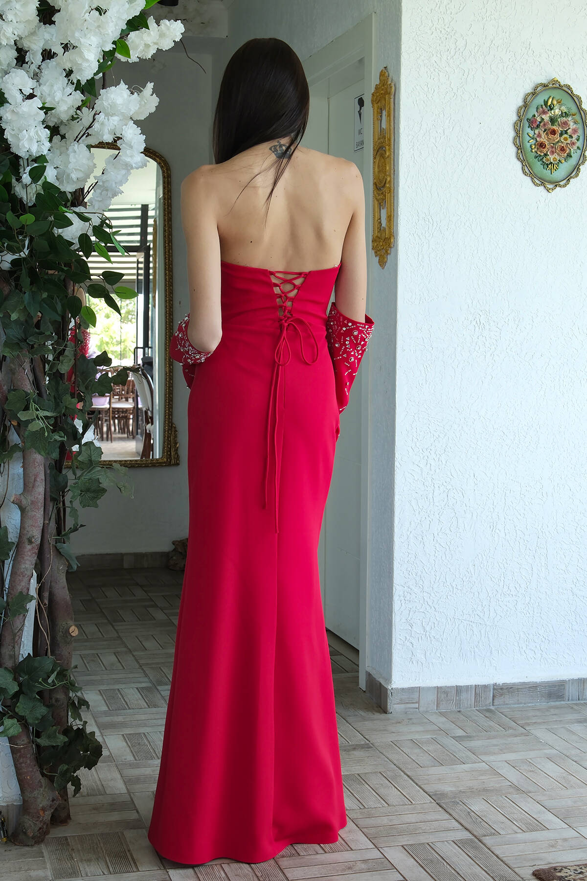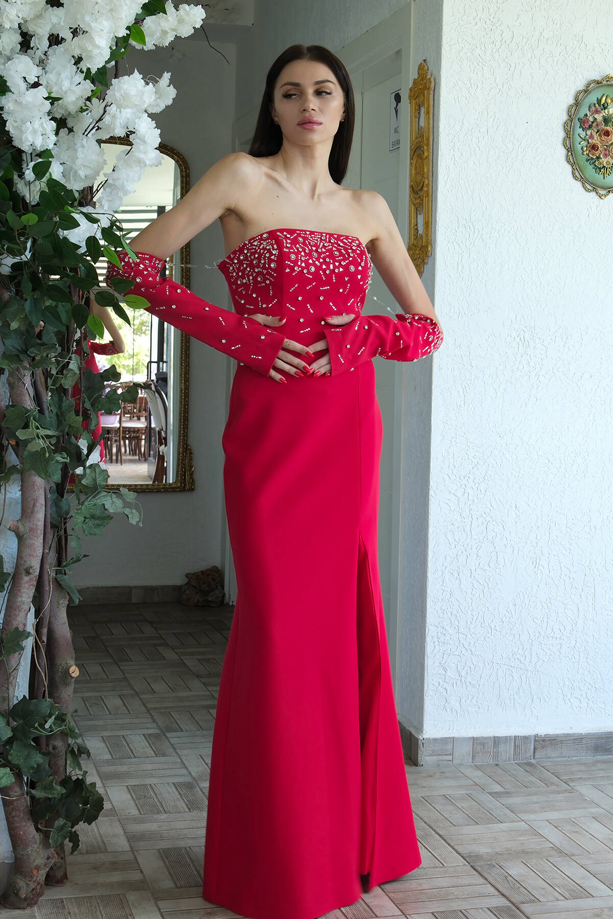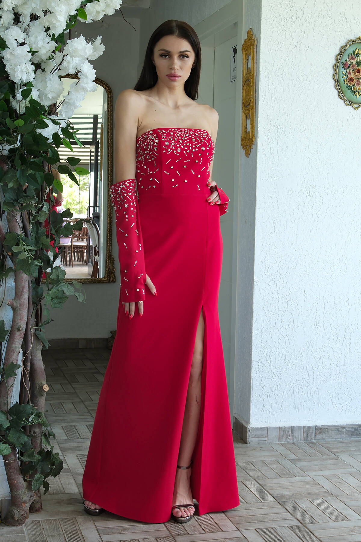 Kırmızı Double Krep Straplez Kol ve Üst Taş Detaylı Abiye 1302305.08