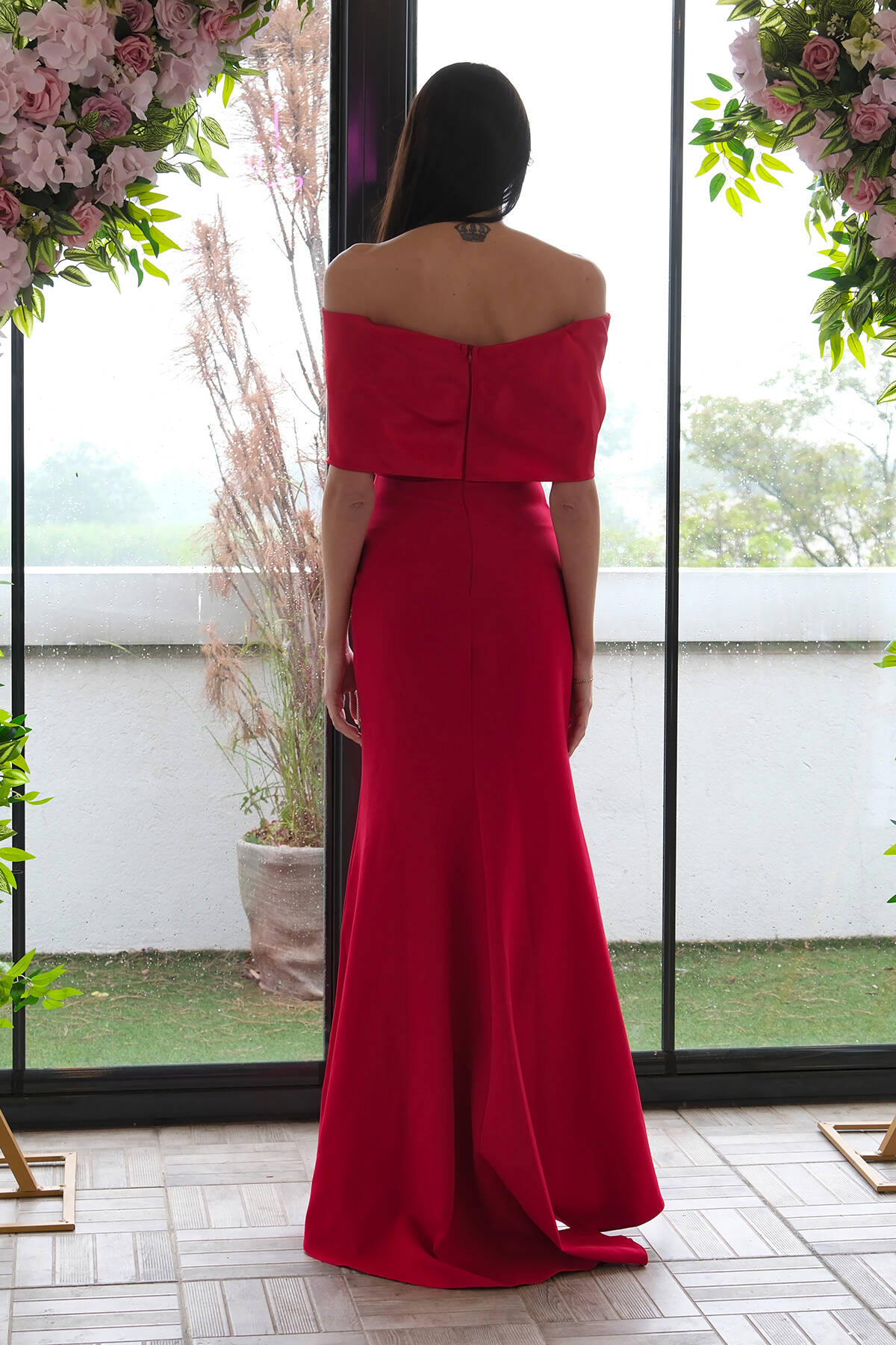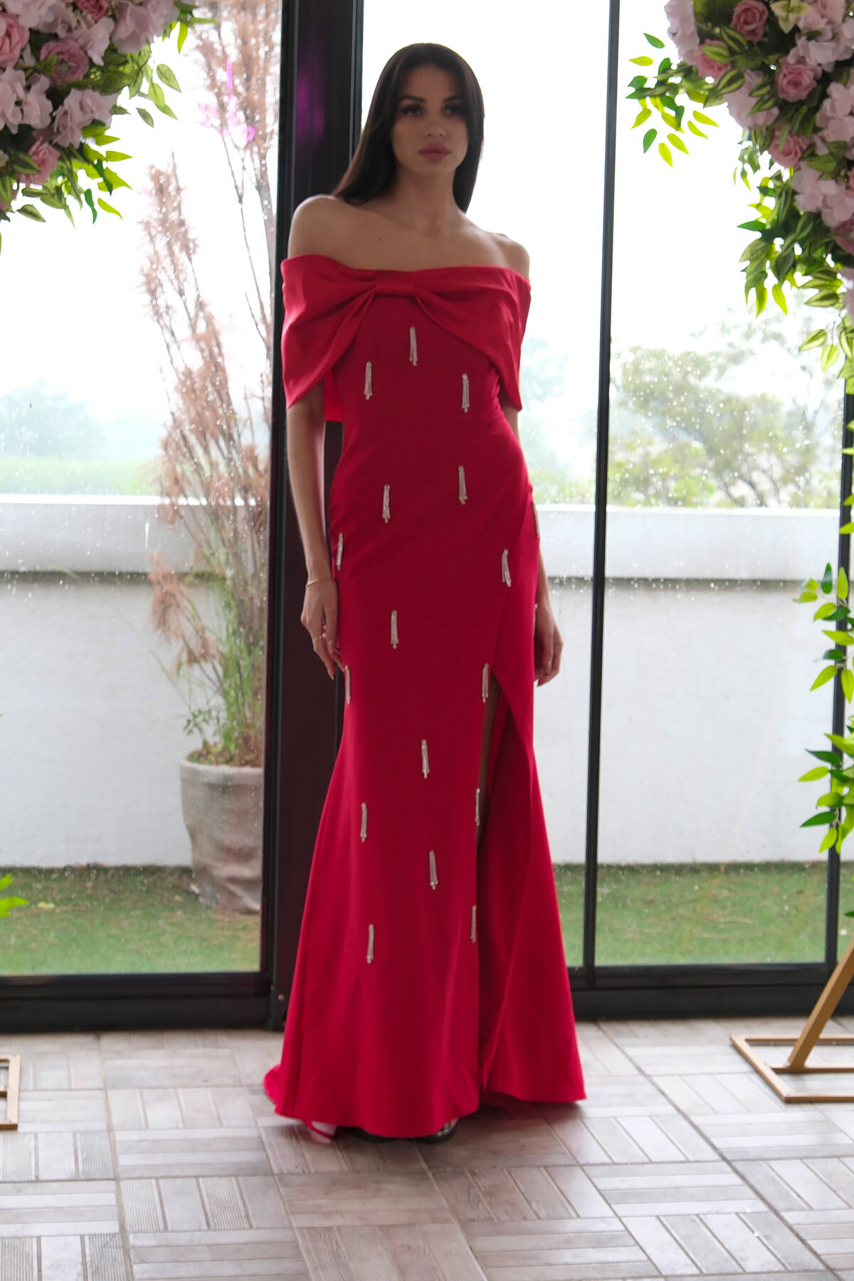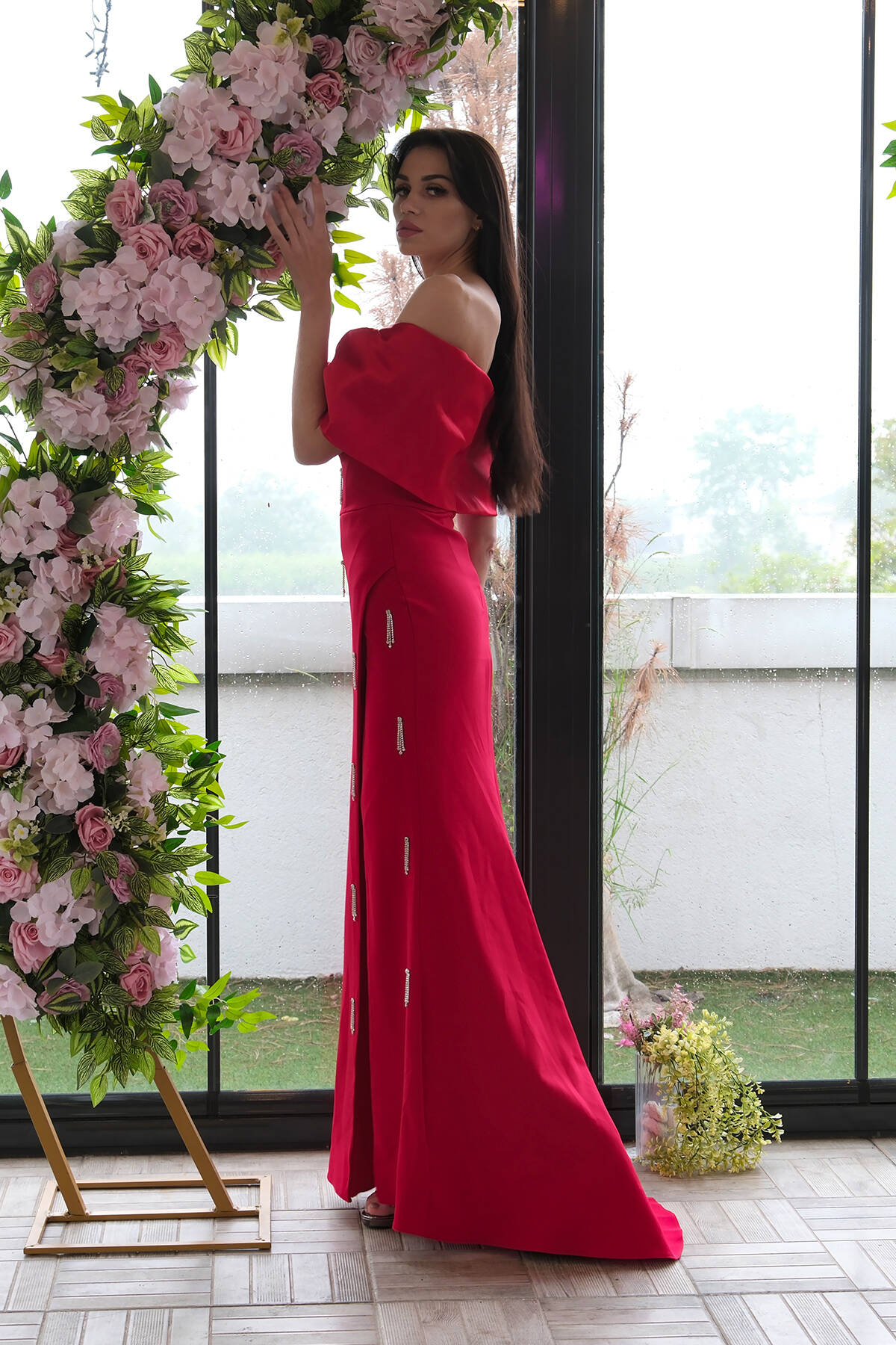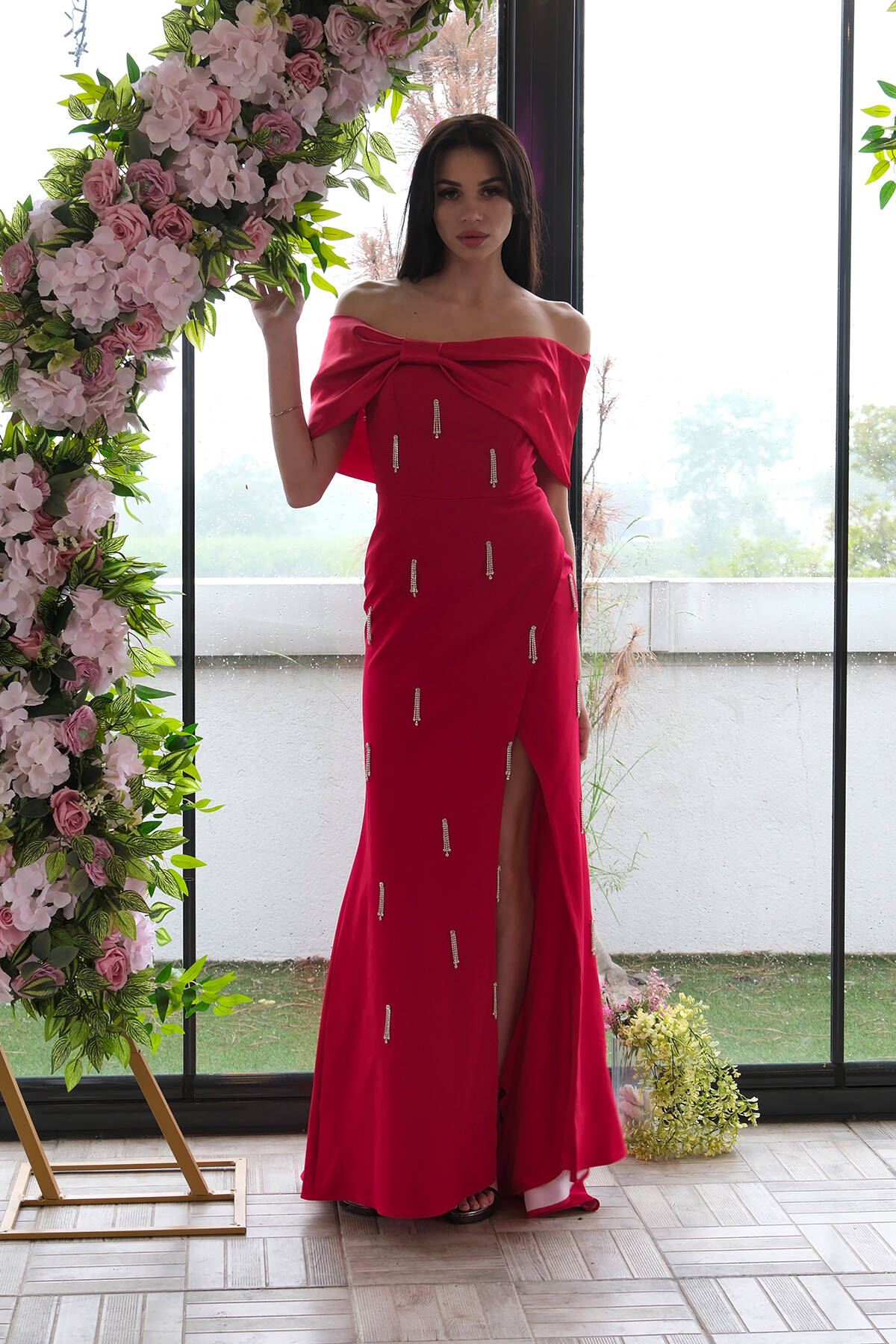 Kırmızı Fiyonk Detaylı Straplez Taş İşlemeli Abiye 9705564.08
