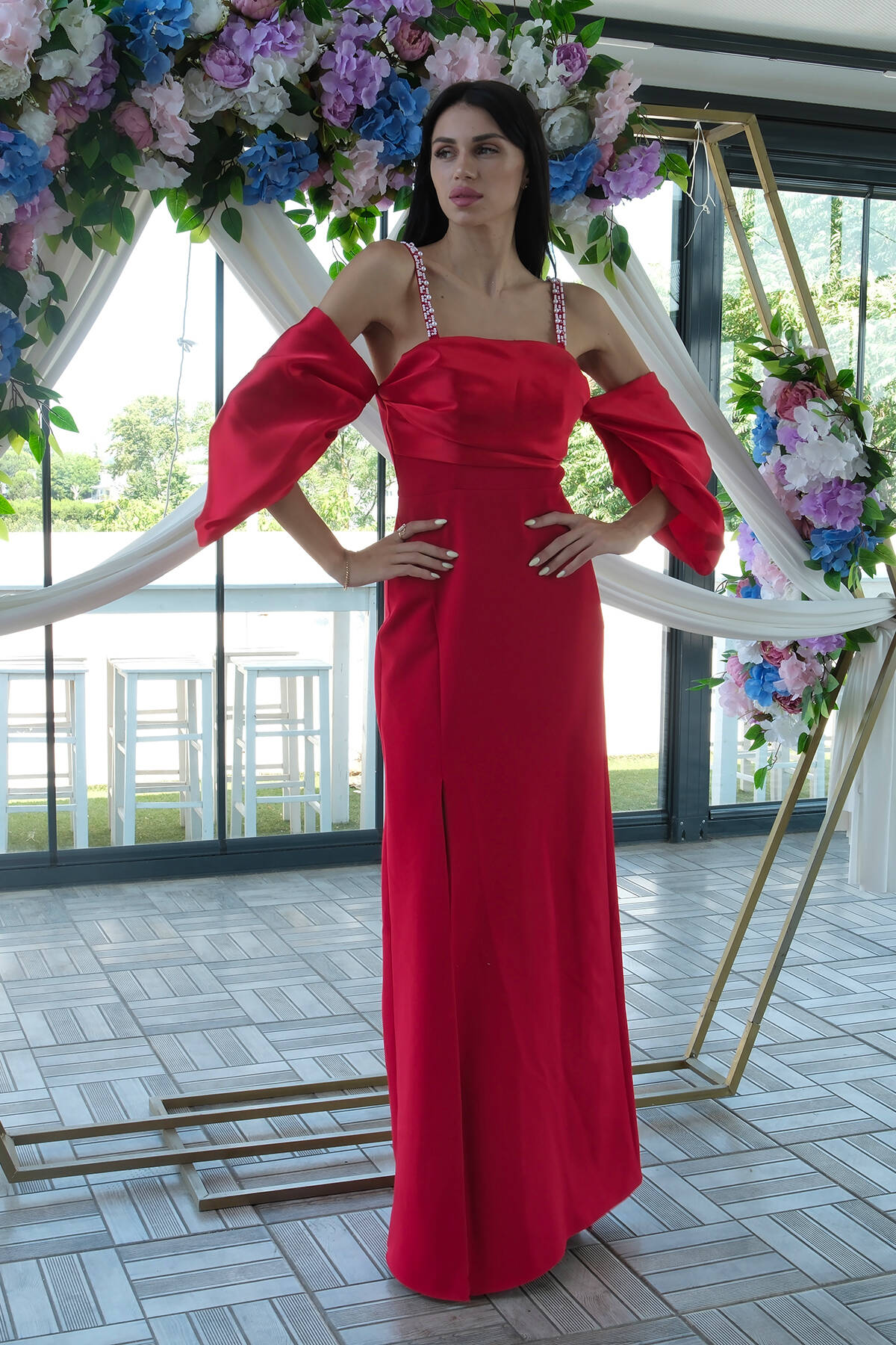 Kırmızı Kolları Şifon Yırtmaçlı Abiye 9705139.08