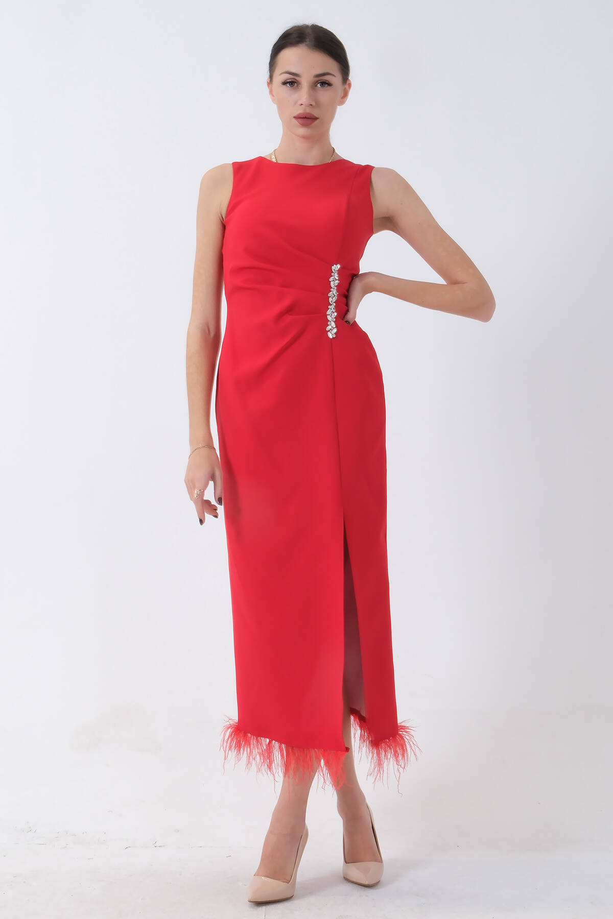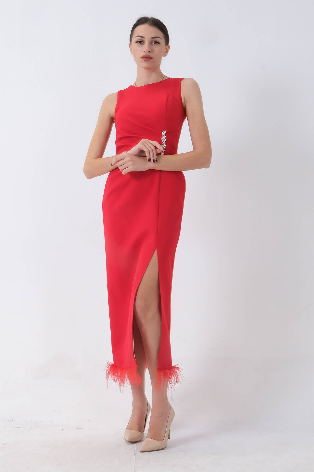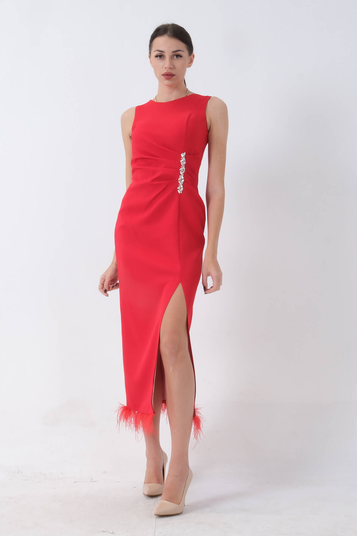 Kırmızı Önü Taş Detaylı Yırtmaçlı Tüy Detaylı Abiye 9705402.08